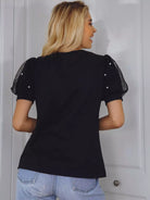 Women - Pearls Beaded Mesh Puff Sleeve Top