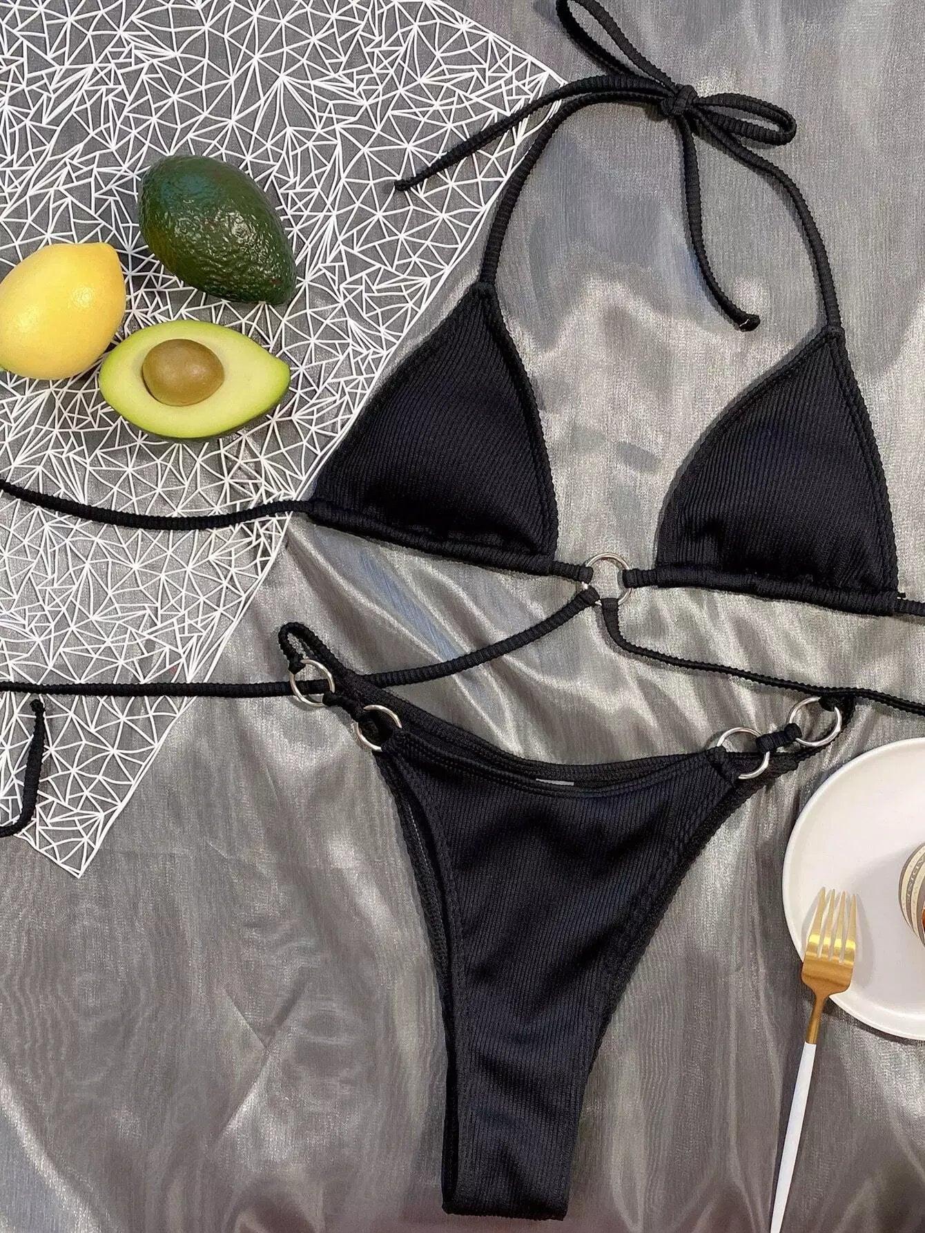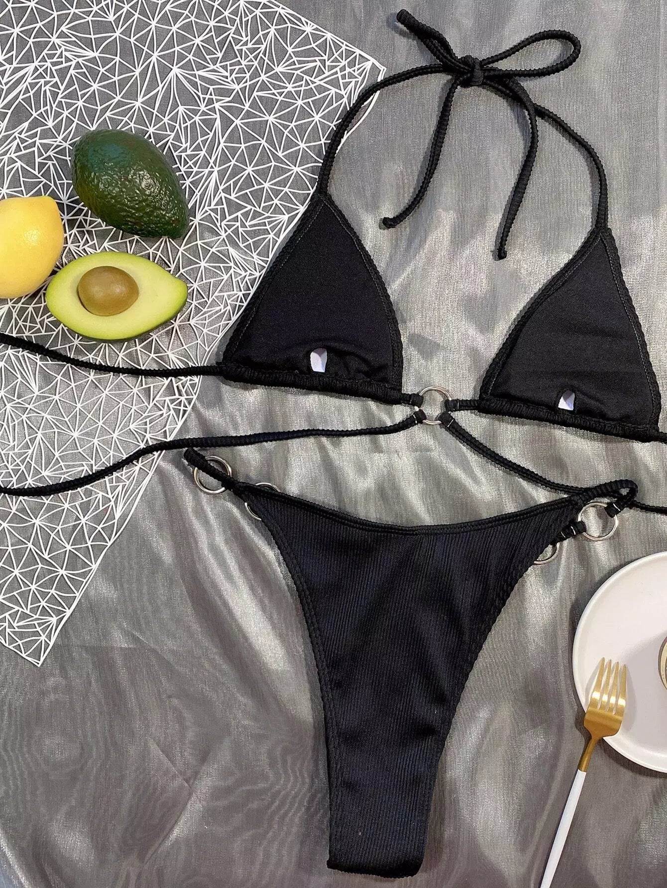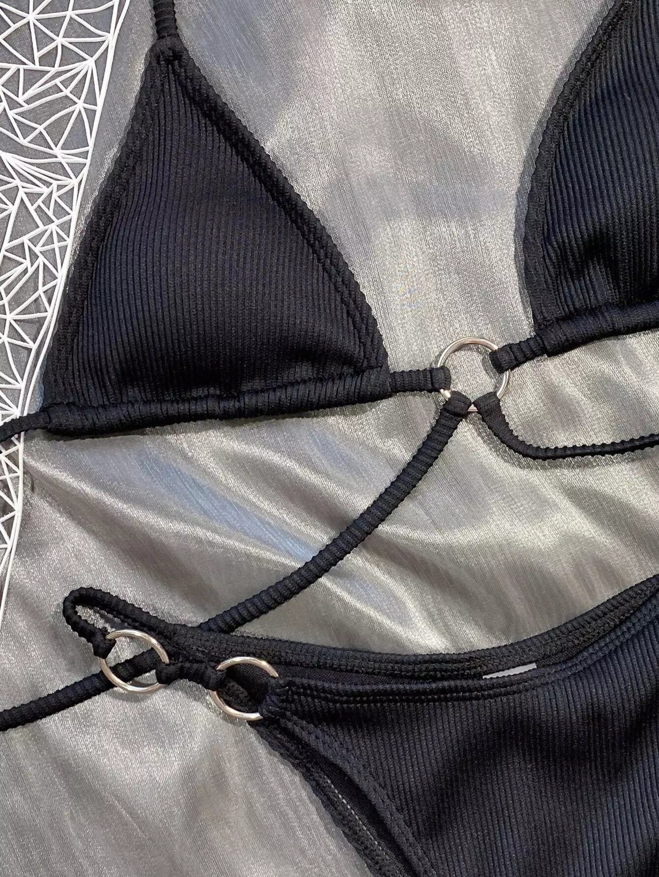 Rib Ring Linked Micro Triangle Thong Bikini Swimsuit