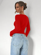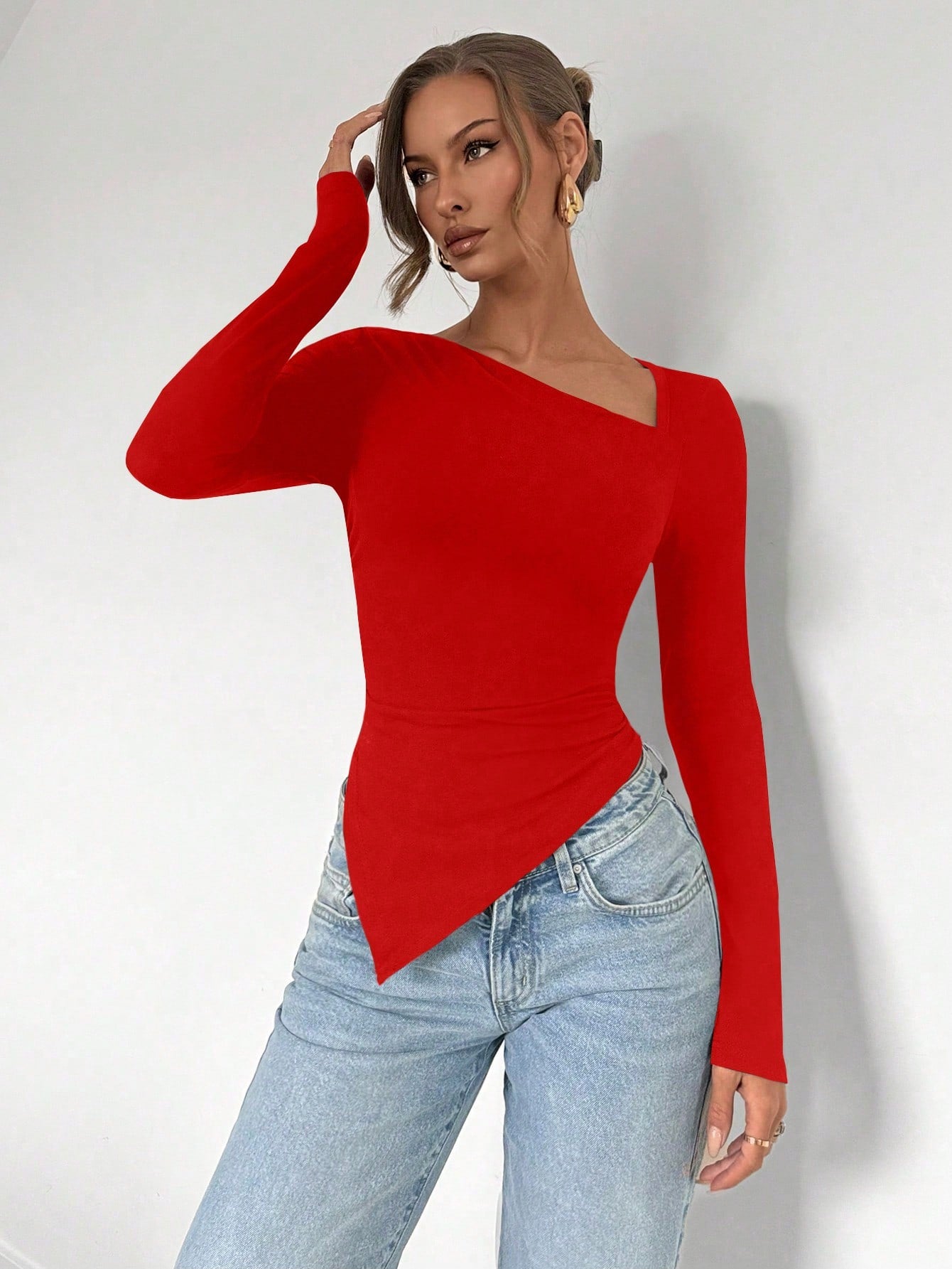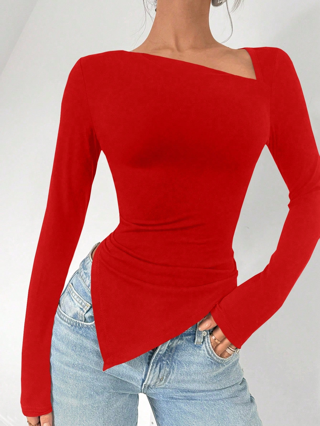 Roylia Casual Solid Color Asymmetrical Hem Fitted Long Sleeve T-Shirt