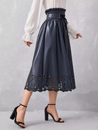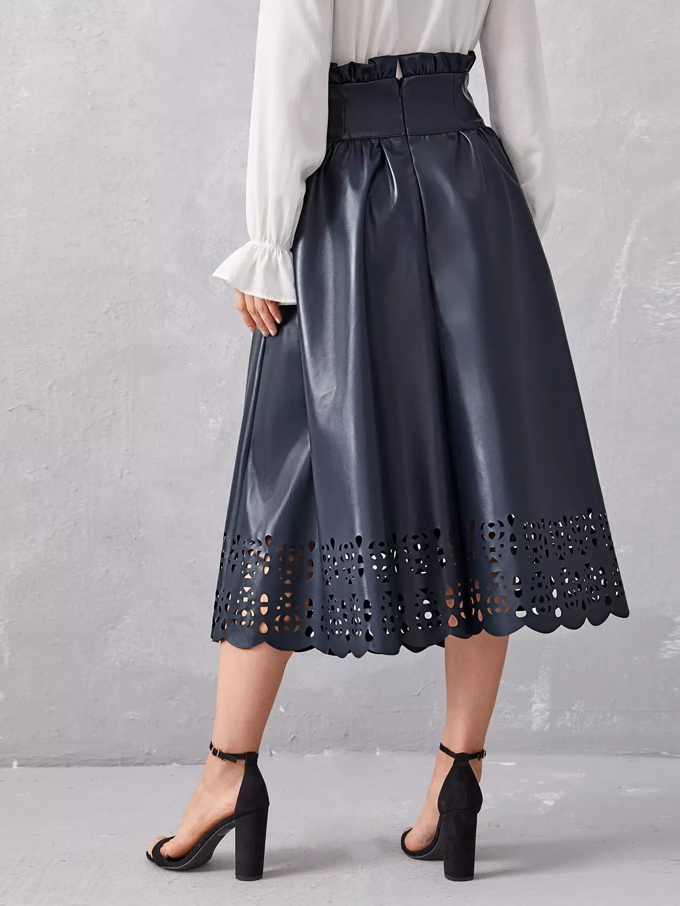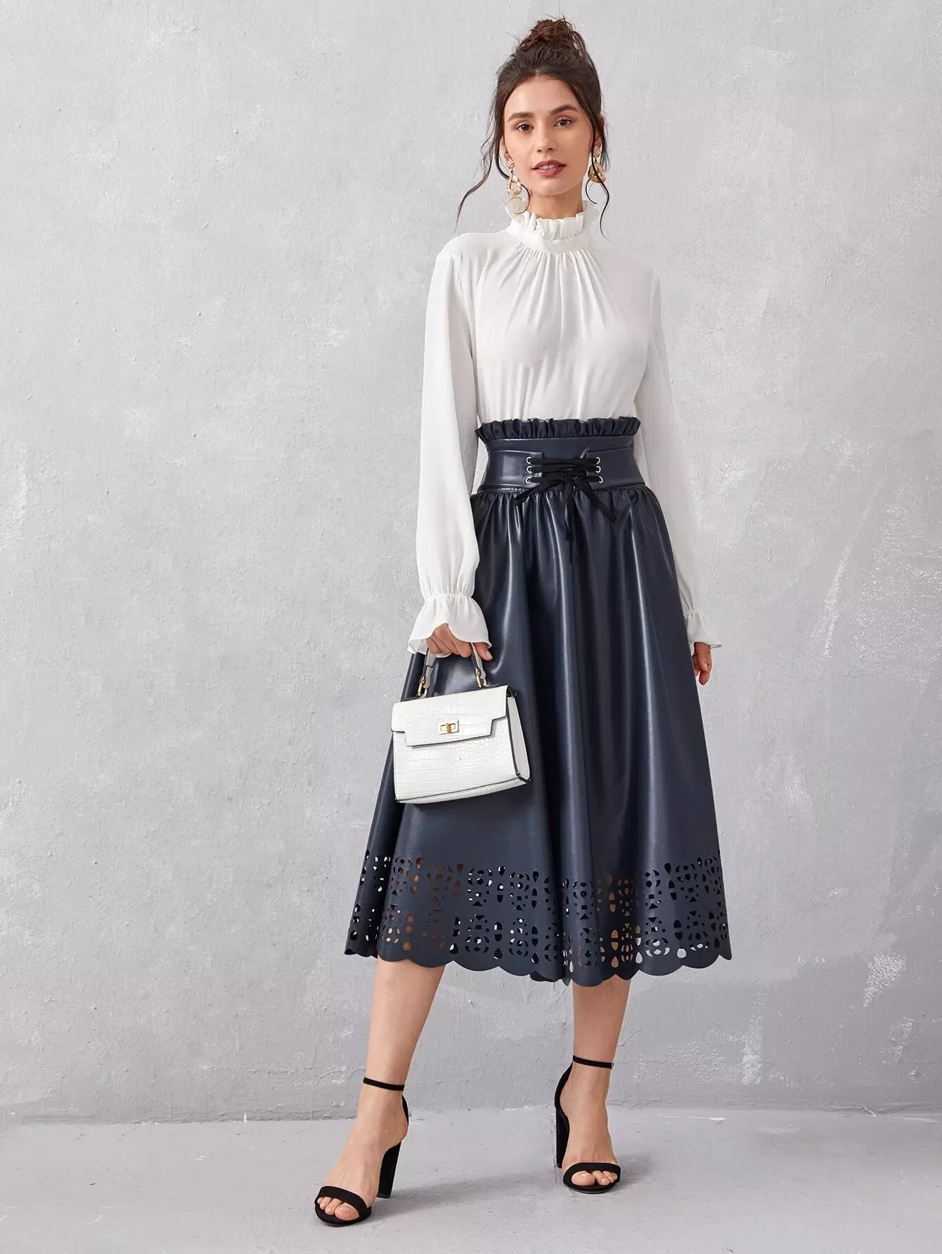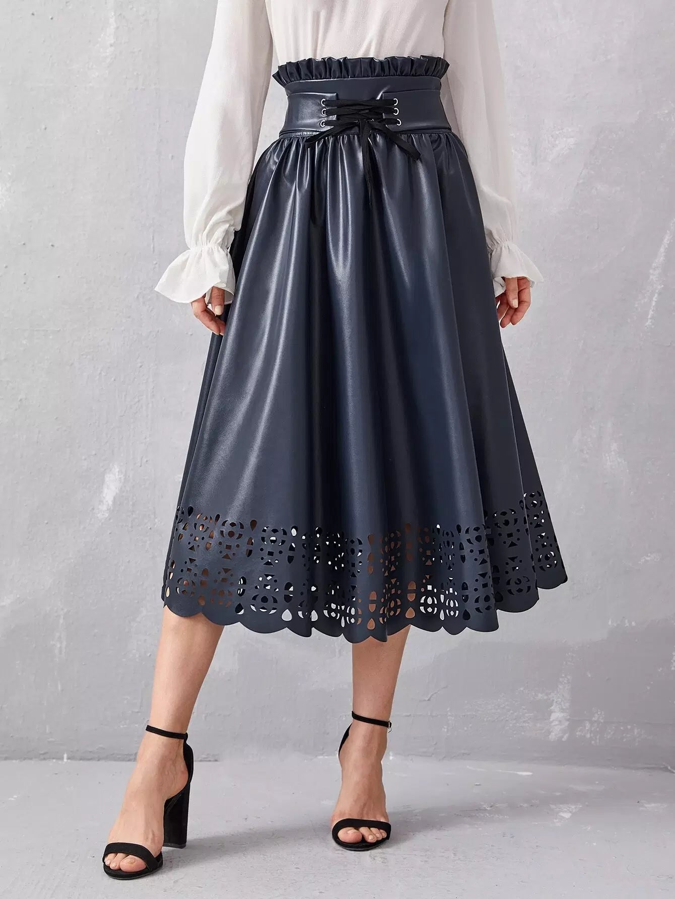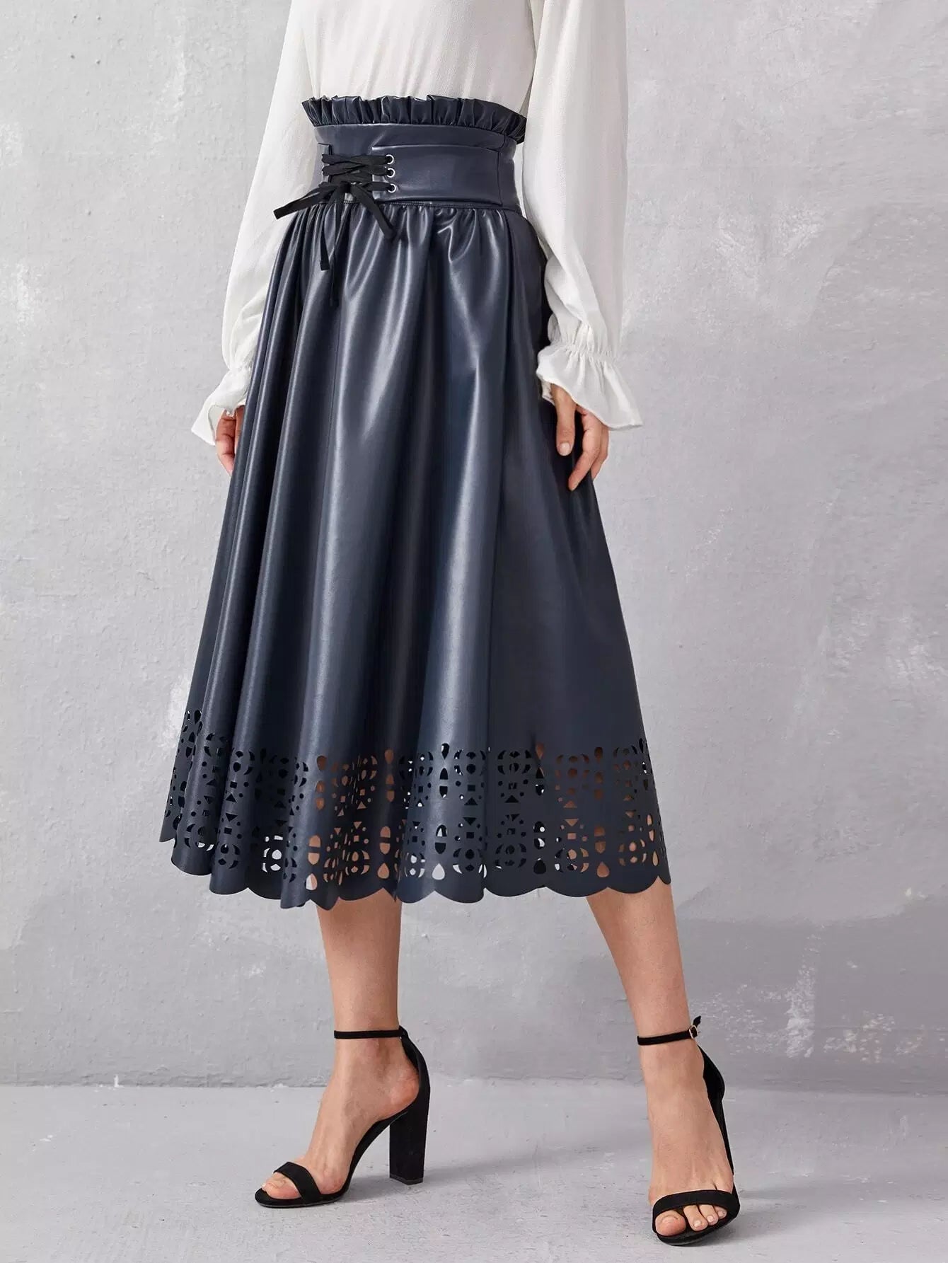 Ruffle Trim Lace Up Corset Laser Cut Hem PU Leather Skirt