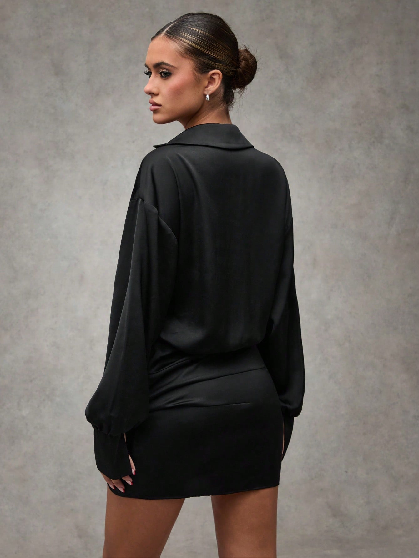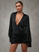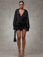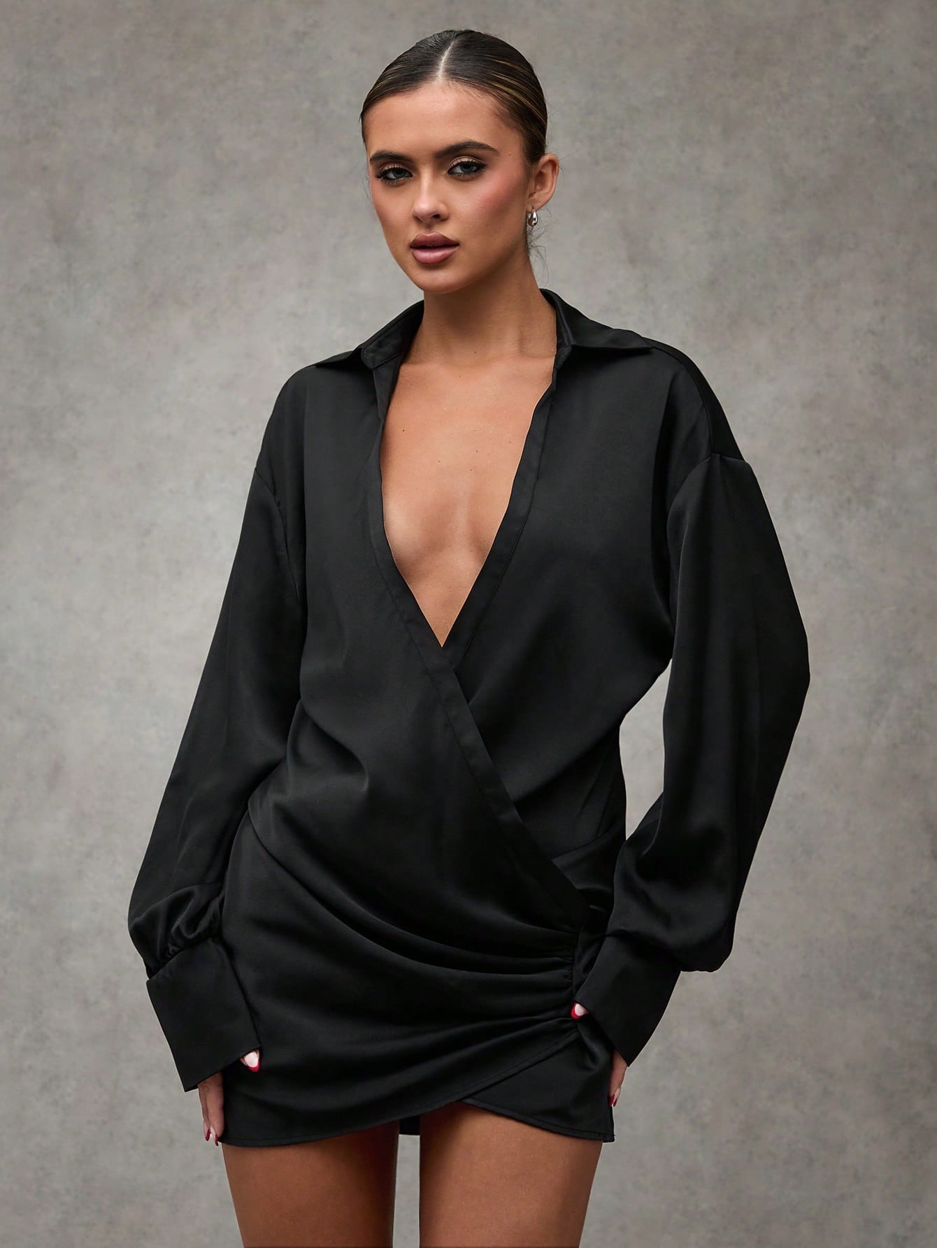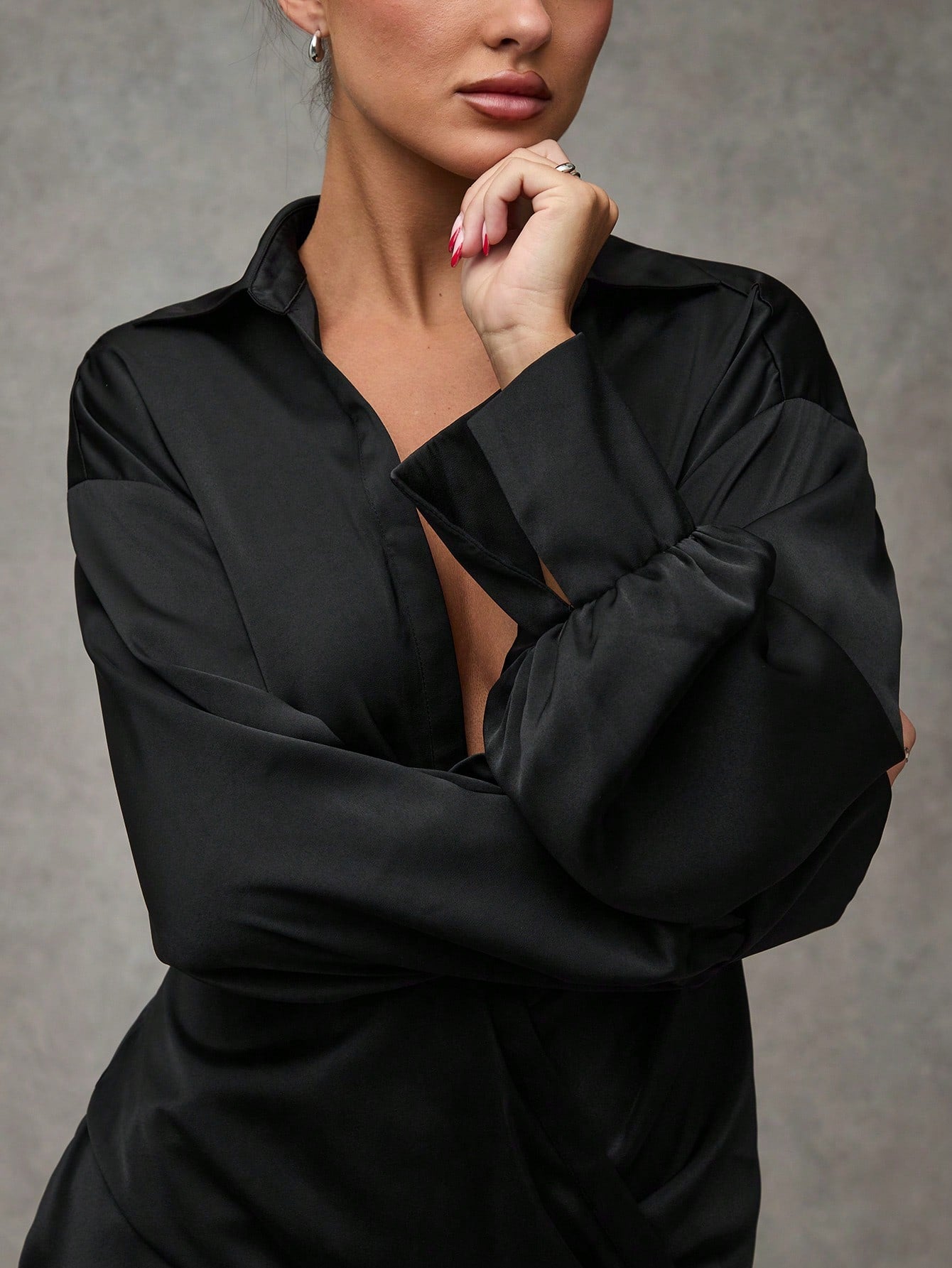 SHEIN BAE 1pc Women's Solid Color Lapel Criss-Cross Wrap Long Sleeve Dress
