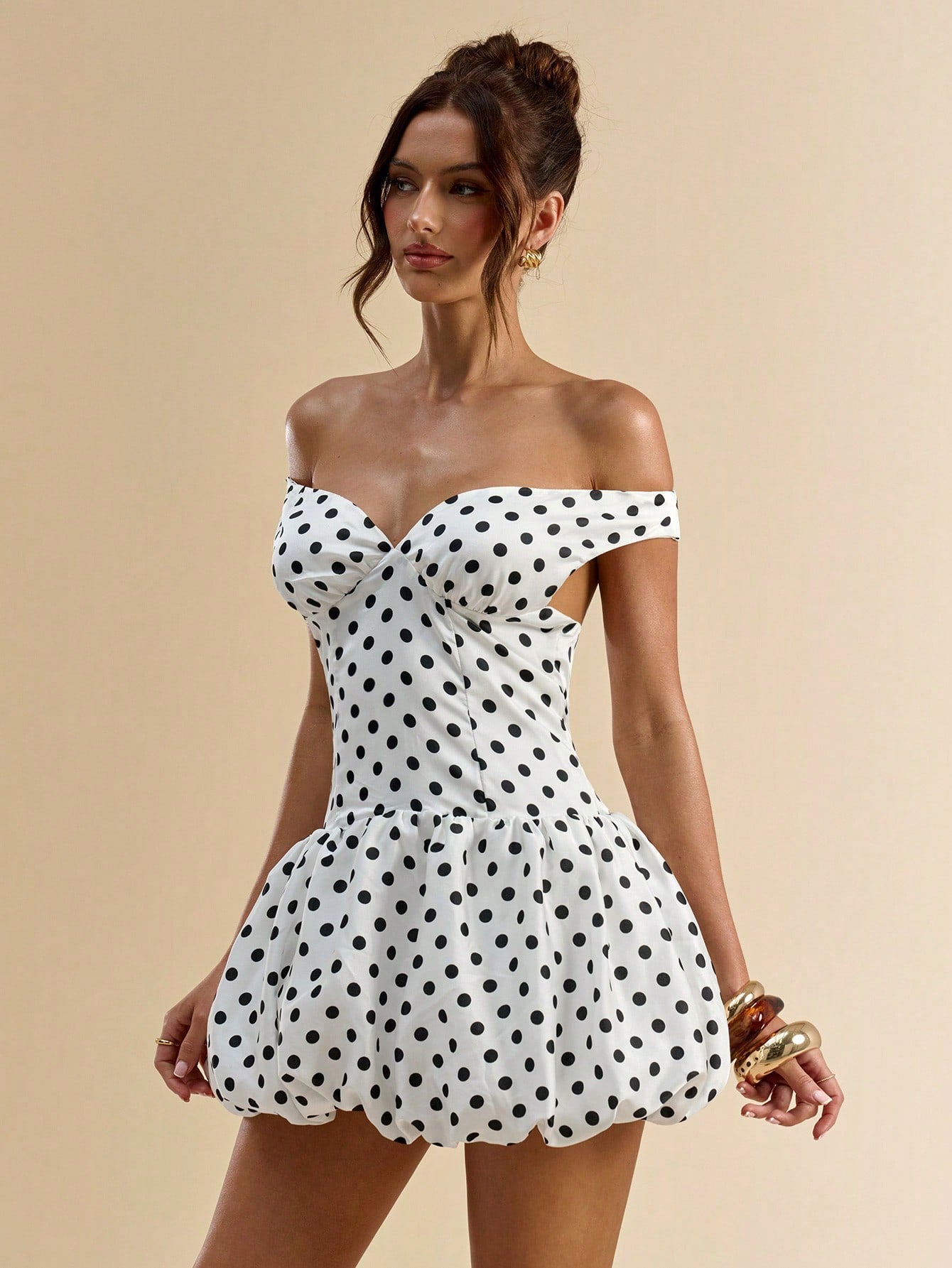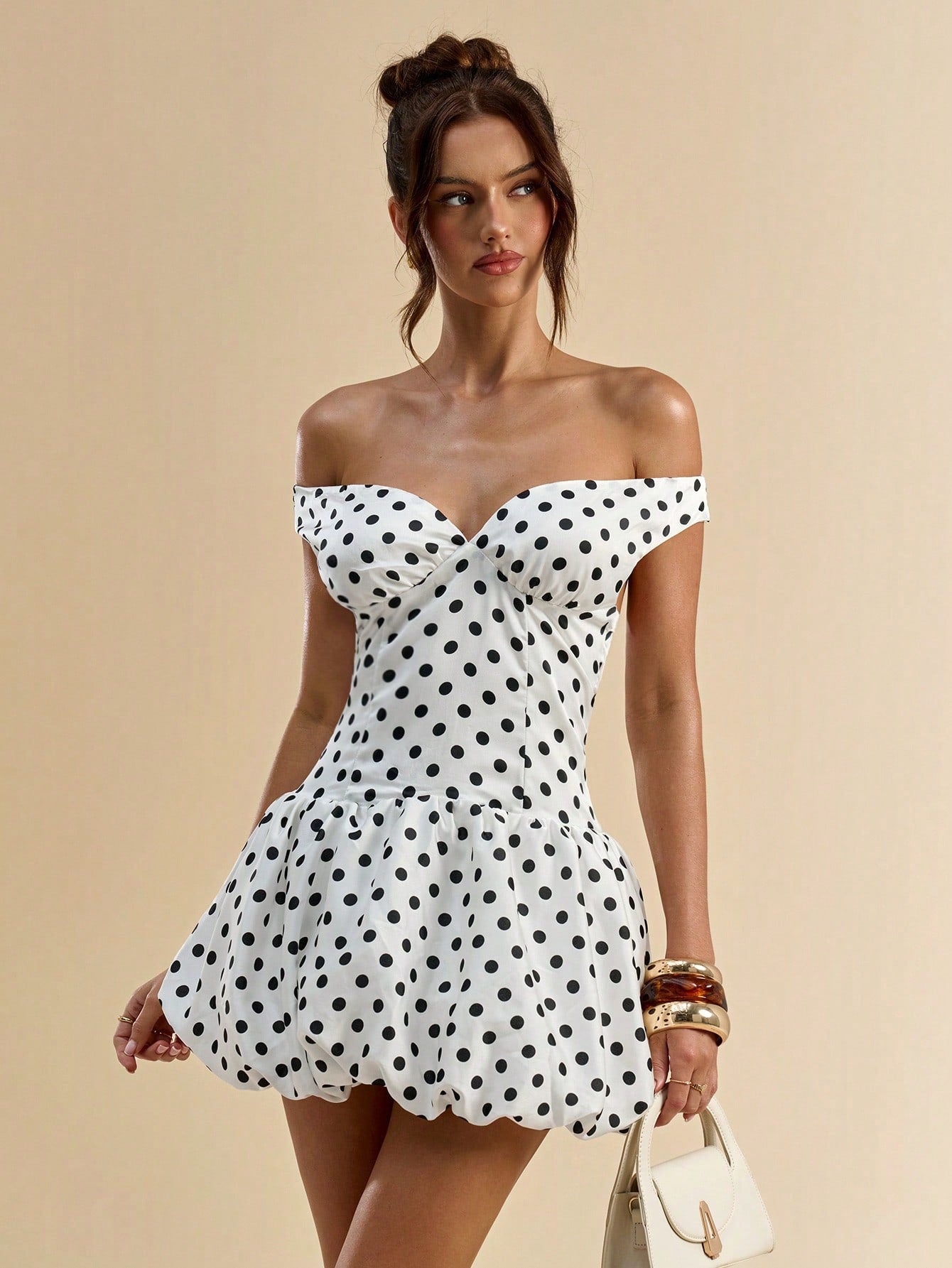 SHEIN BAE Summer Women's Black And White Polka Dot Off-Shoulder Flat Shoulder Bubble Elegant Lady Mini Dress/Polka Dots Dress/Summer Dresses For Women/Prom Dress/Wedding Guest Dress Women/Wedding Guest Dress Women