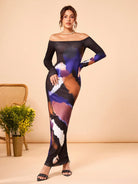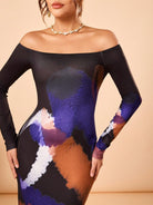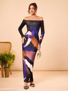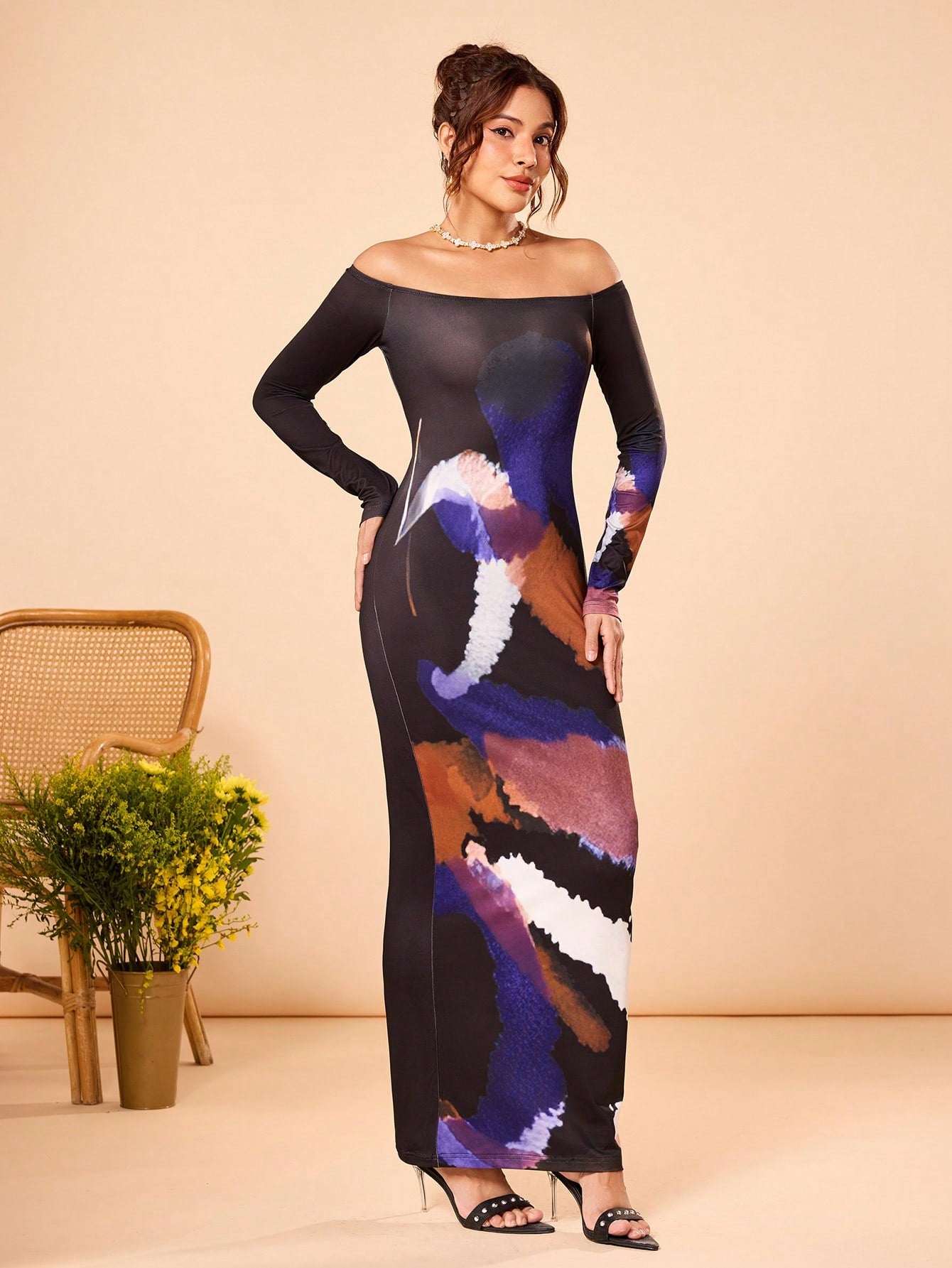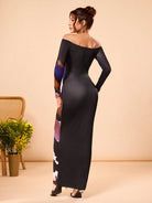 SIYA Designer Women's Black Printed Bodycon Off Shoulder Elegant Dress, Festival, Wedding, Prom Dress