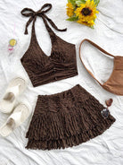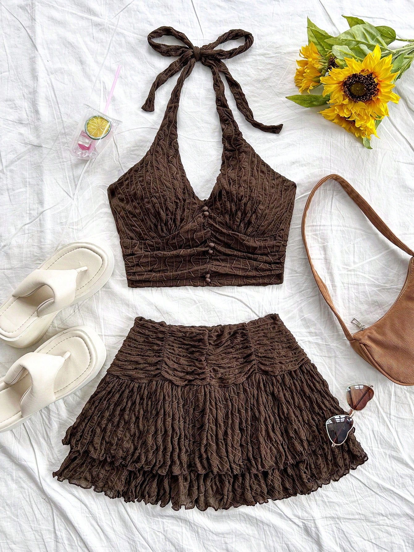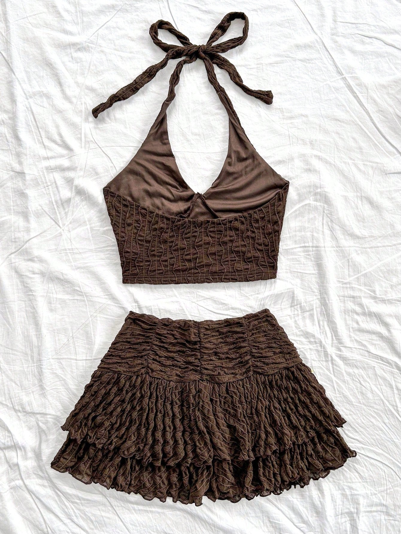 Soleia Knit Textured Fitted V-Neck Racerback Camisole Top &Ruched Tiered Hem Mini Skirt Women 2pcs Set