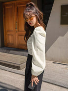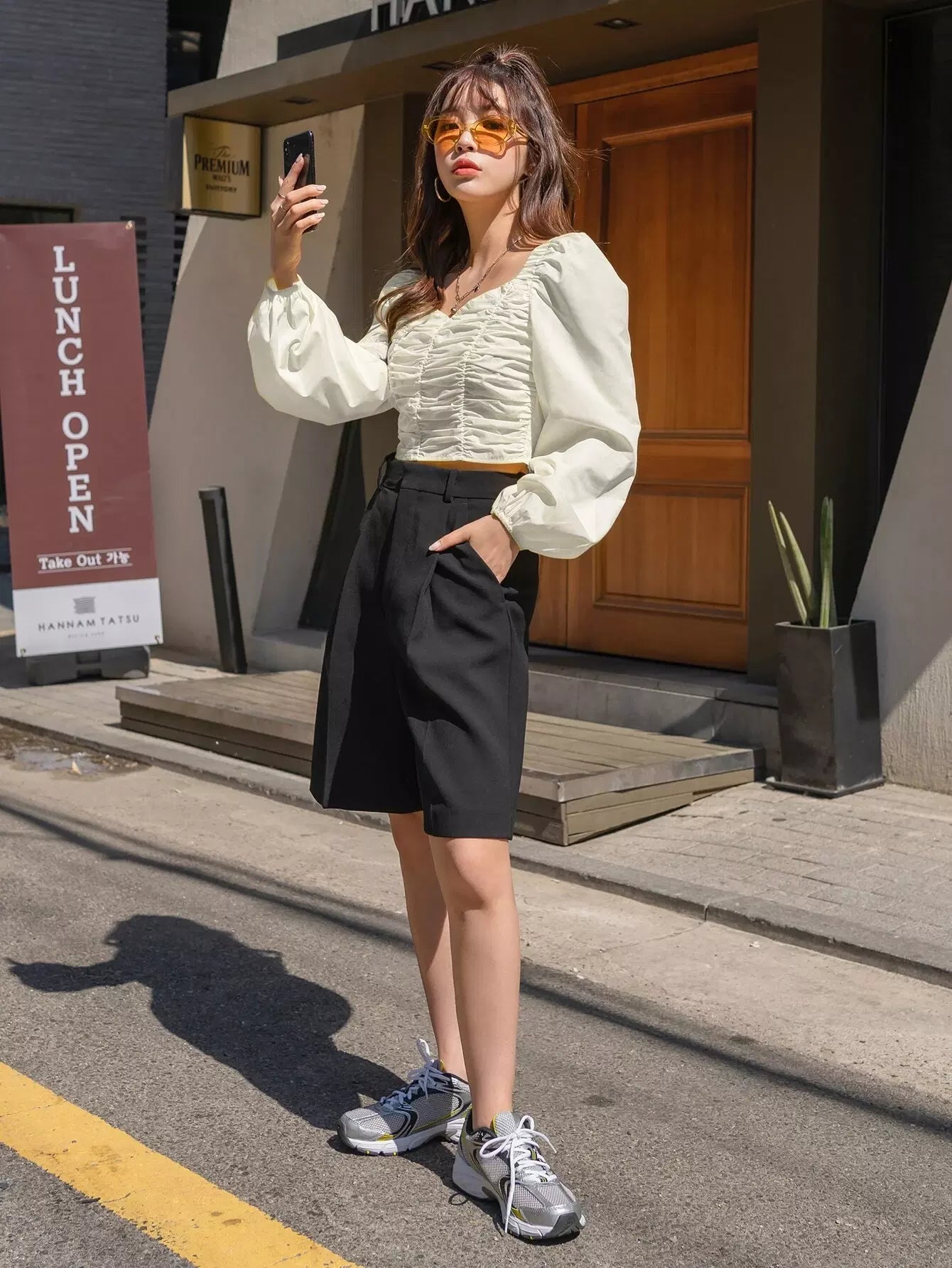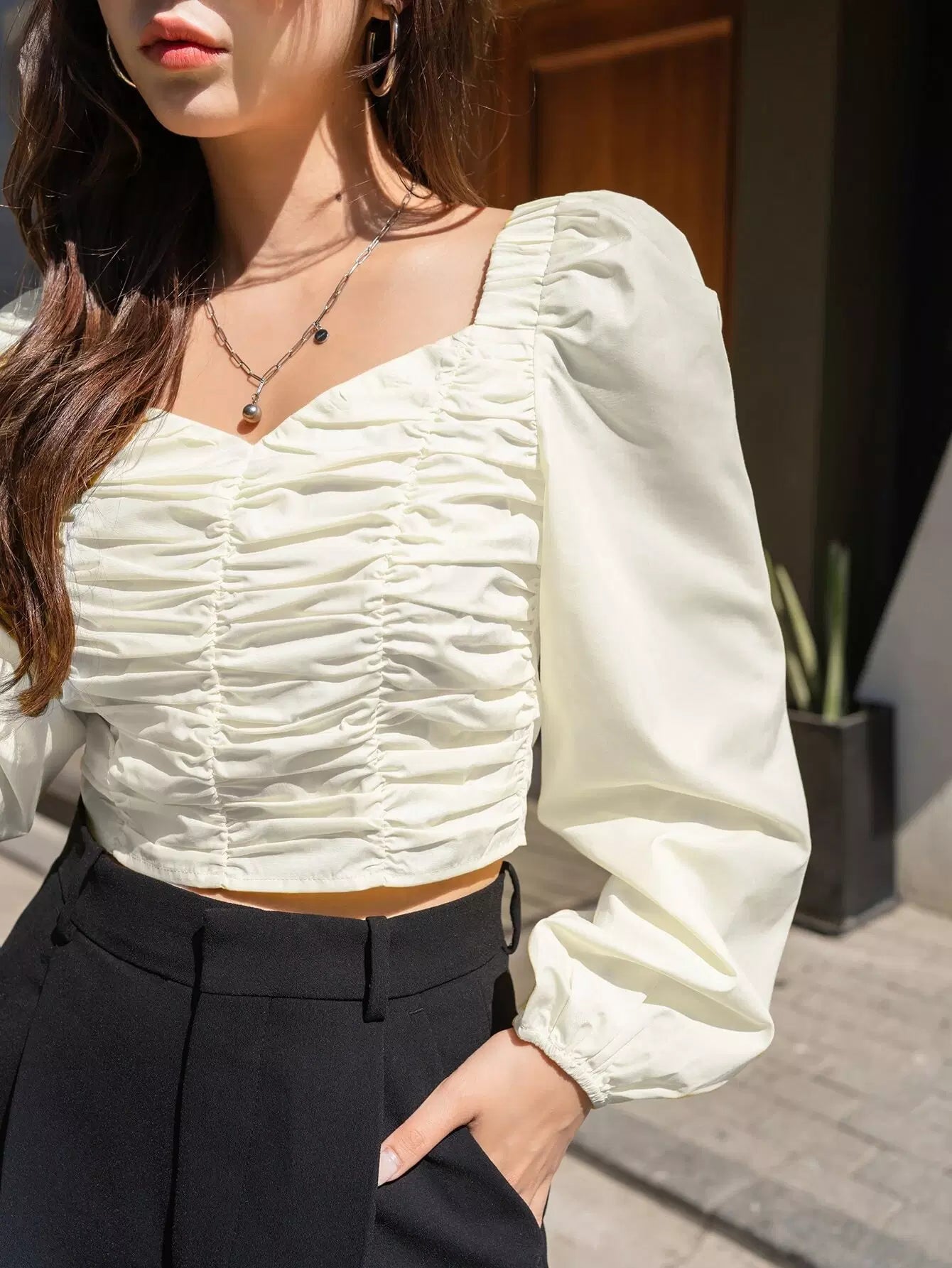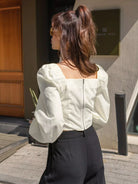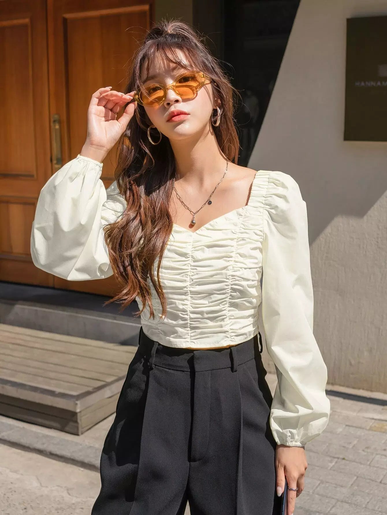 Solid Ruched Zip Up Back Bishop Sleeve Blouse