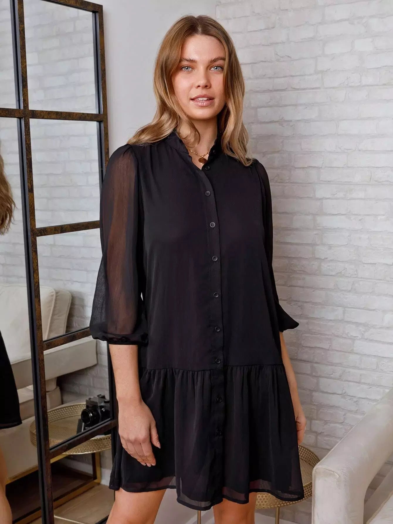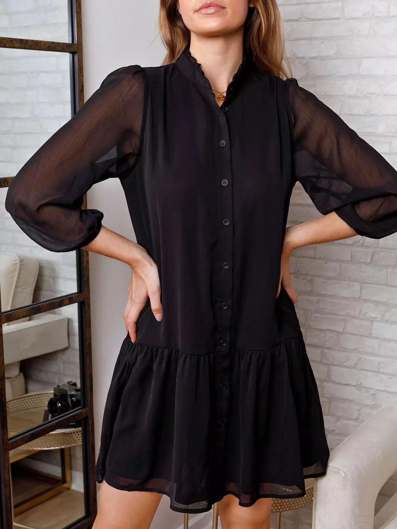 Women - Stand Collar Ruffle Hem Shirt Dress
