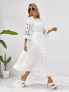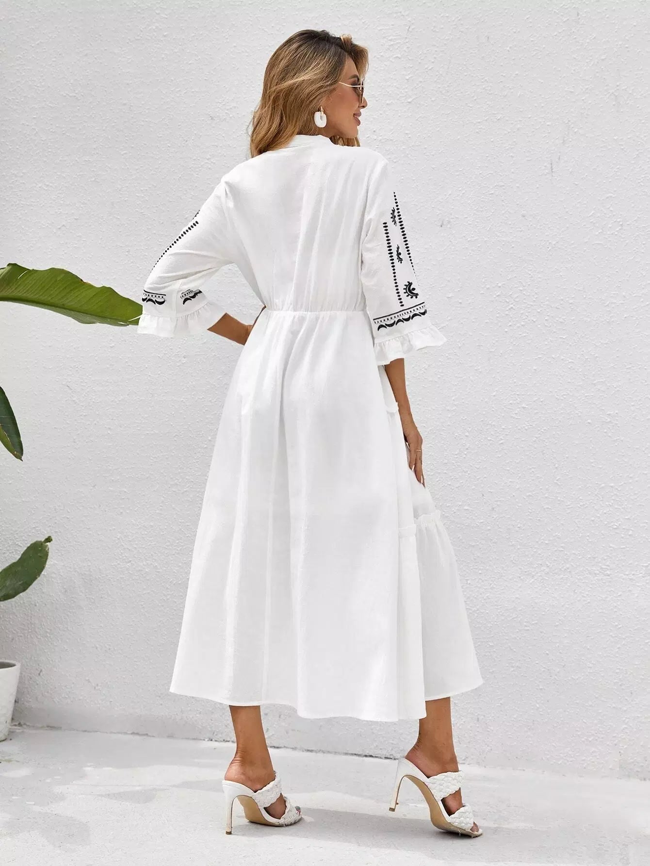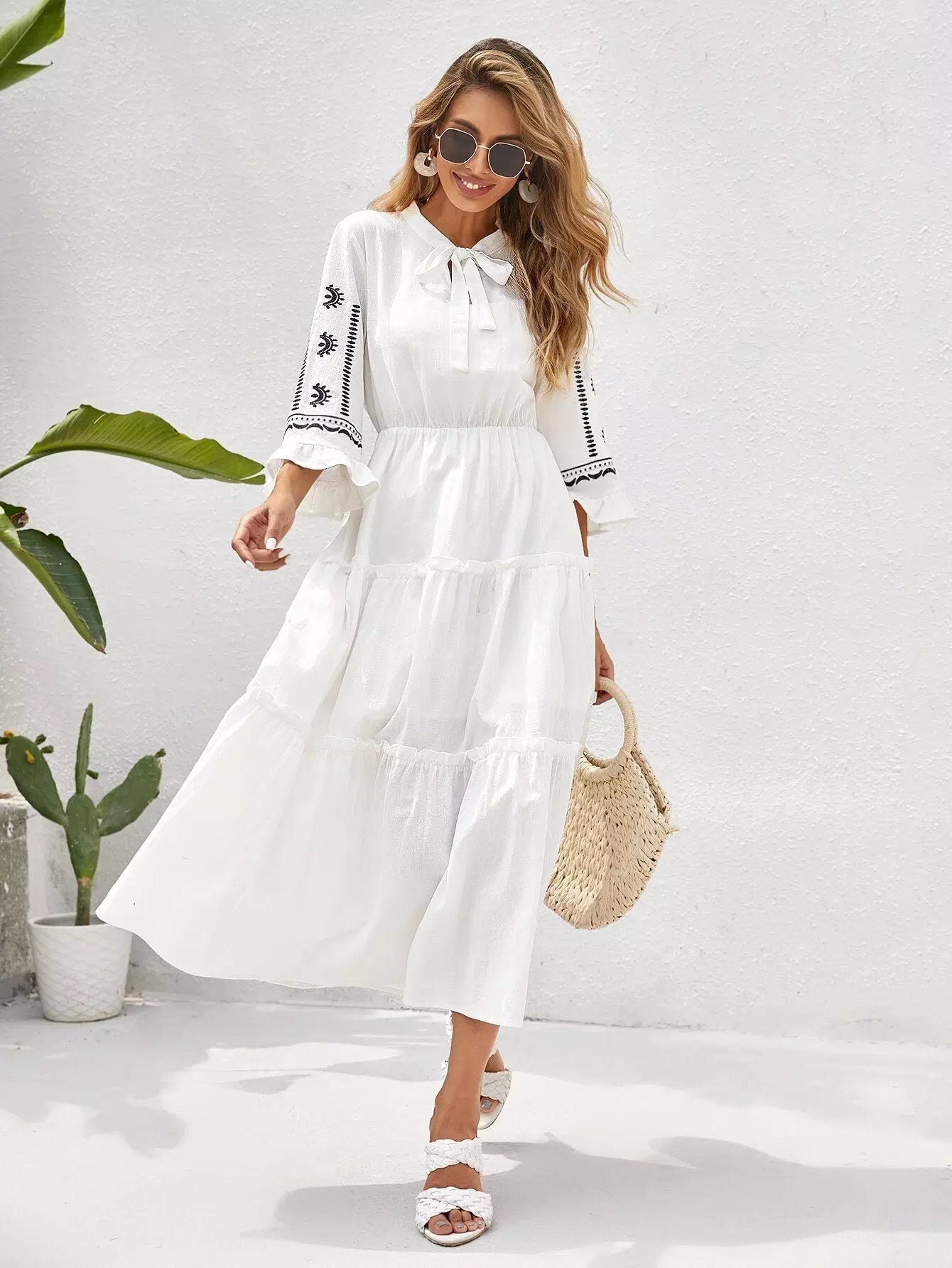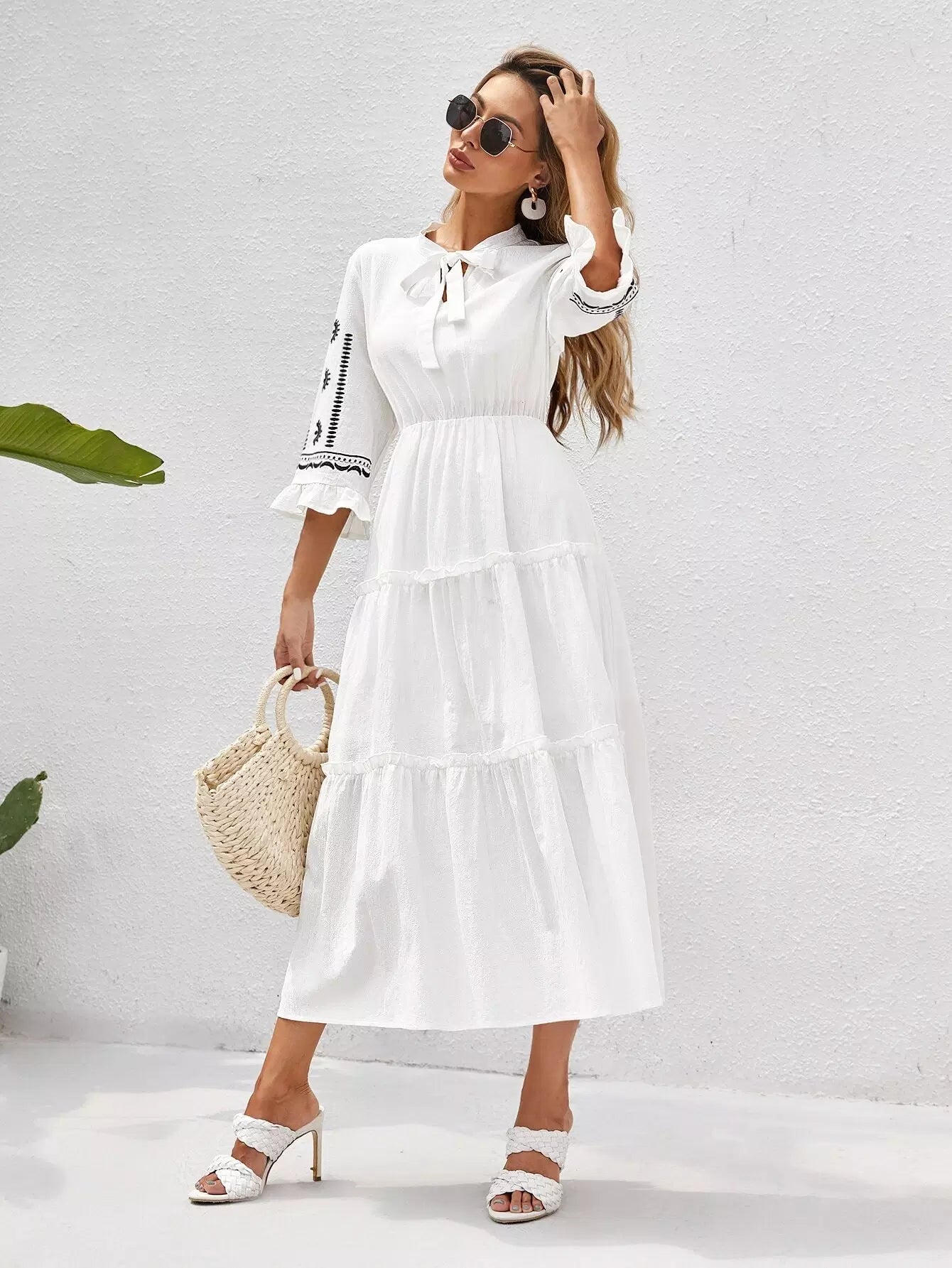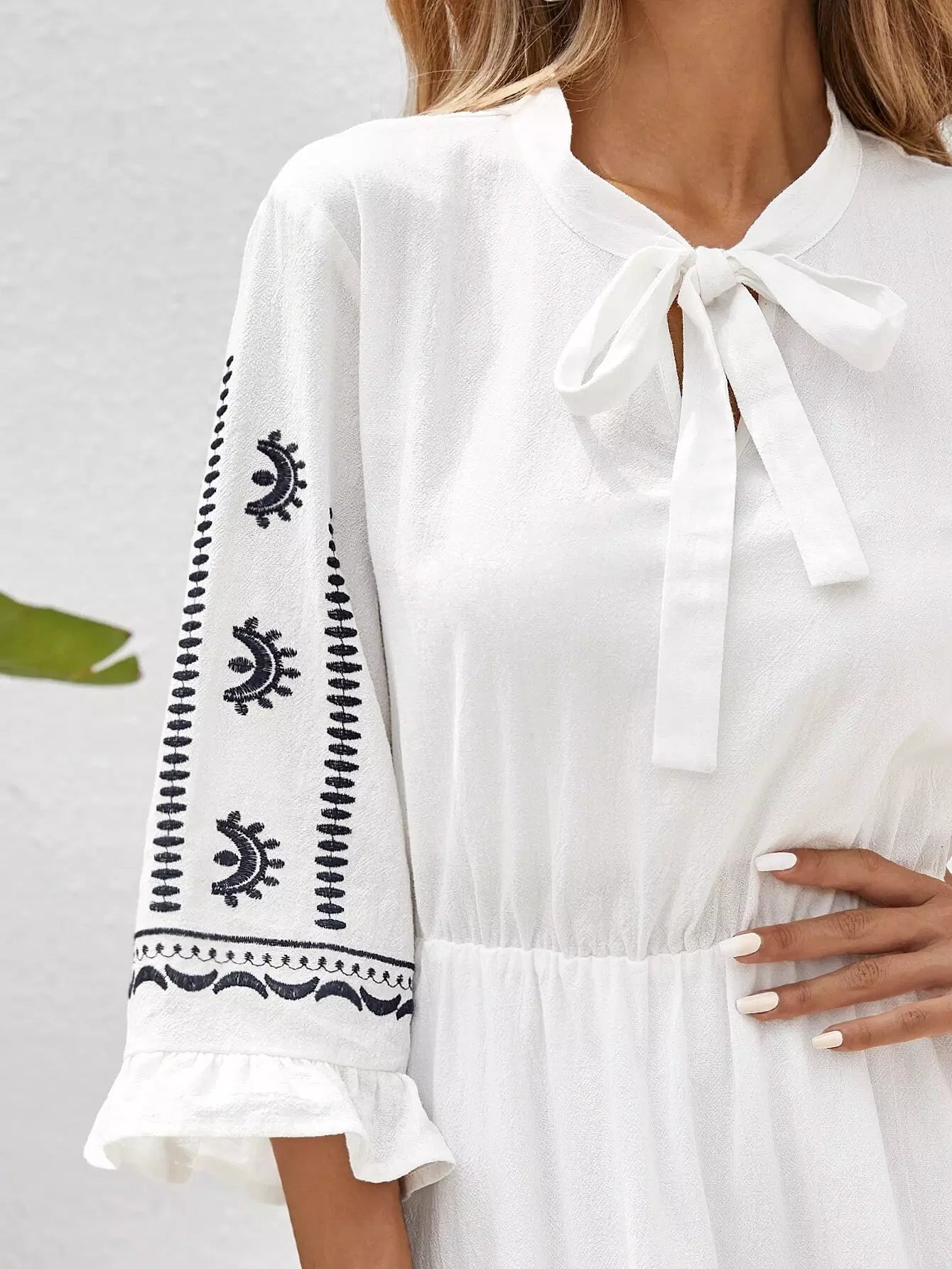 Tie Neck Embroidery Flounce Sleeve Babydoll Dress