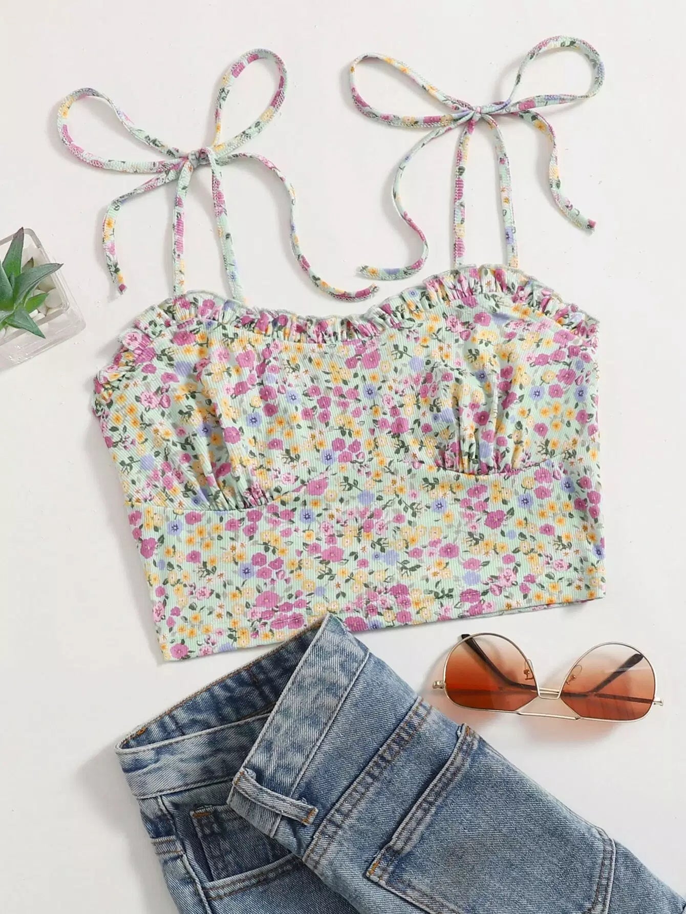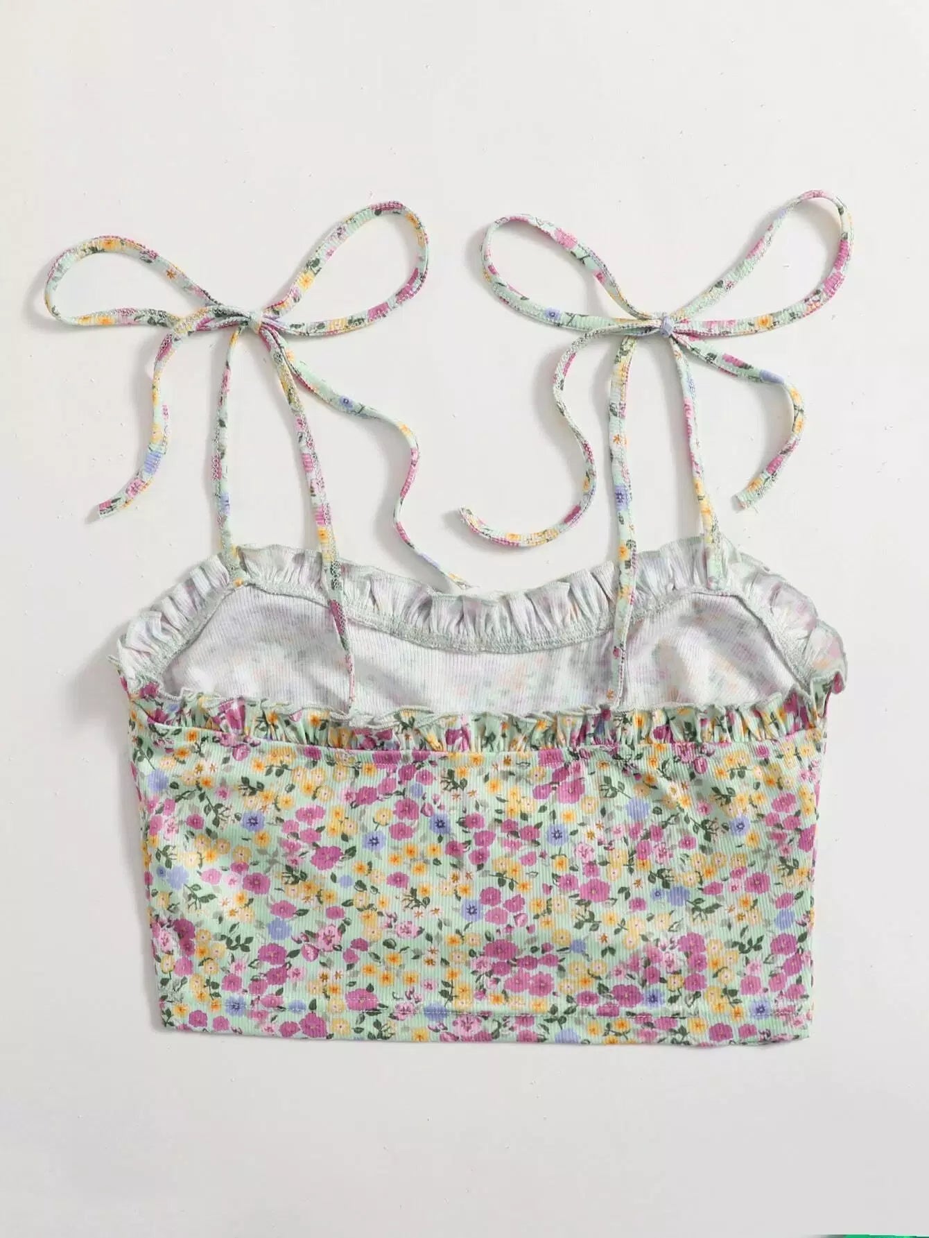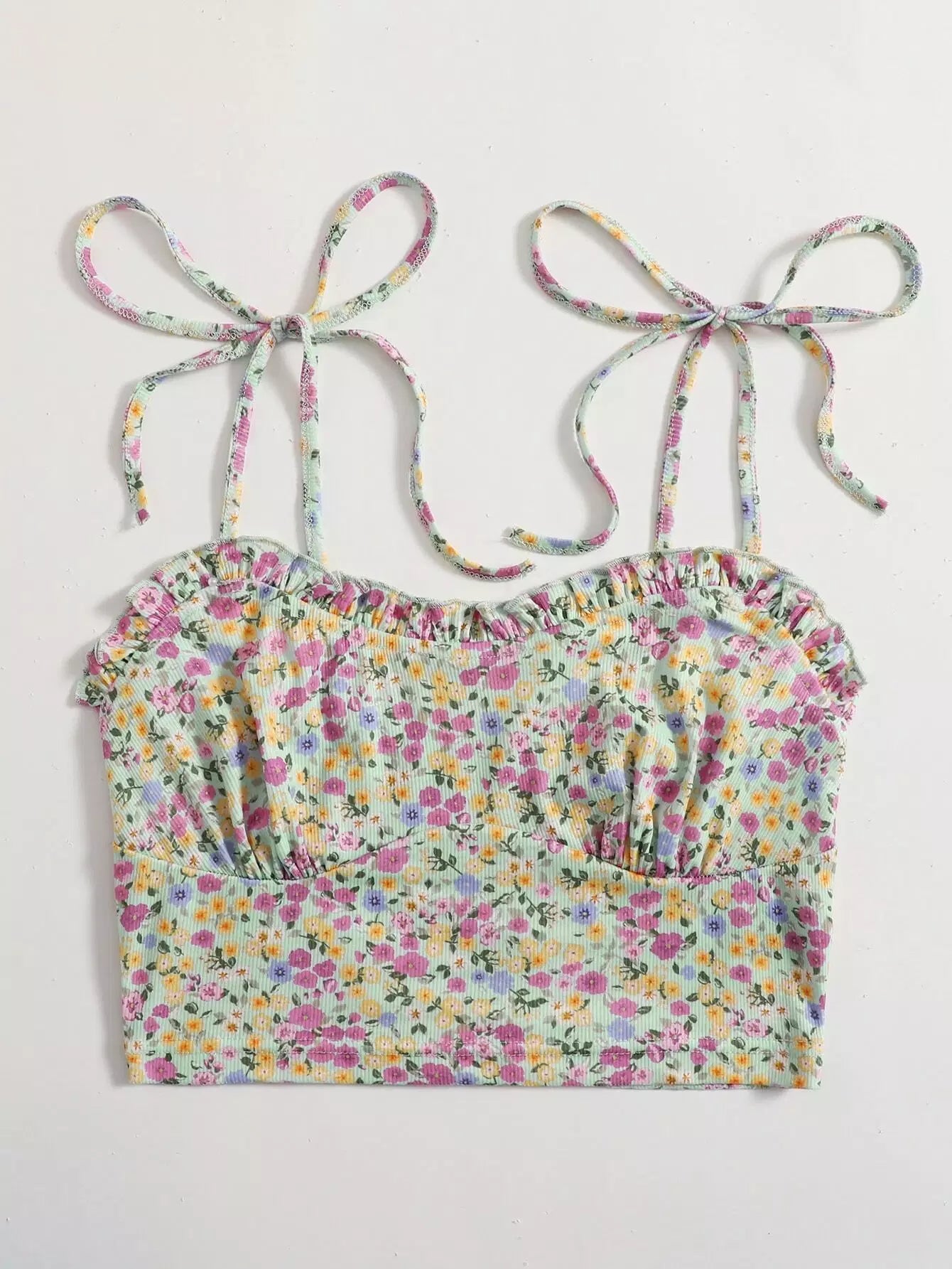 Tied Shoulder Frilled Ditsy Floral Crop Cami Top