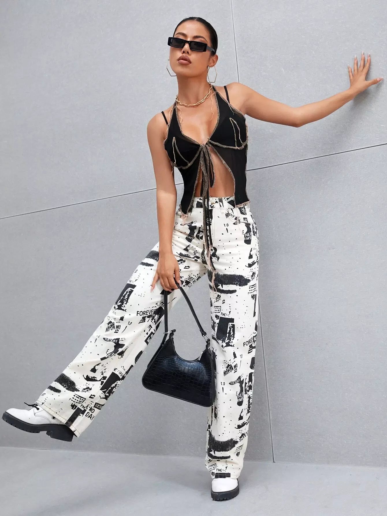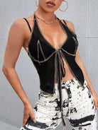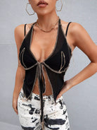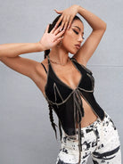 Top-stitching Knot Front Backless Mesh Halter Top Without Bra
