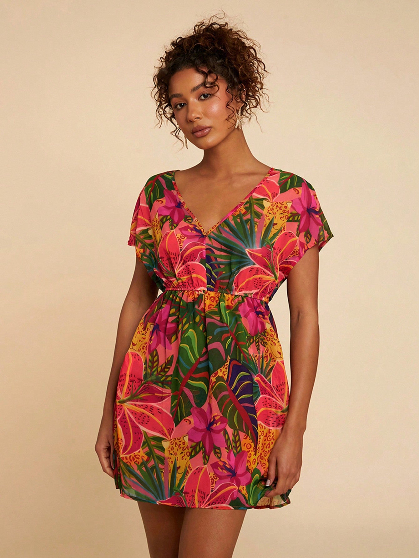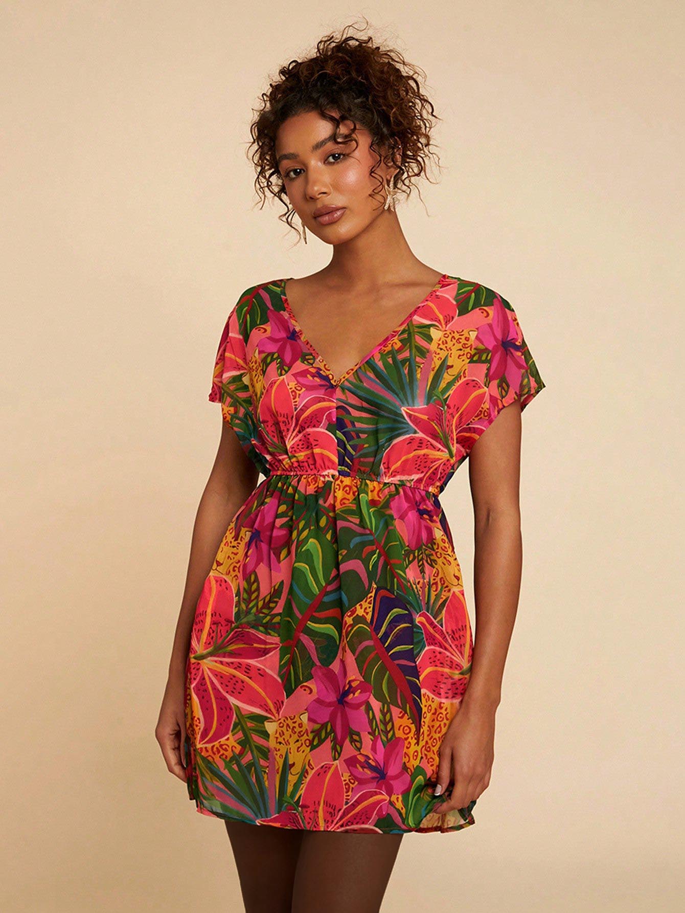 Travachic Women's V-Neck Batwing Sleeve Floral Print Casual Cover Up, Suitable For Leisure And Holiday