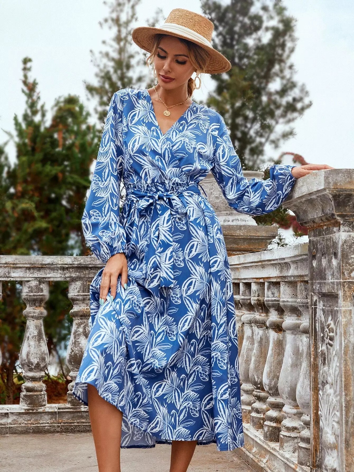 Tropical Print Surplice Front Dress Without Belt