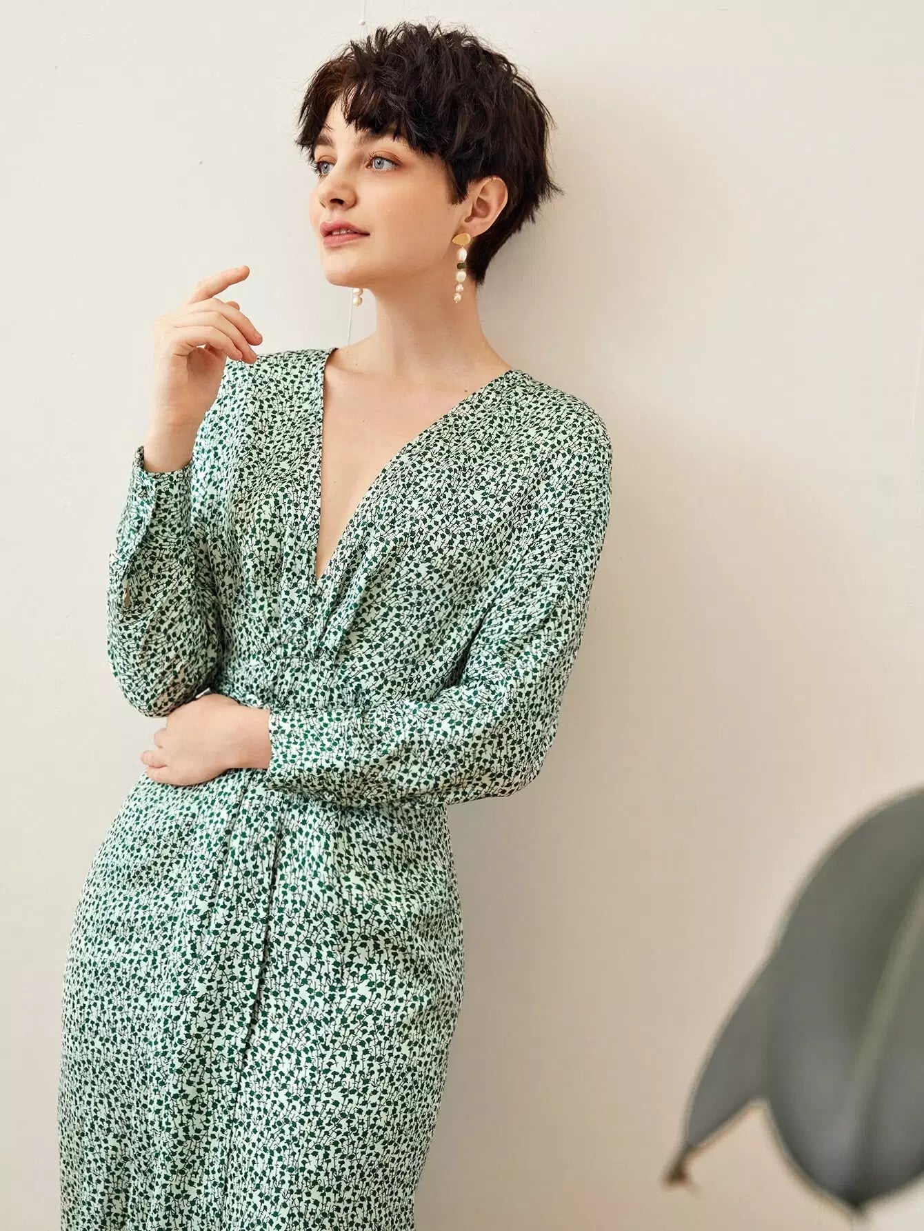 V-neck Batwing Sleeve All-over Print Satin Dress Without Belt