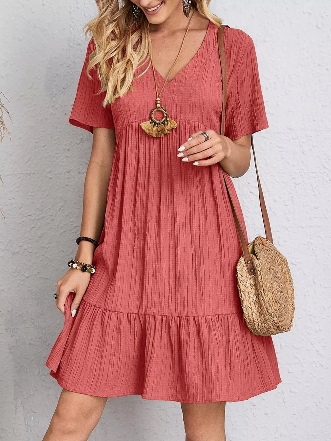 V-neck Solid Ruffle Hem Smock Dress