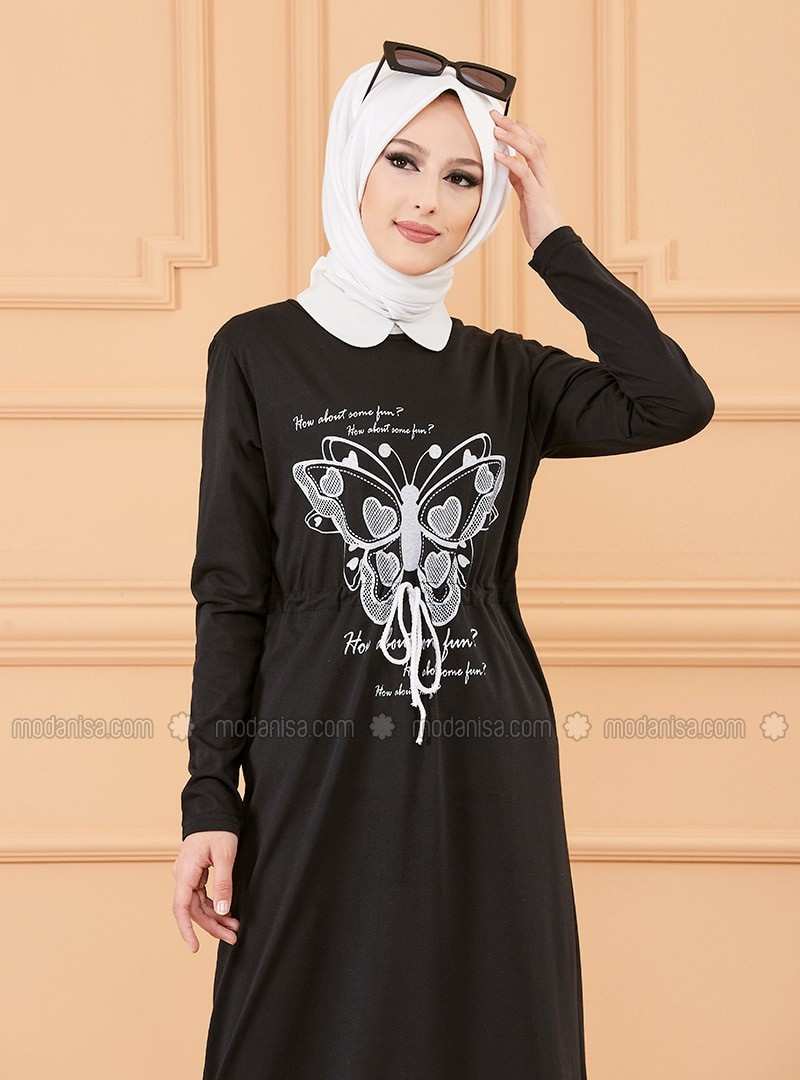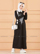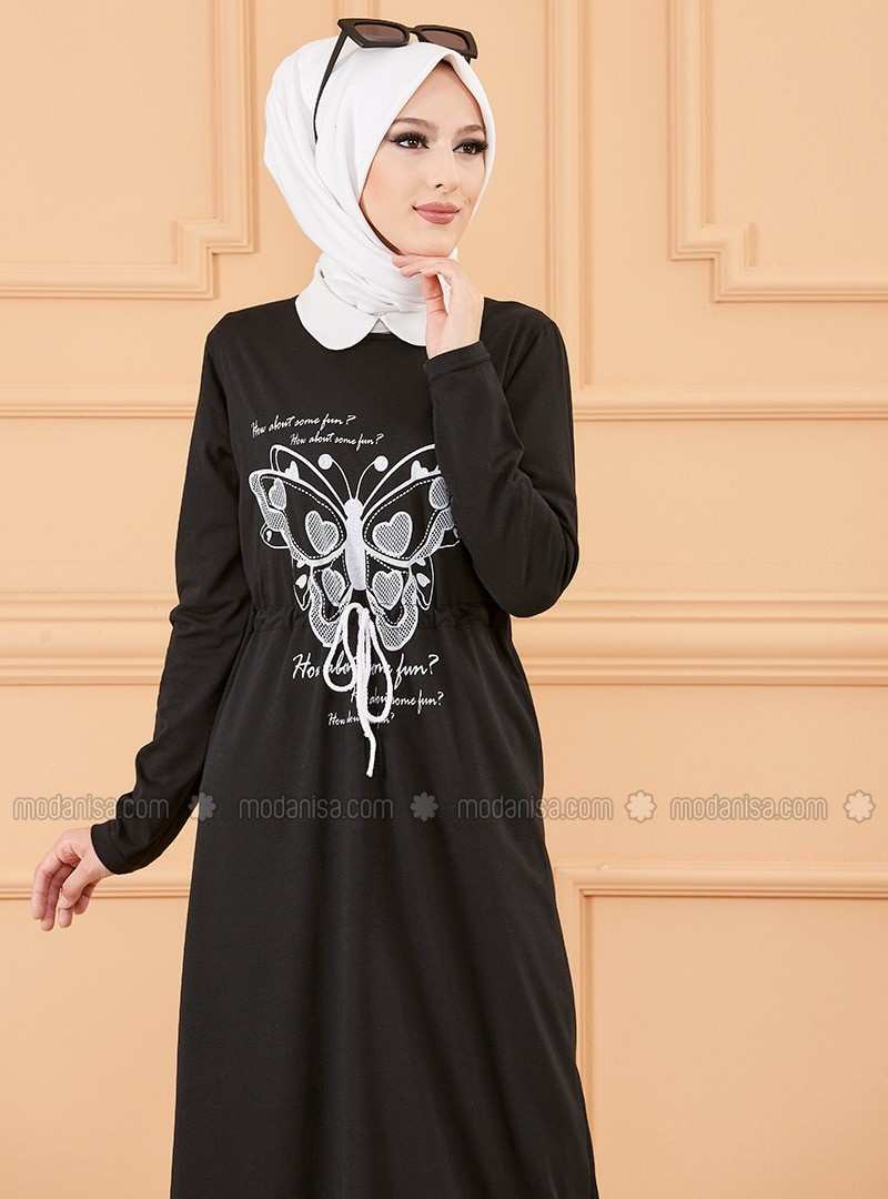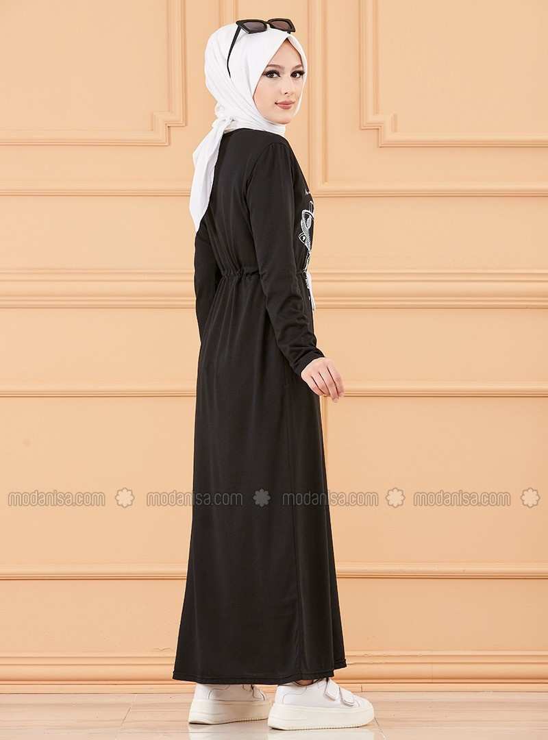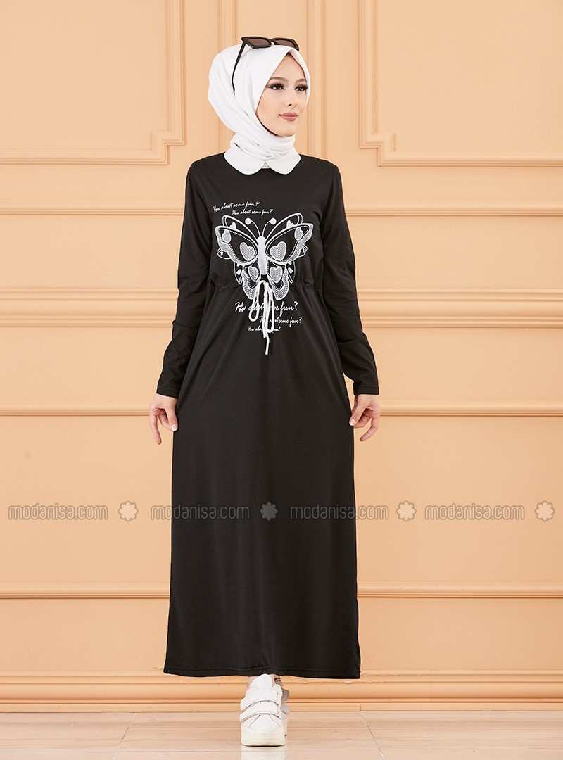 Black Multi Crew neck Unlined Cotton Viscose Modest Dress