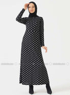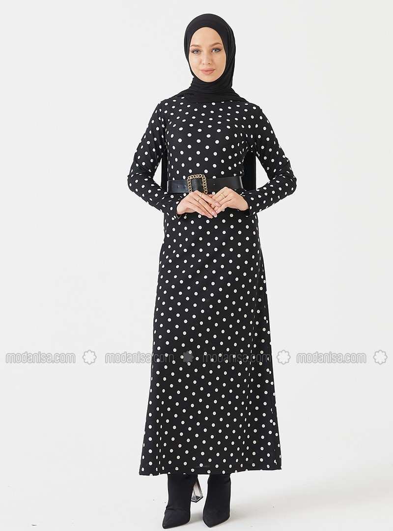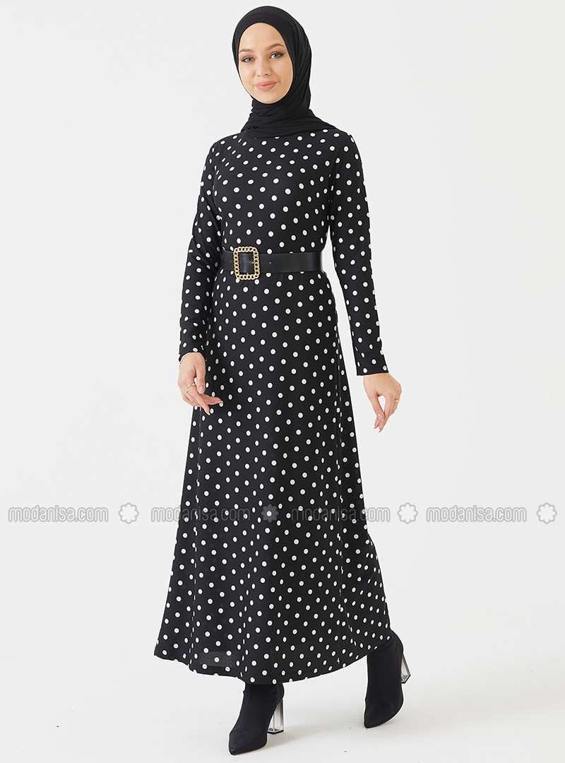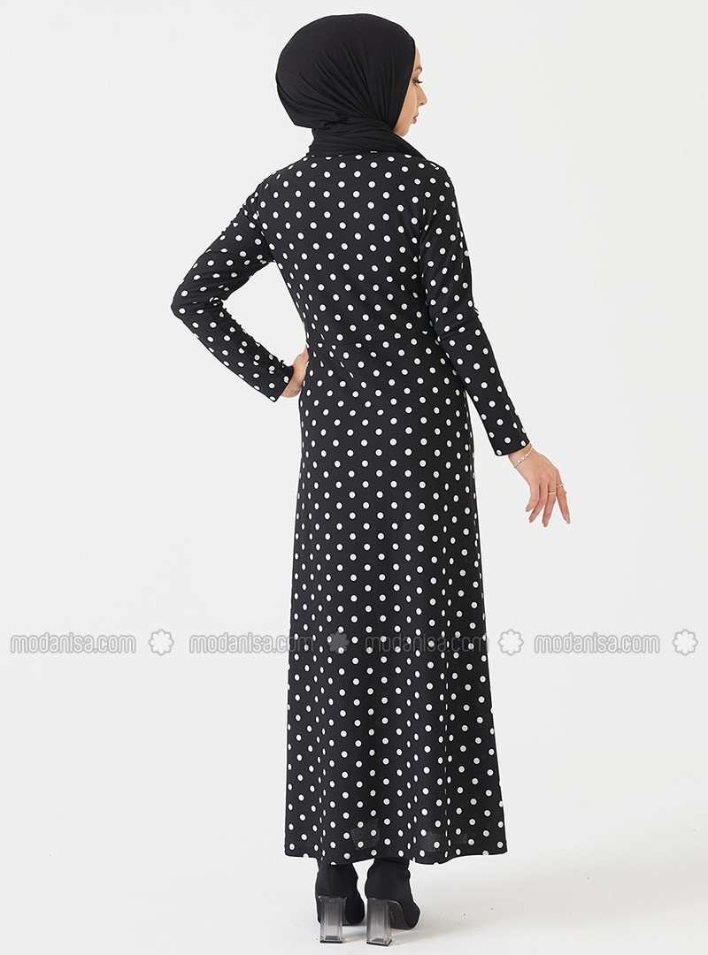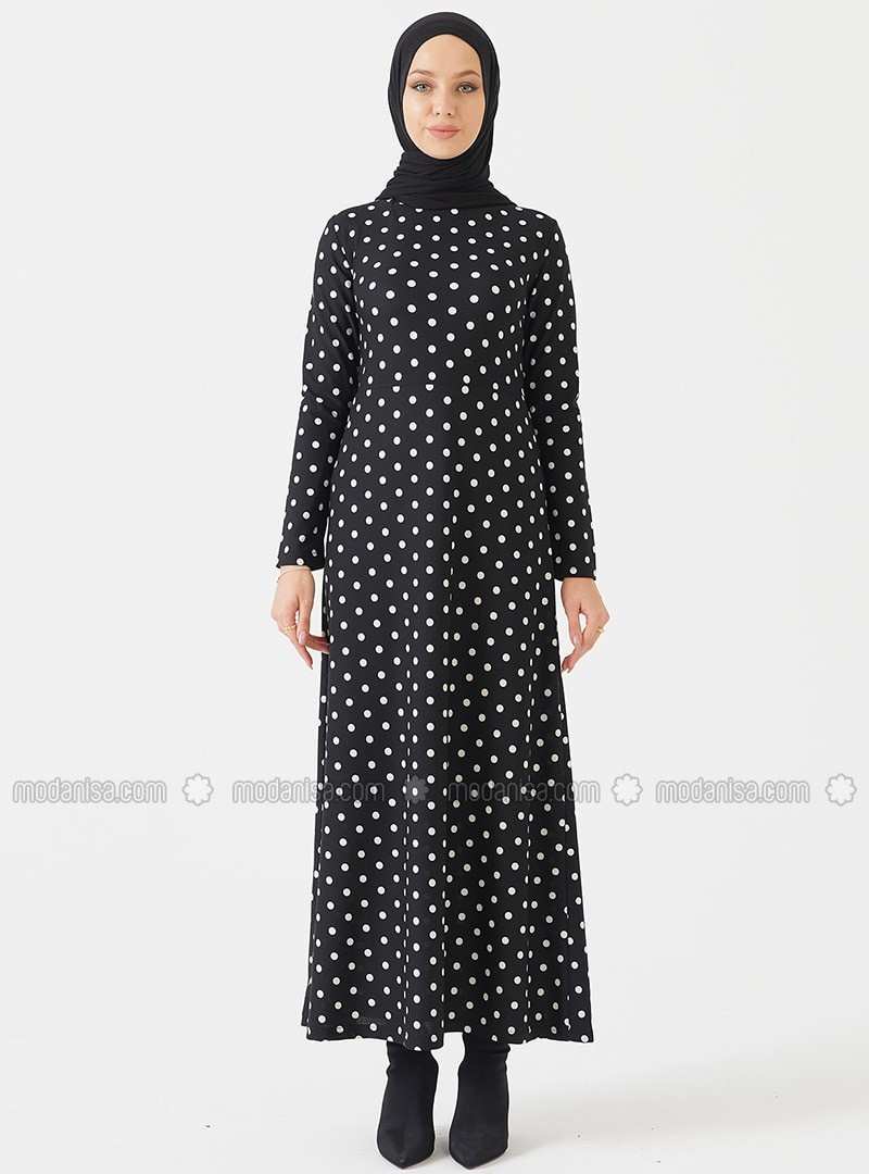 Black Polka Dot Crew neck Unlined Modest Dress