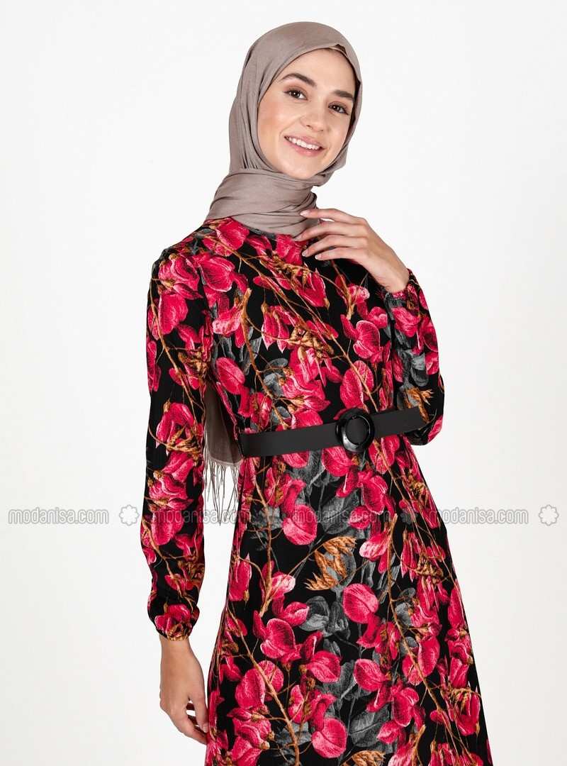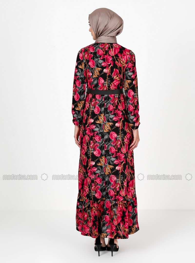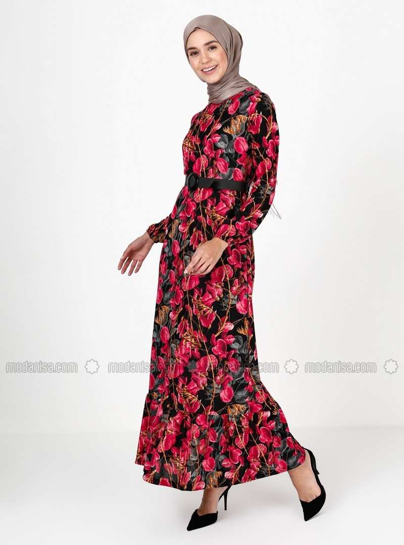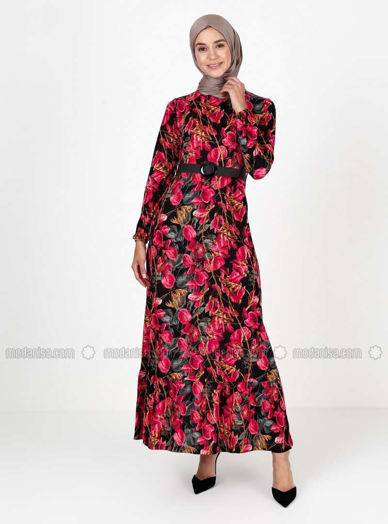 Fuchsia Floral Crew neck Unlined Modest Dress