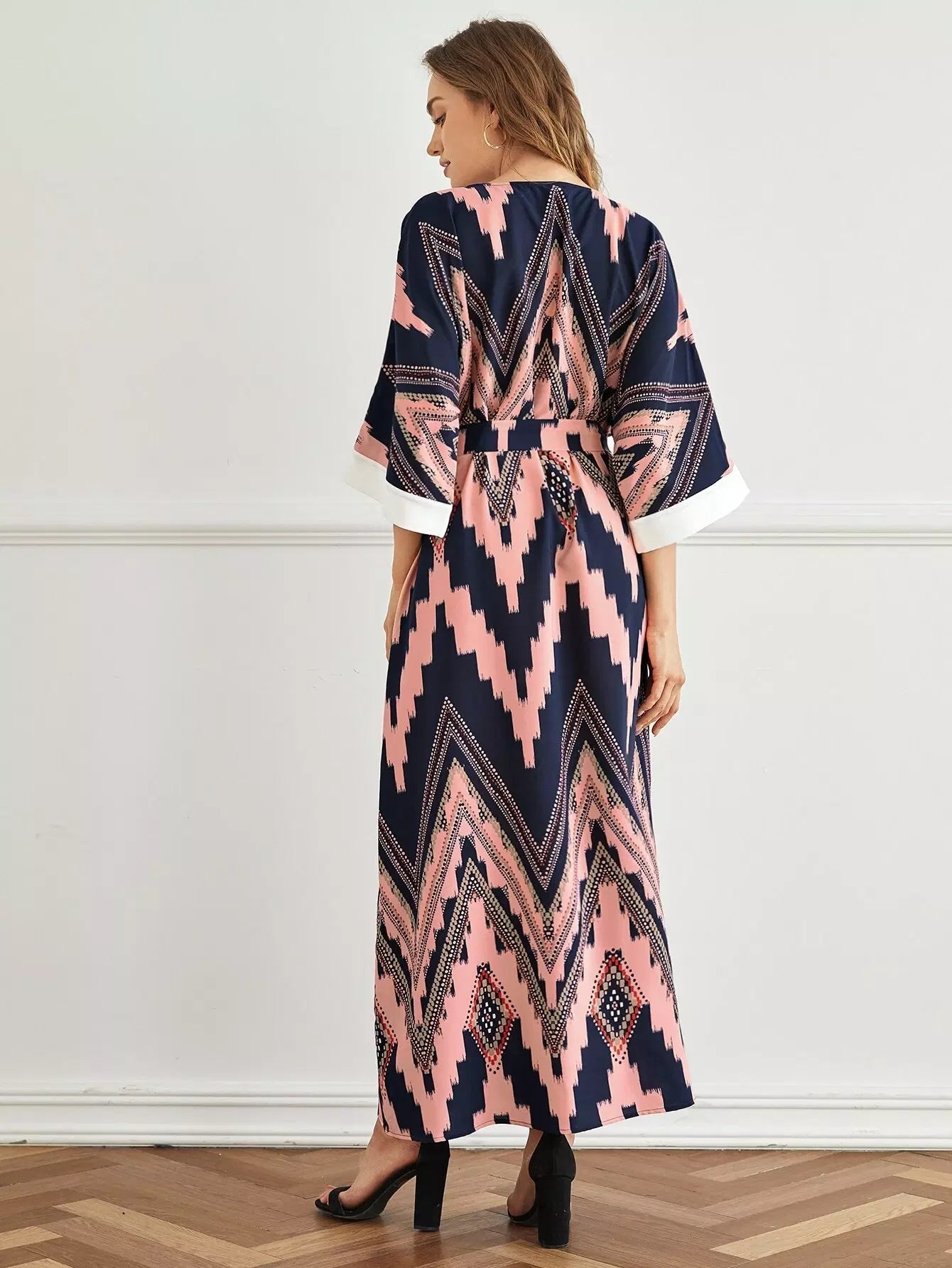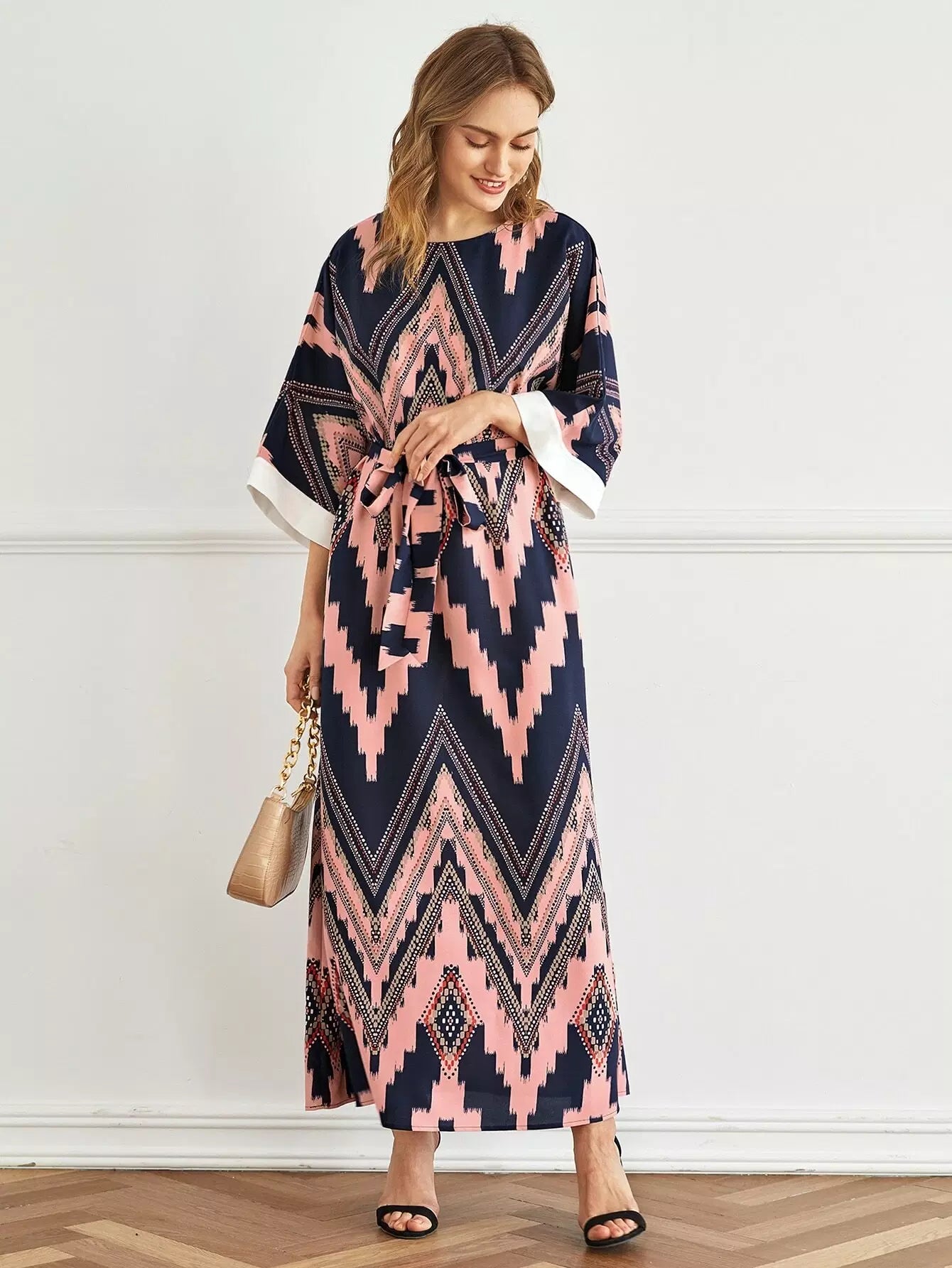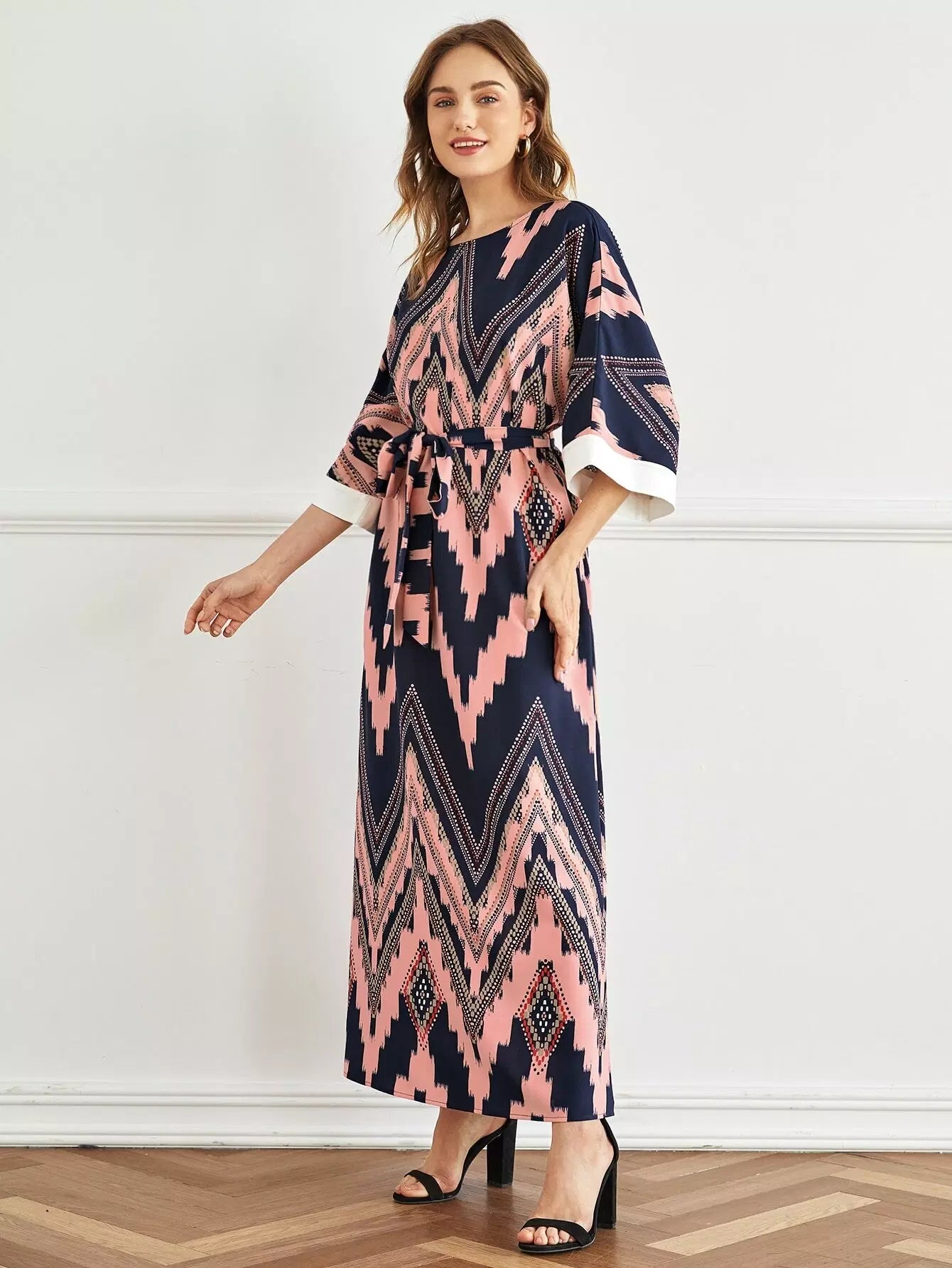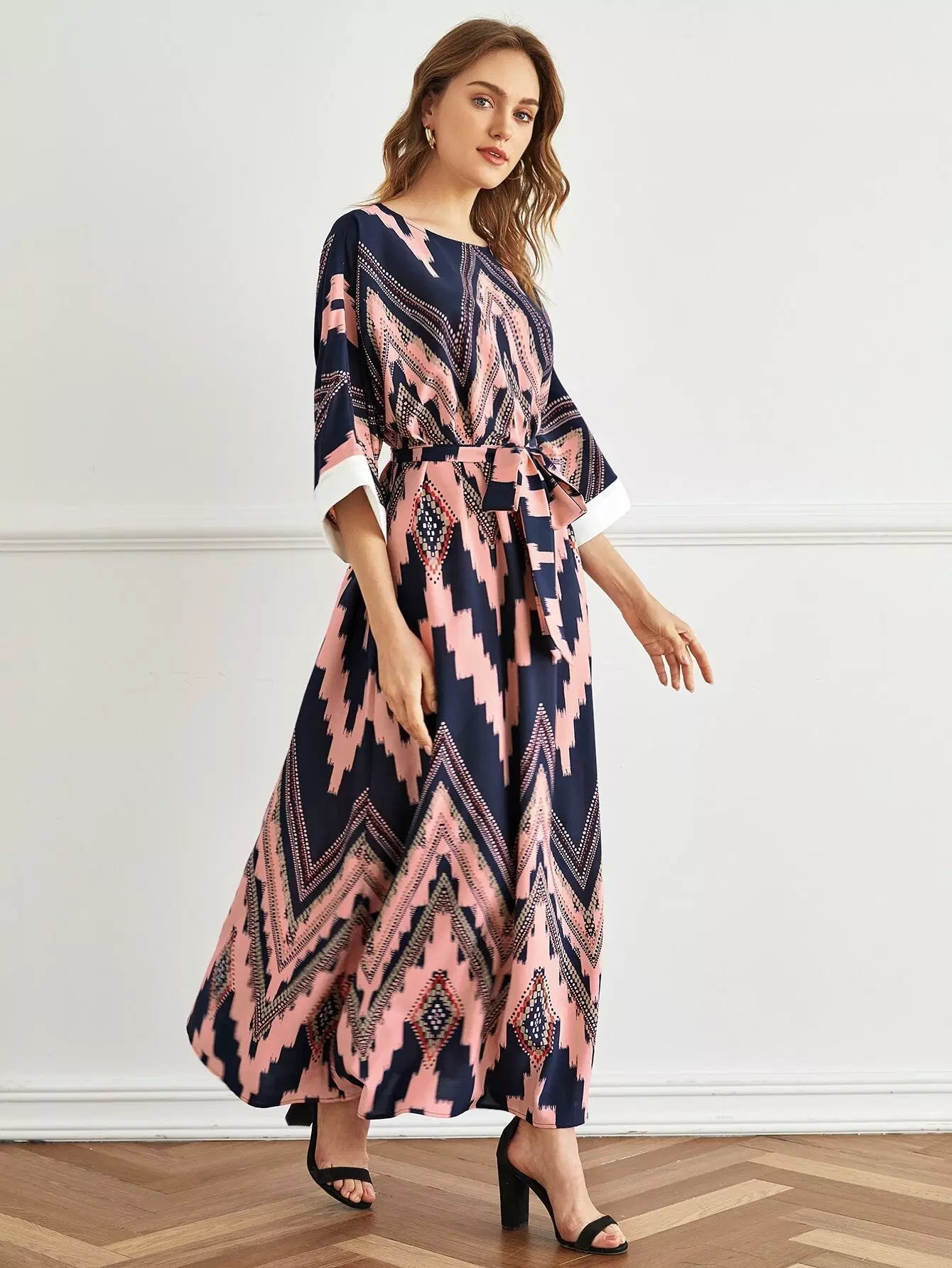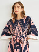 Women - Solid Cuff Self Belted Graphic Print Dress