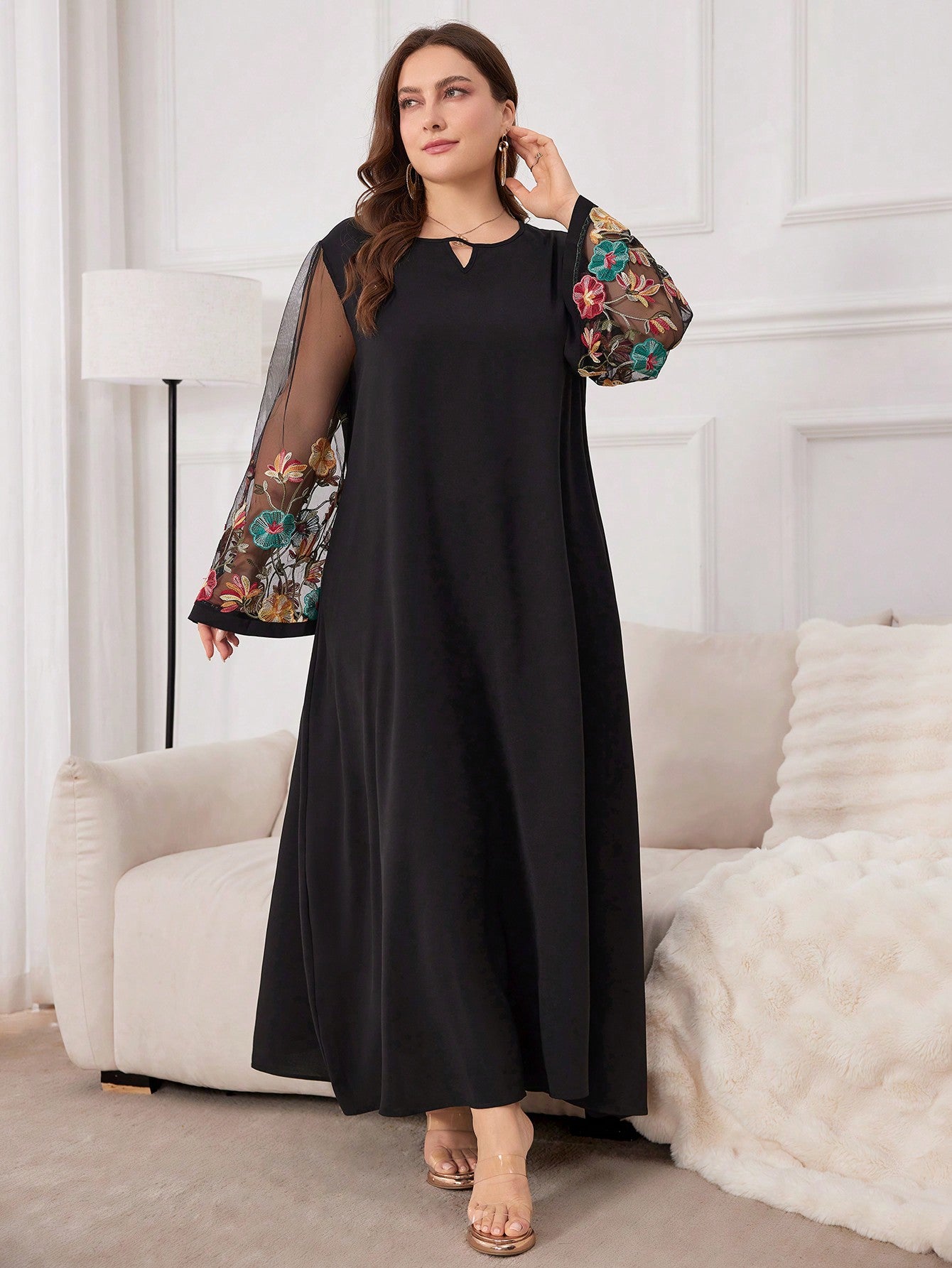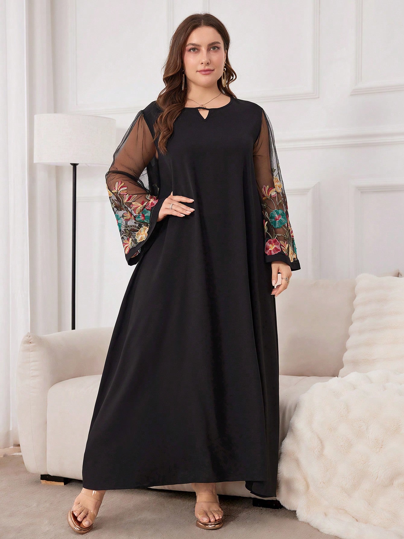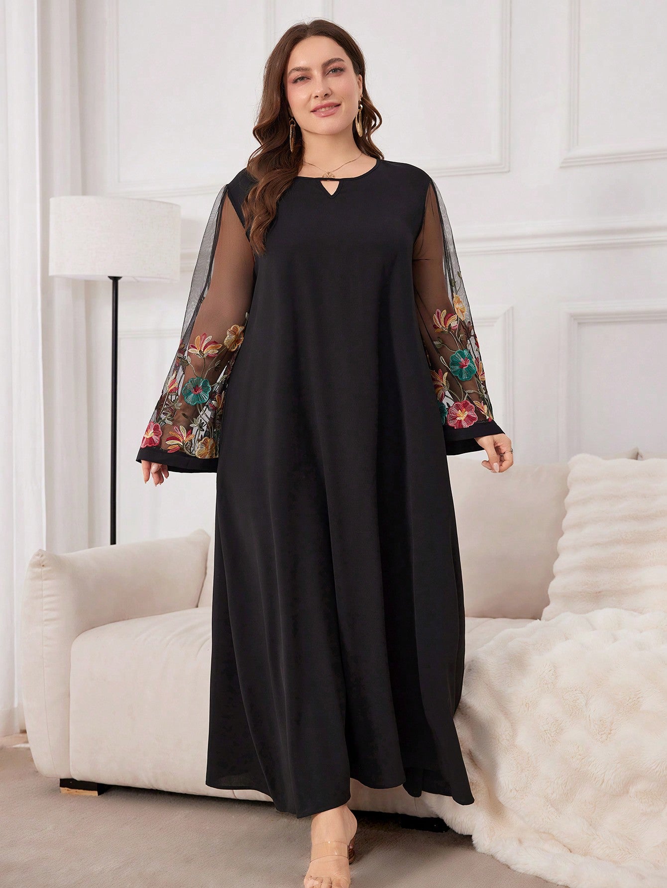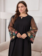 Al Najma Plus Size Women's Arabian Floral Embroidery Mesh & Keyhole Neckline Modest Long Sleeve Dress