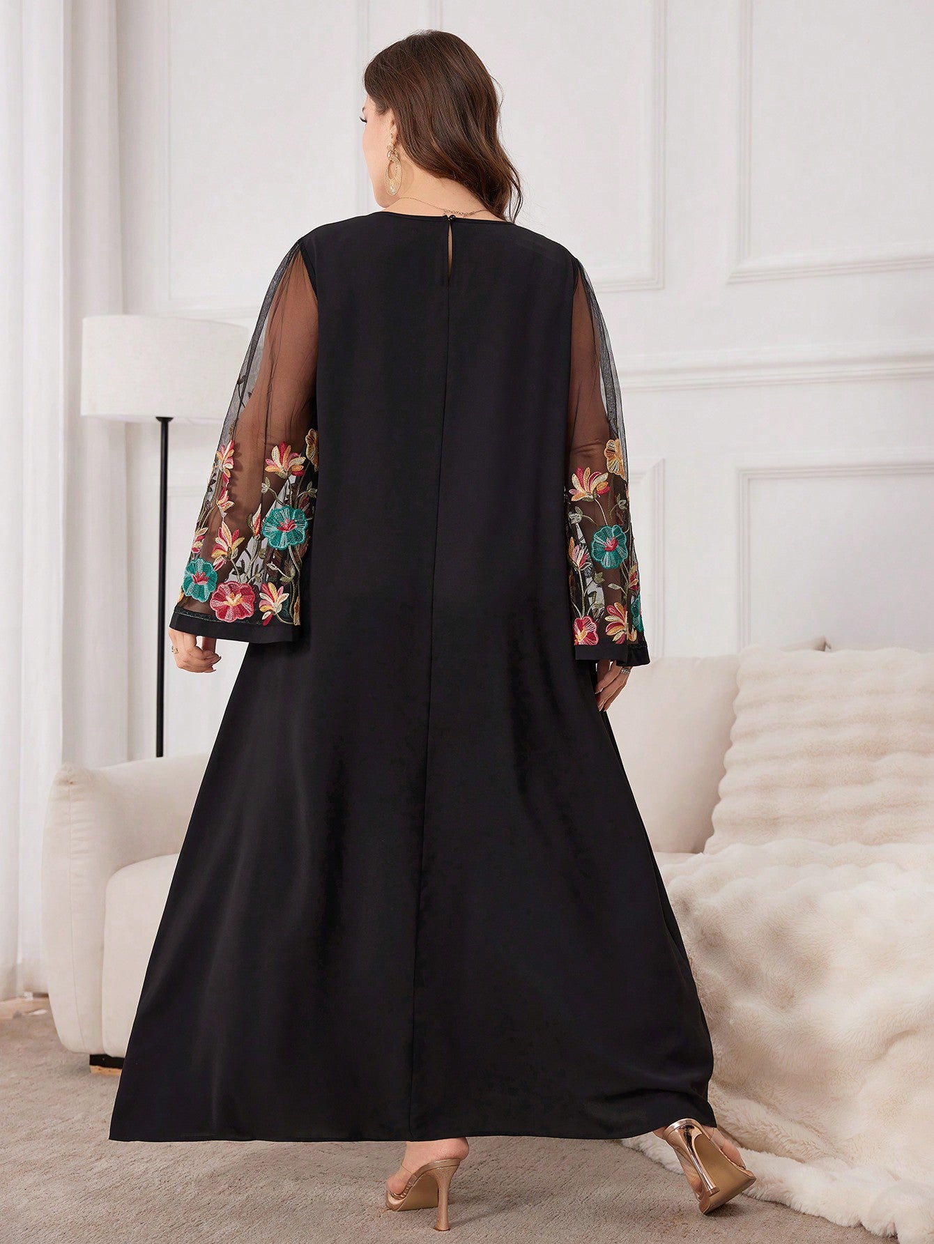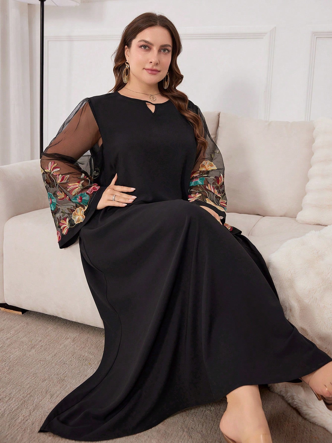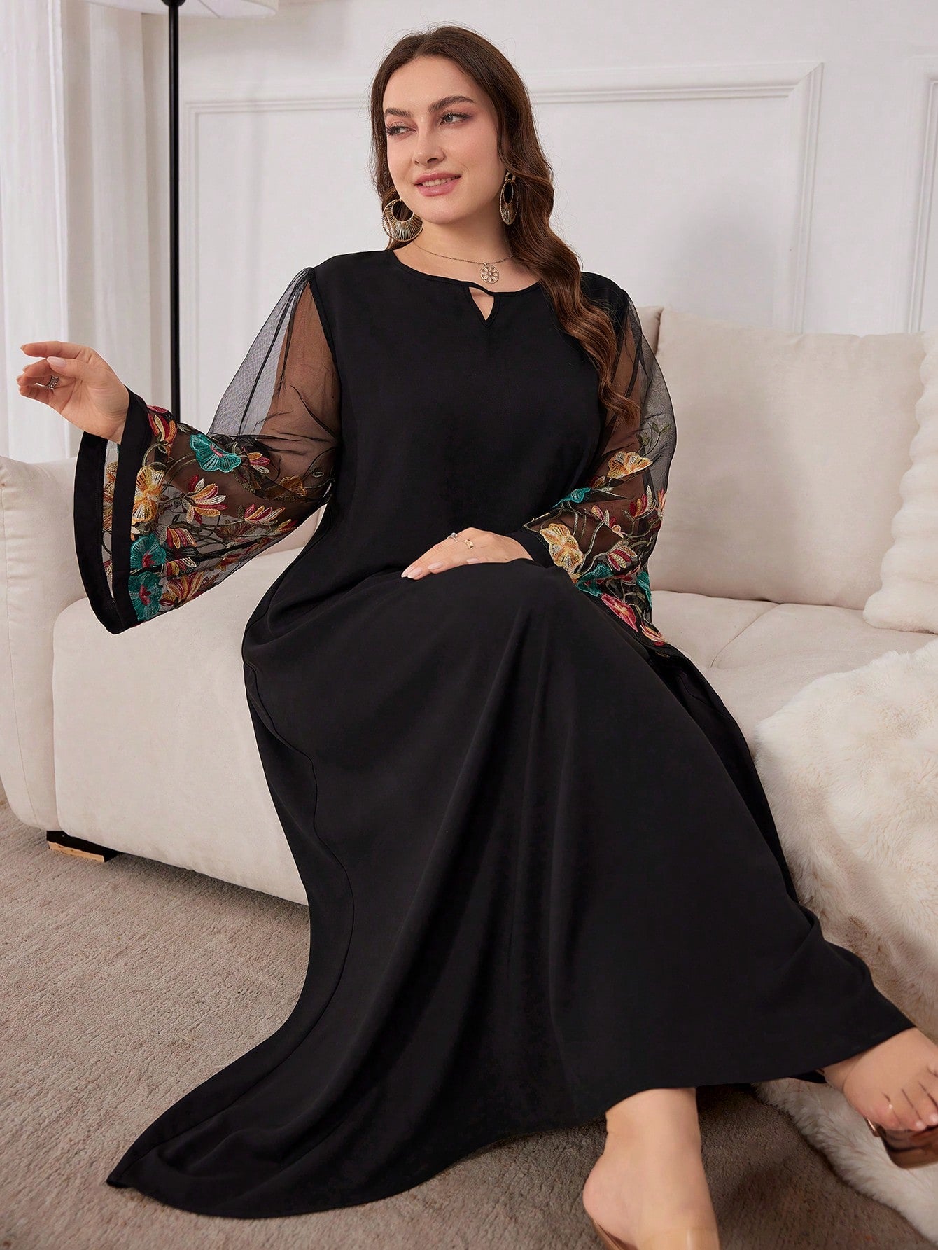Al Najma Plus Size Women's Arabian Floral Embroidery Mesh & Keyhole Neckline Modest Long Sleeve Dress