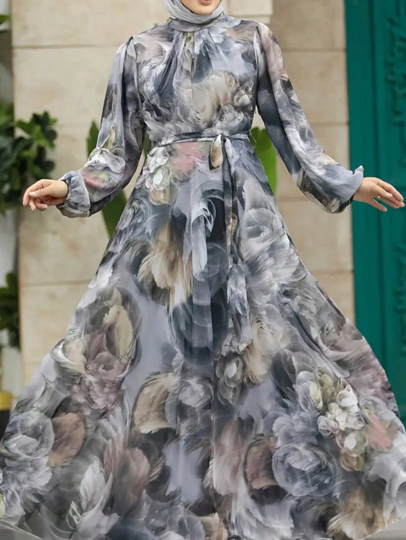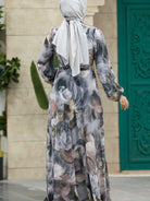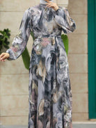 Arab Style Women Floral Tie Dye Print Stand Collar Lantern Sleeve Elegant Dress Modest