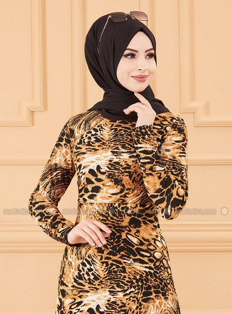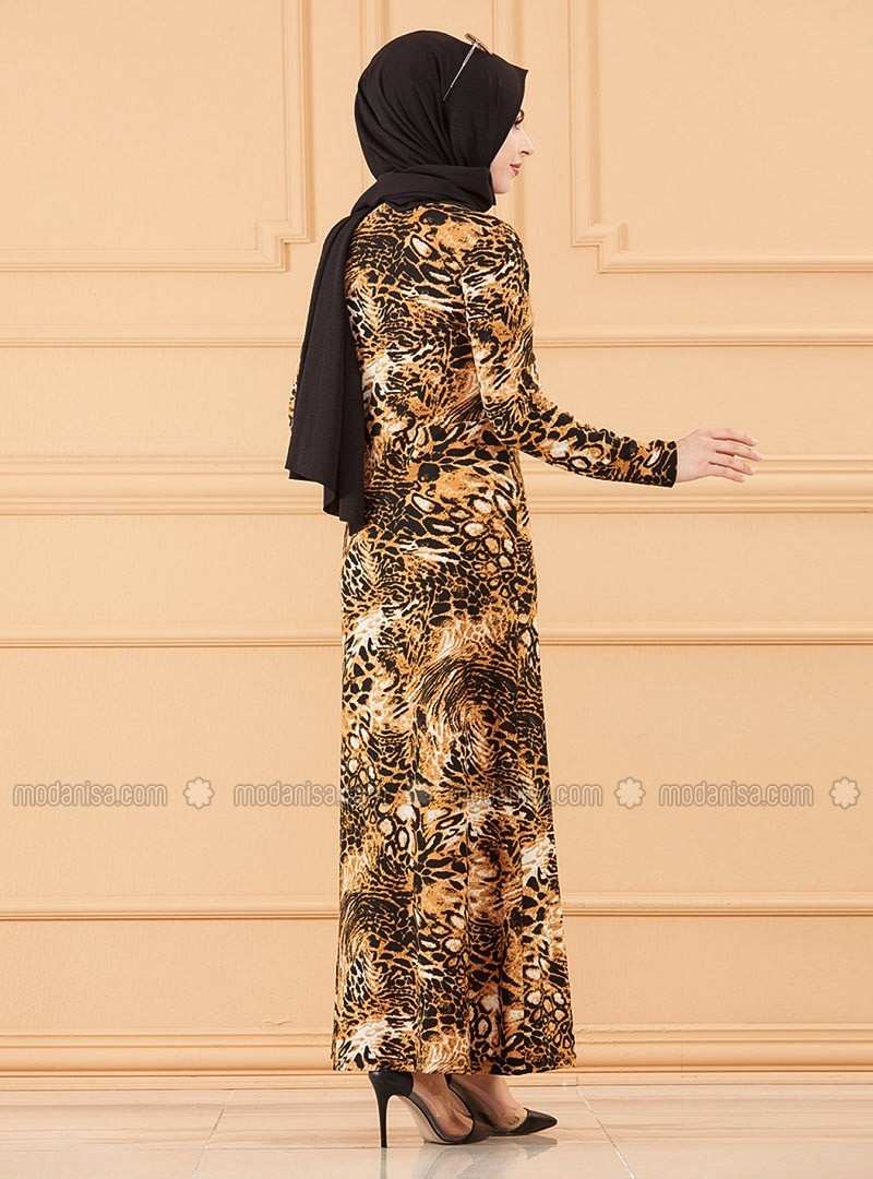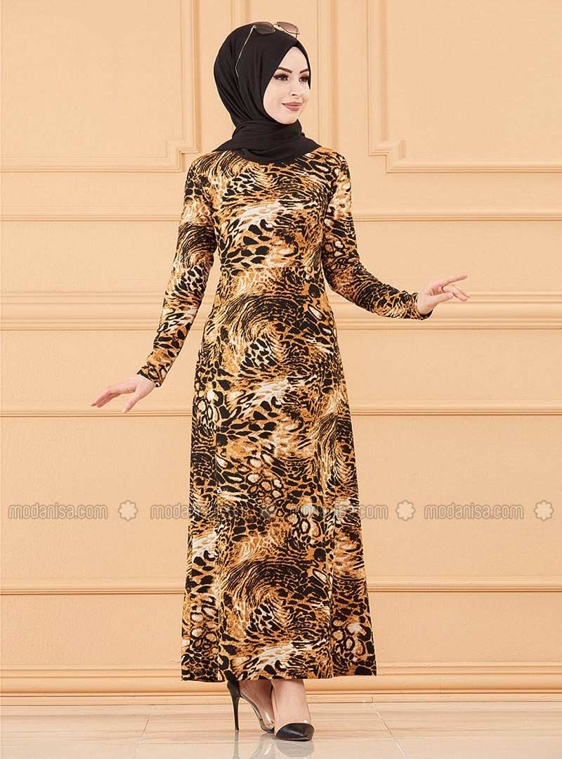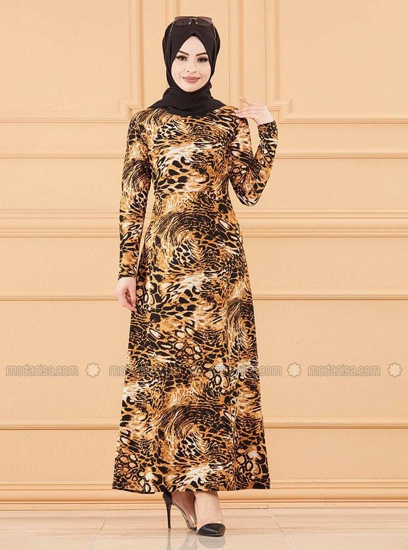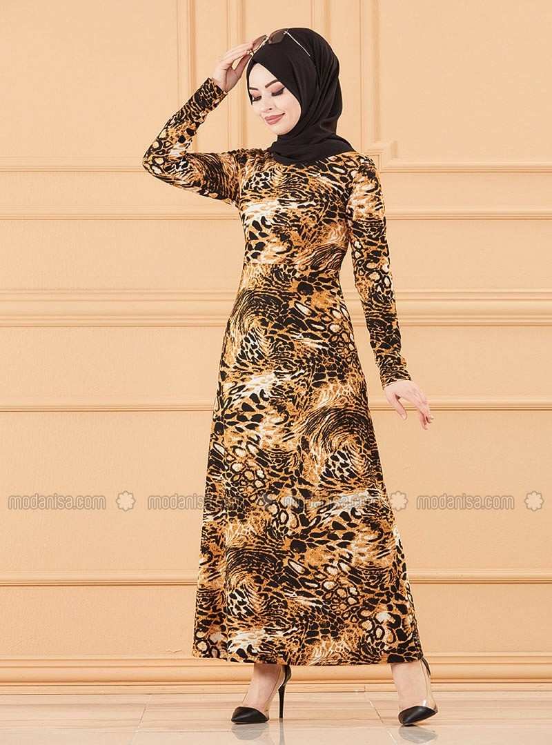 Black Multi Crew neck Unlined Modest Dress