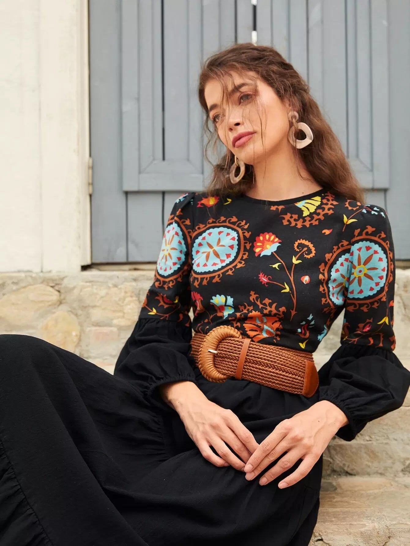 Floral Print Bishop Sleeve Ruffle Hem A-line Dress Without Belt