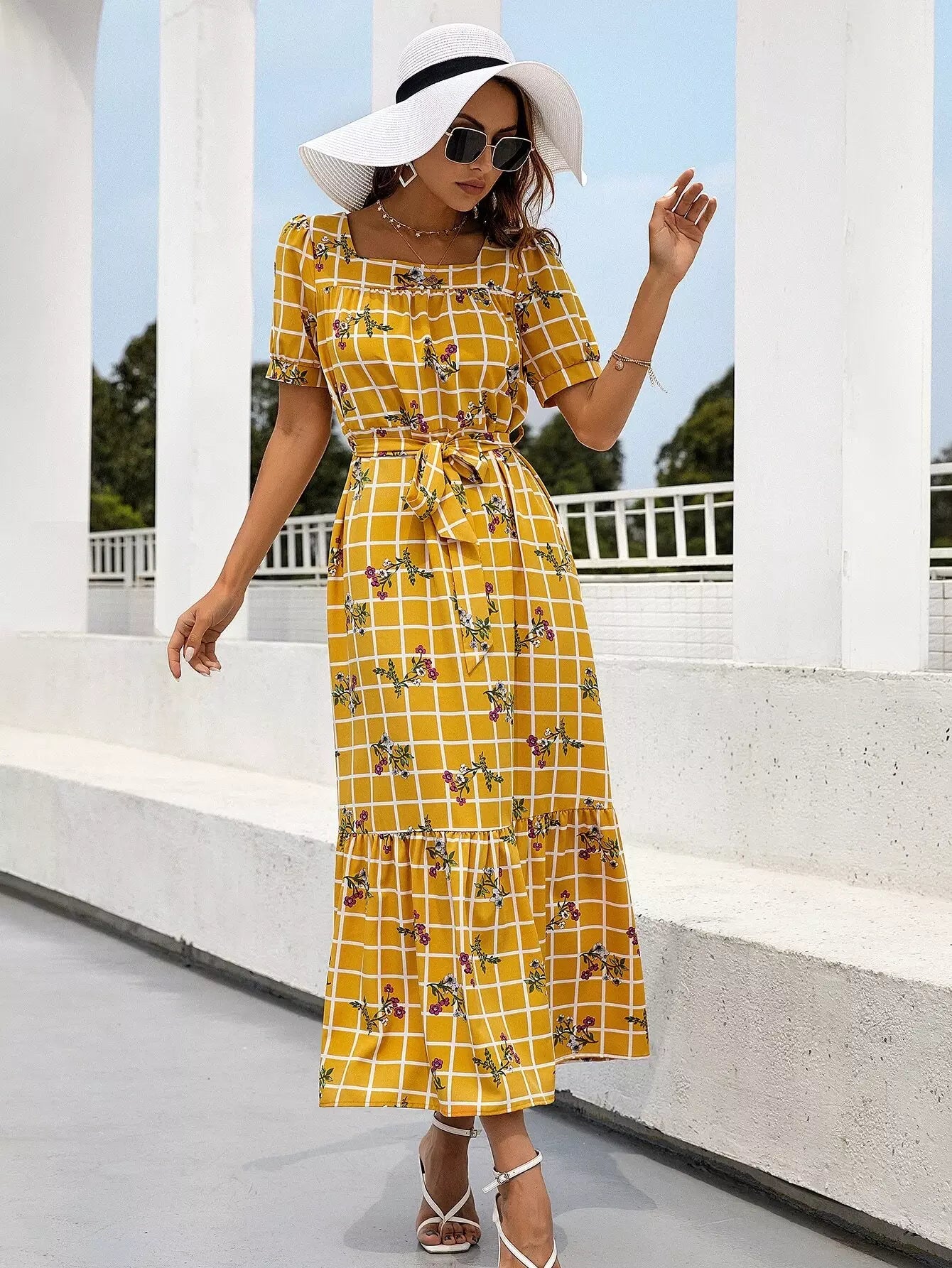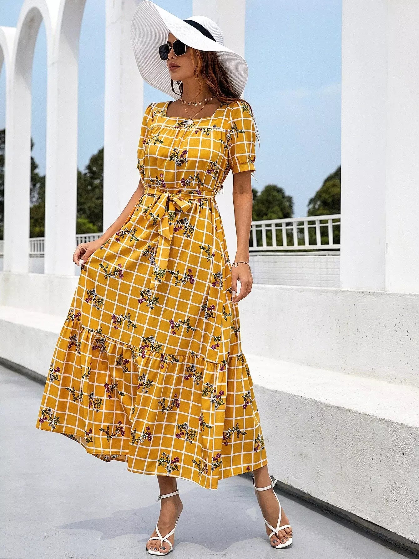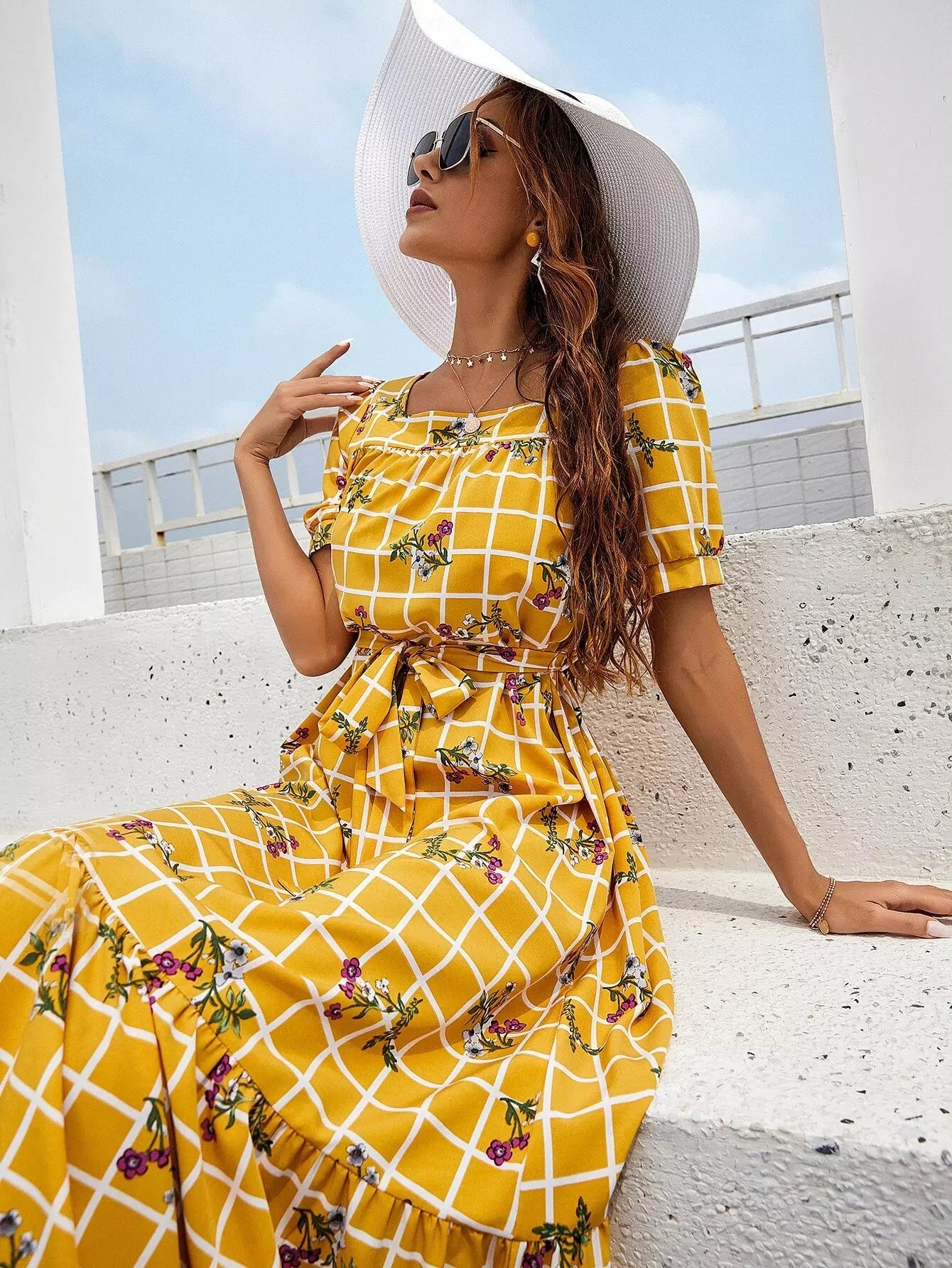 Floral Square Neck Ruffle Hem Dress Without Belt