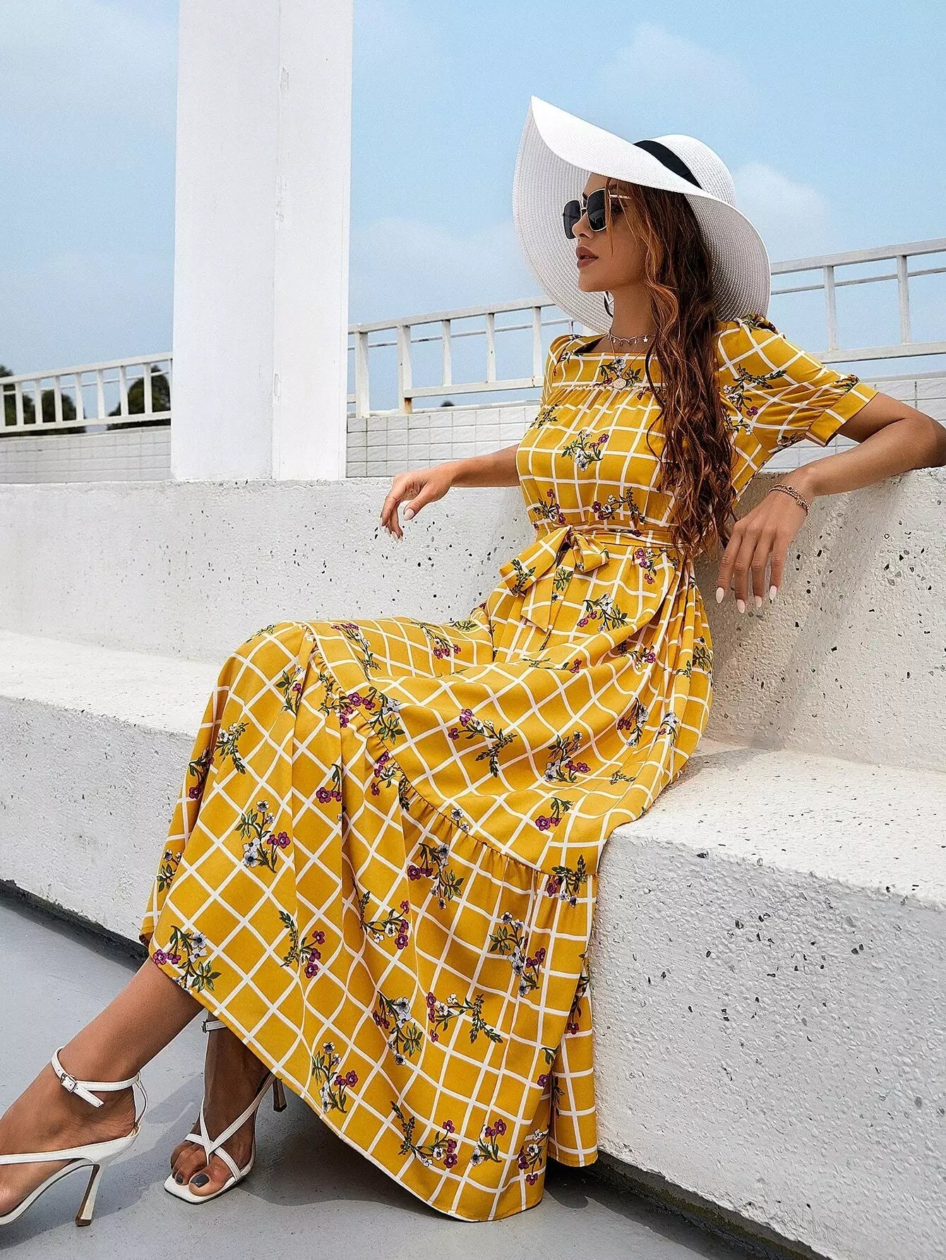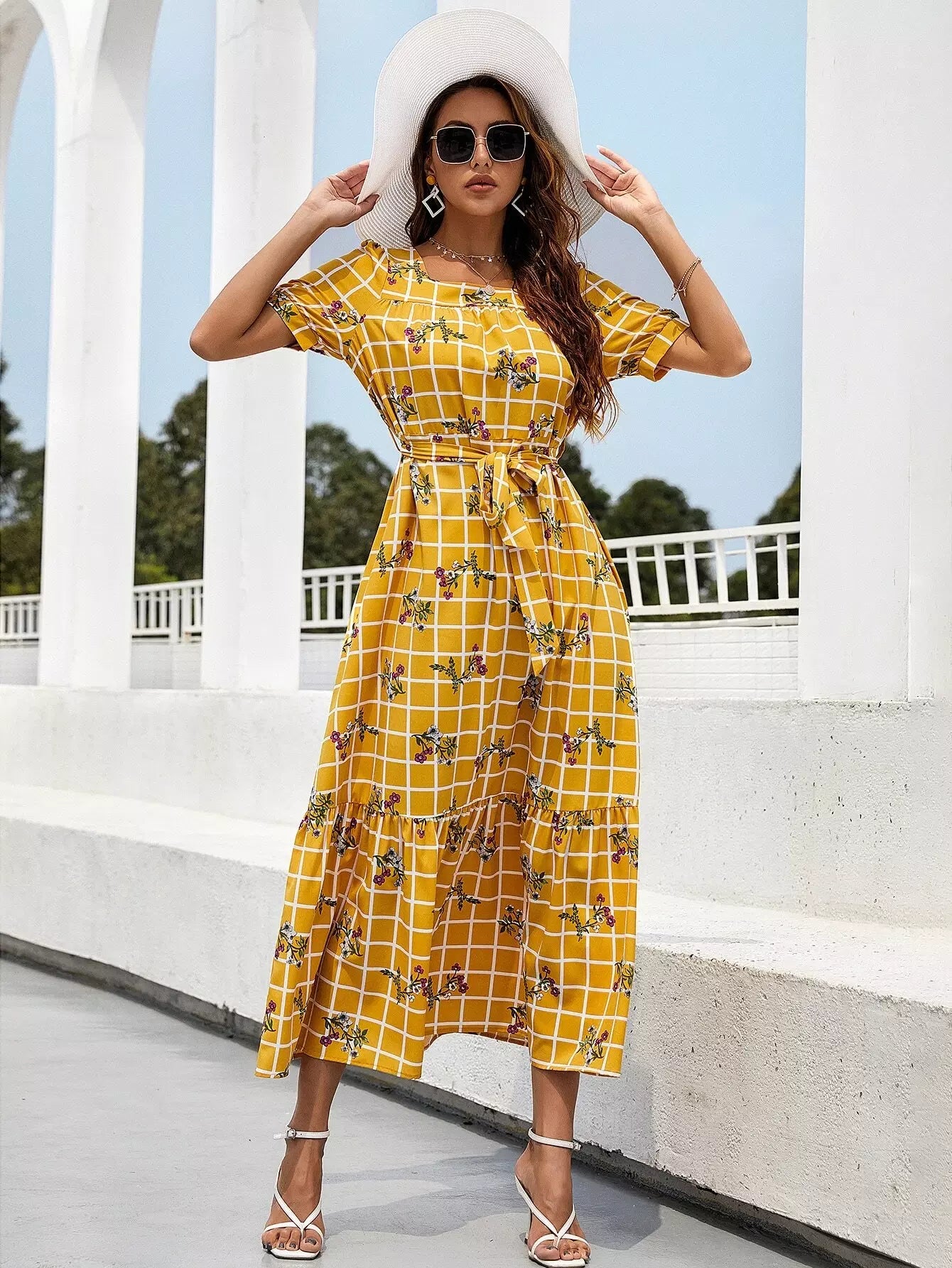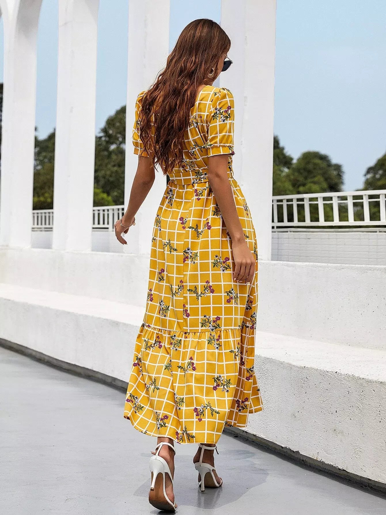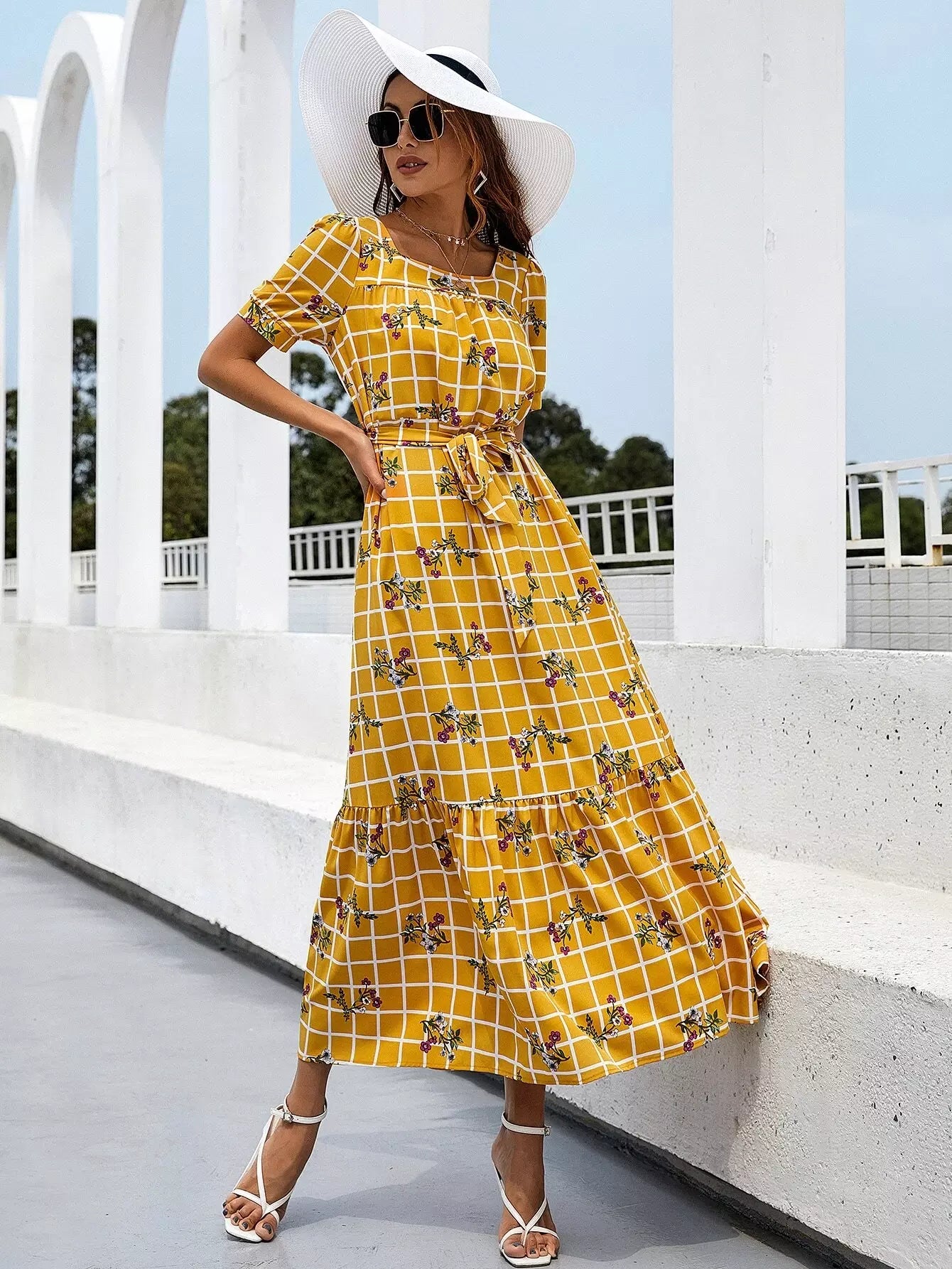 Floral Square Neck Ruffle Hem Dress Without Belt