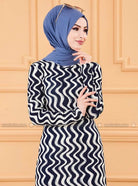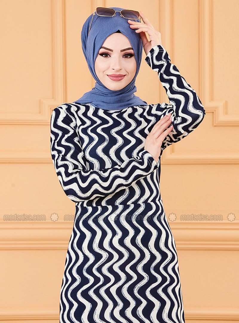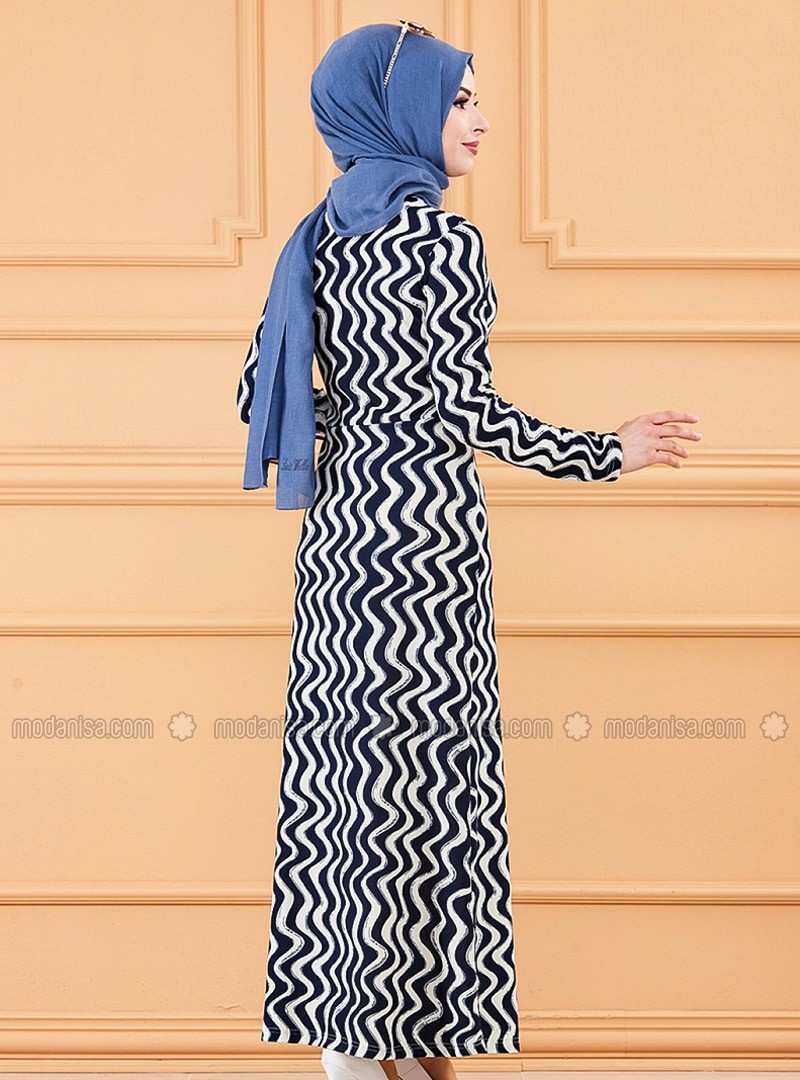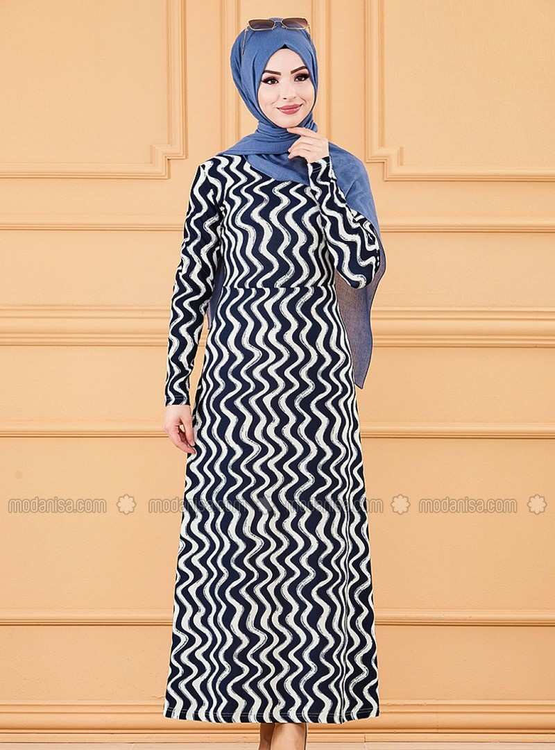 Navy Blue Multi Crew neck Unlined Modest Dress