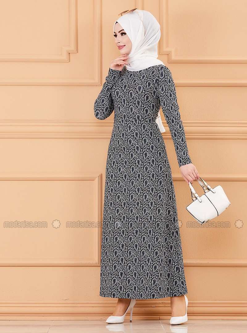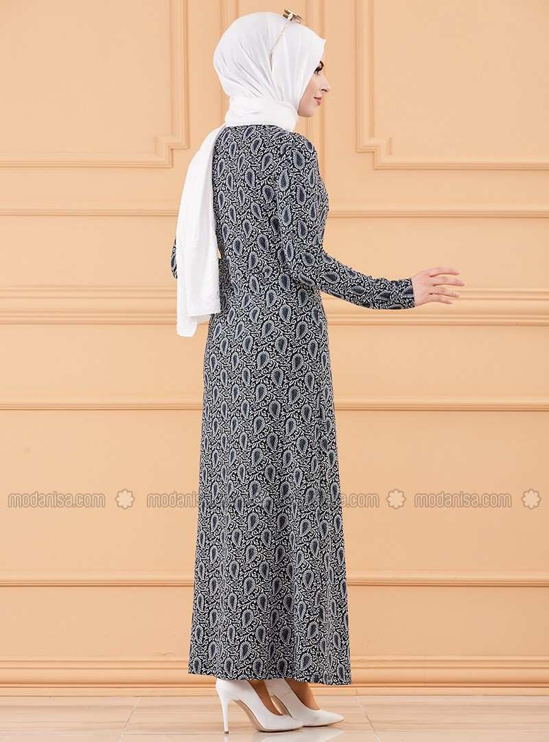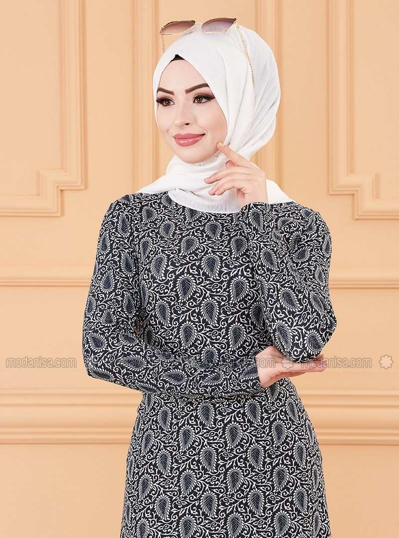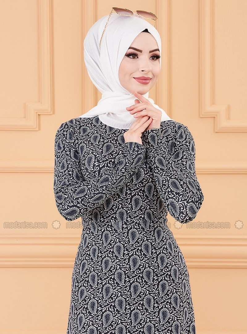 Navy Blue Multi Crew neck Unlined Modest Dress