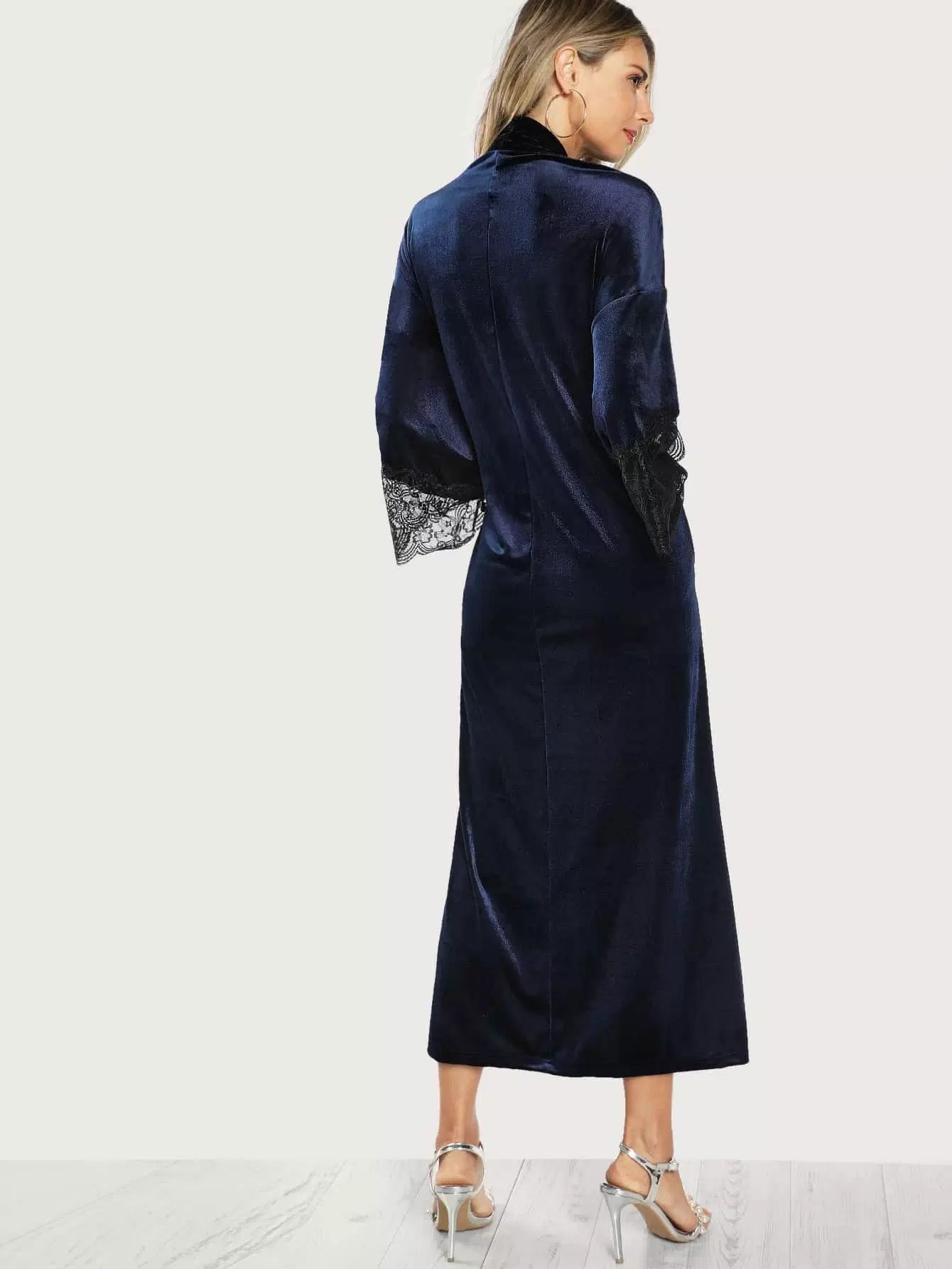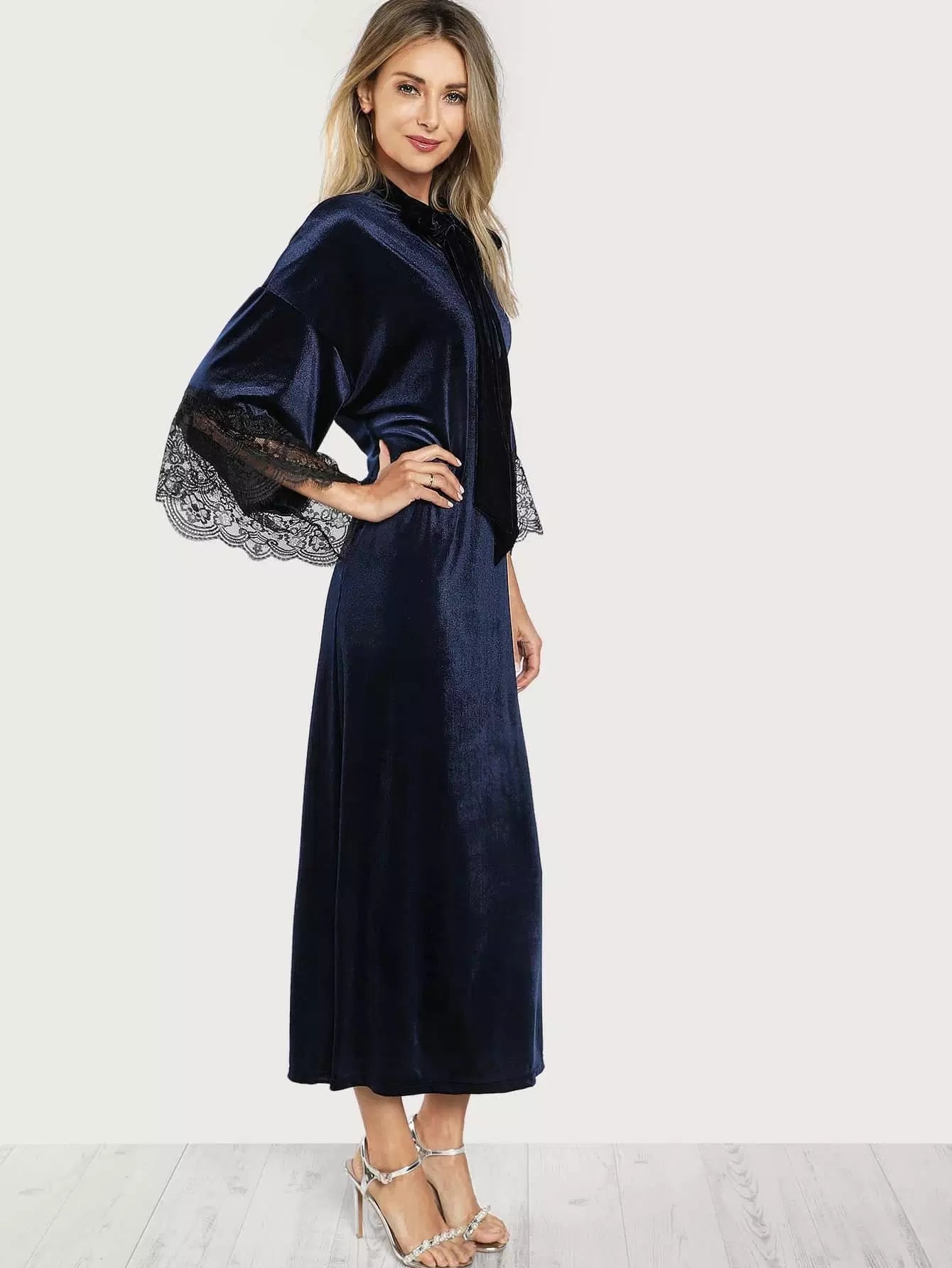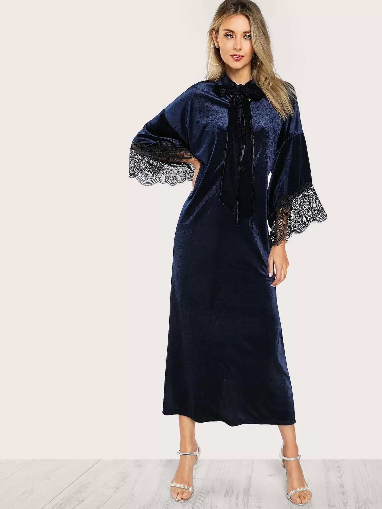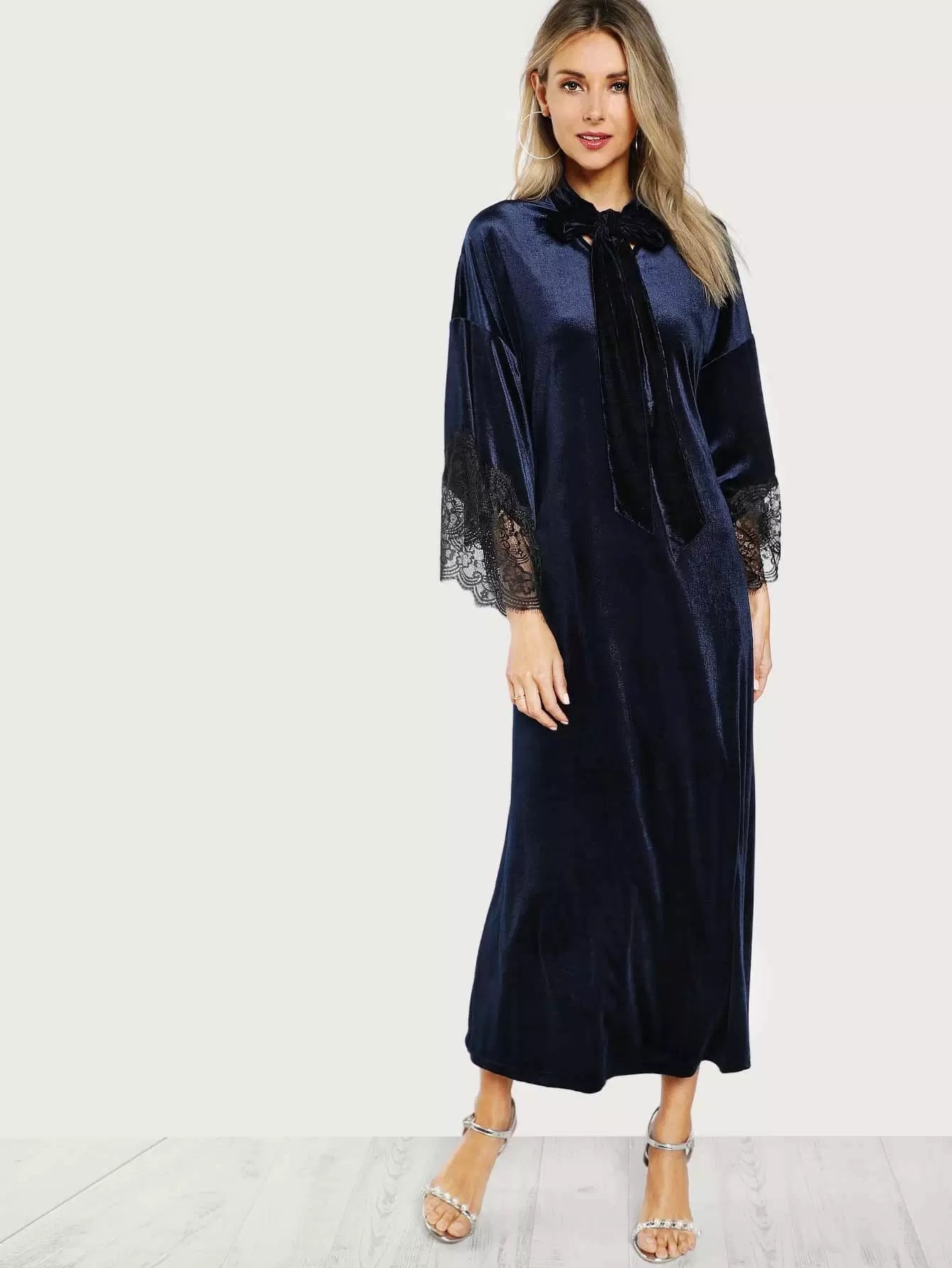 Tie Neck Lace Trim Bell Sleeve Hijab Long Dress
