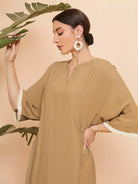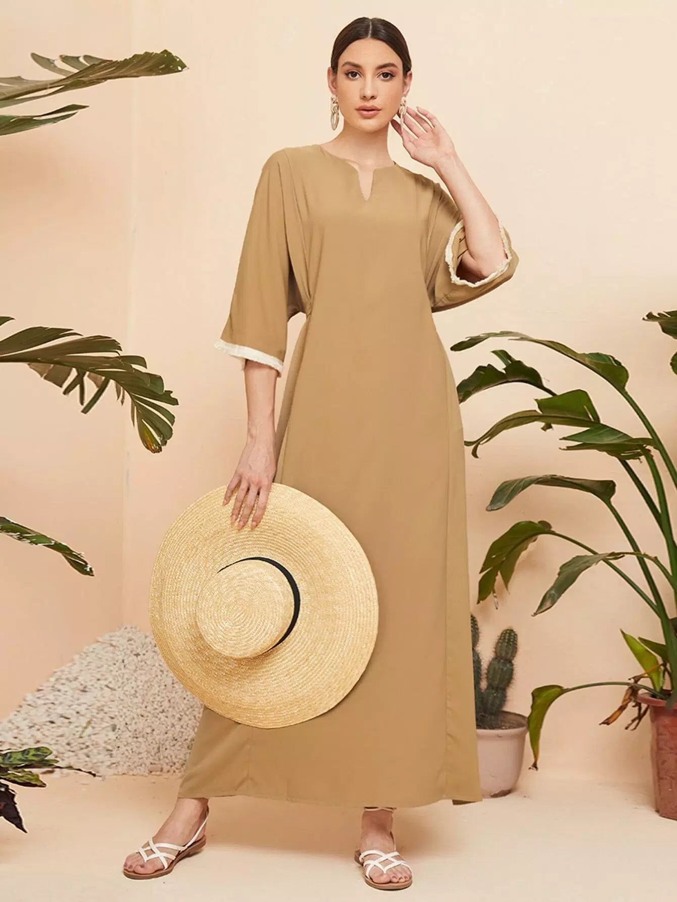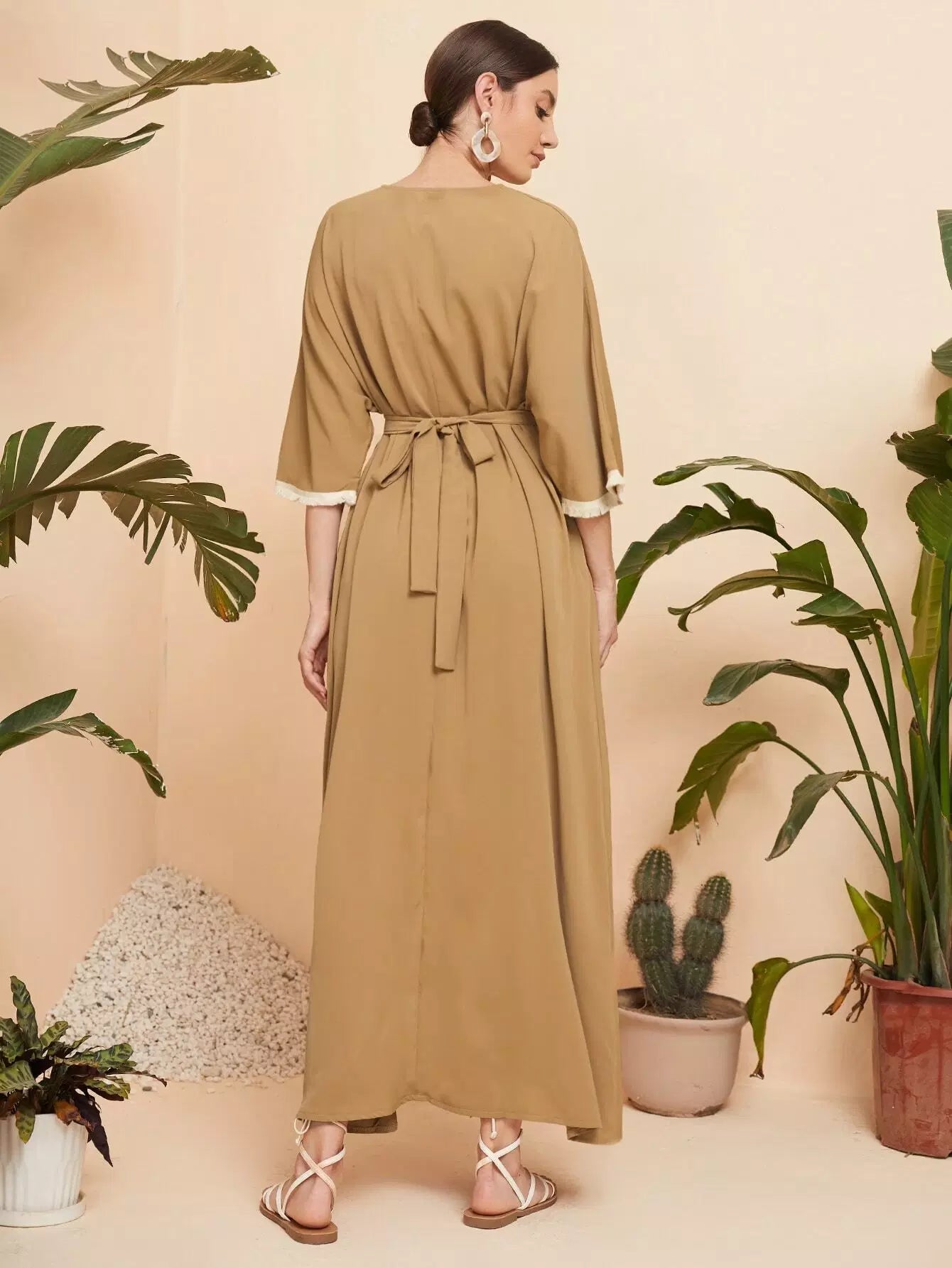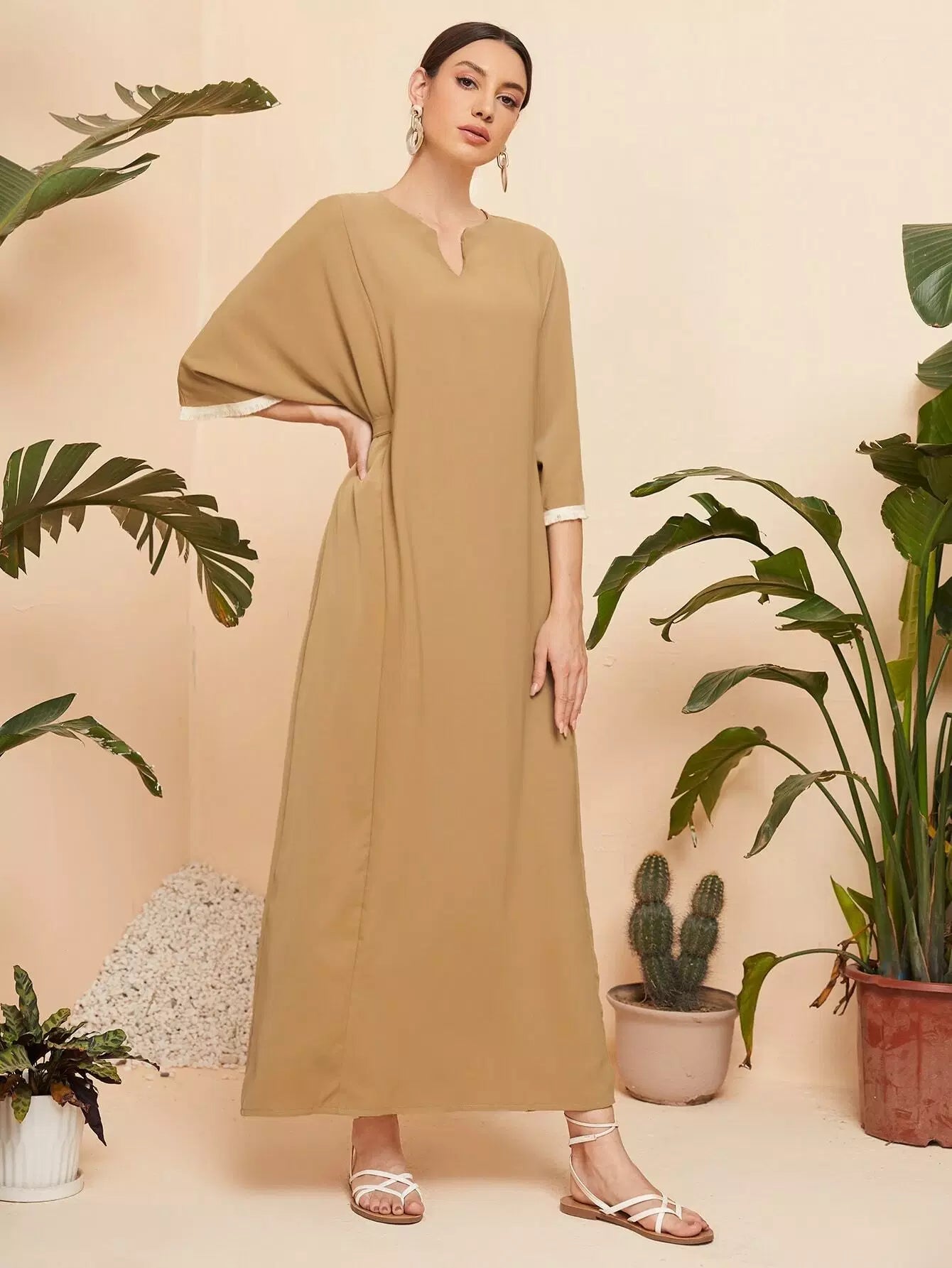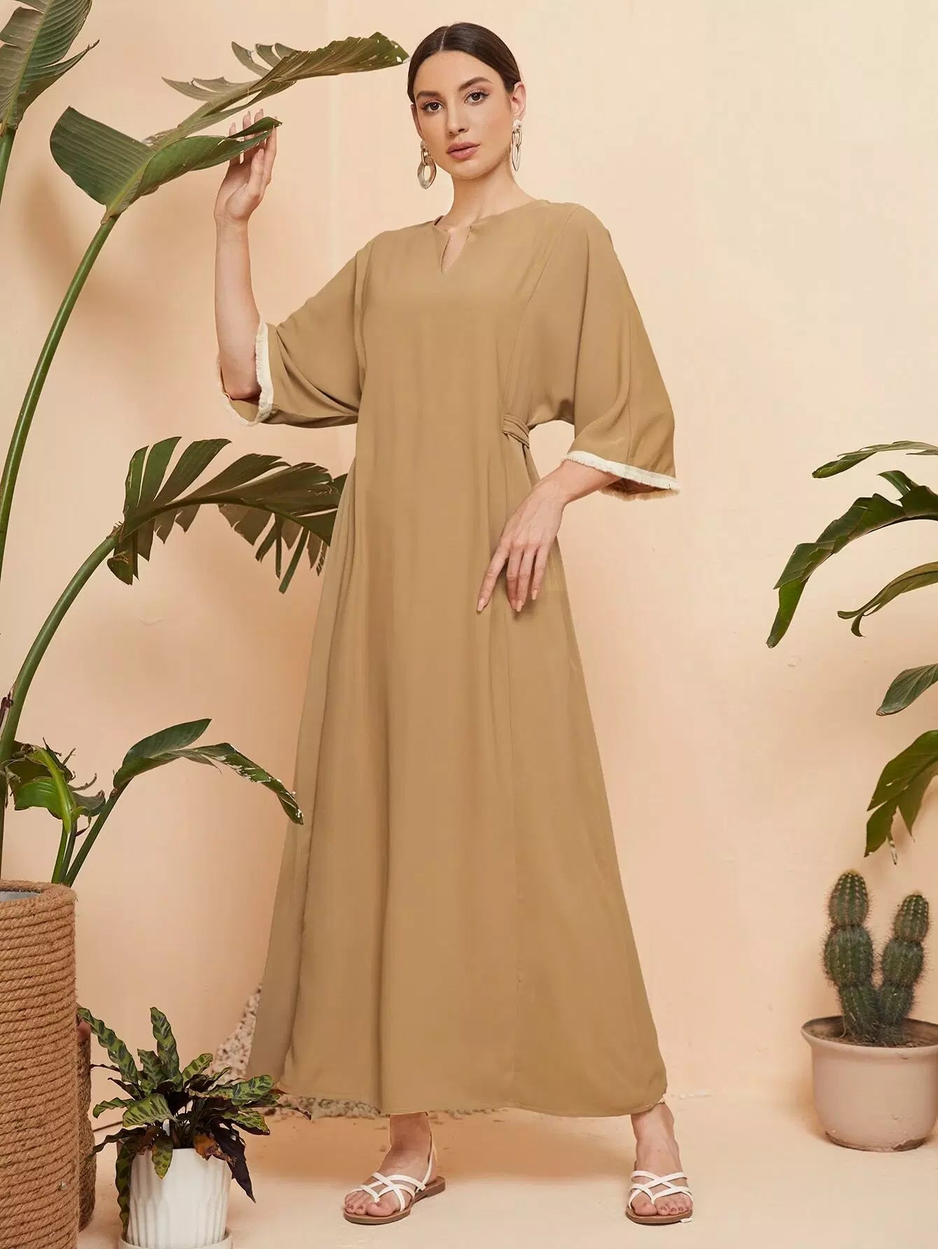 Notched Neck Fringe Cuff Tie Back Tunic Dress