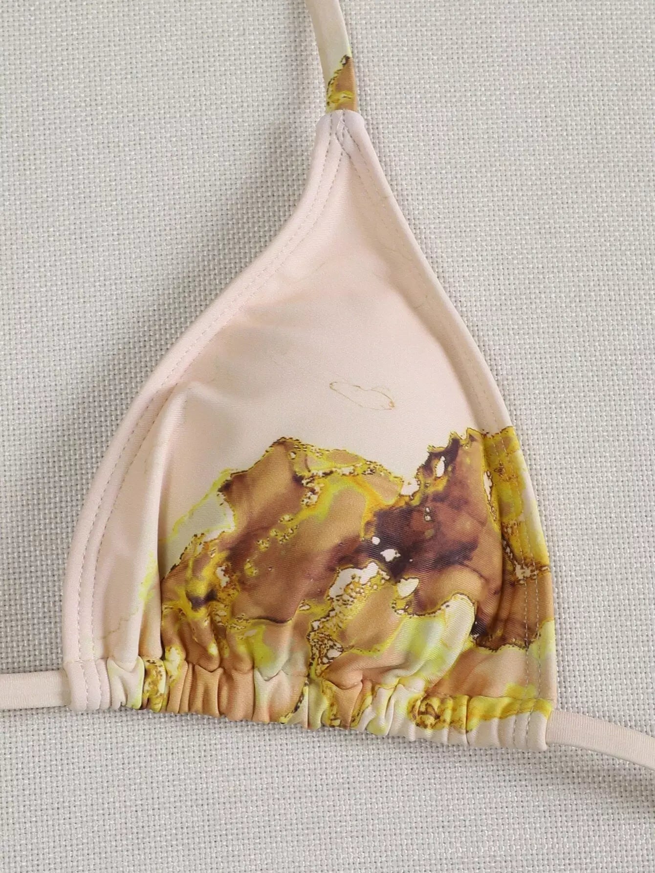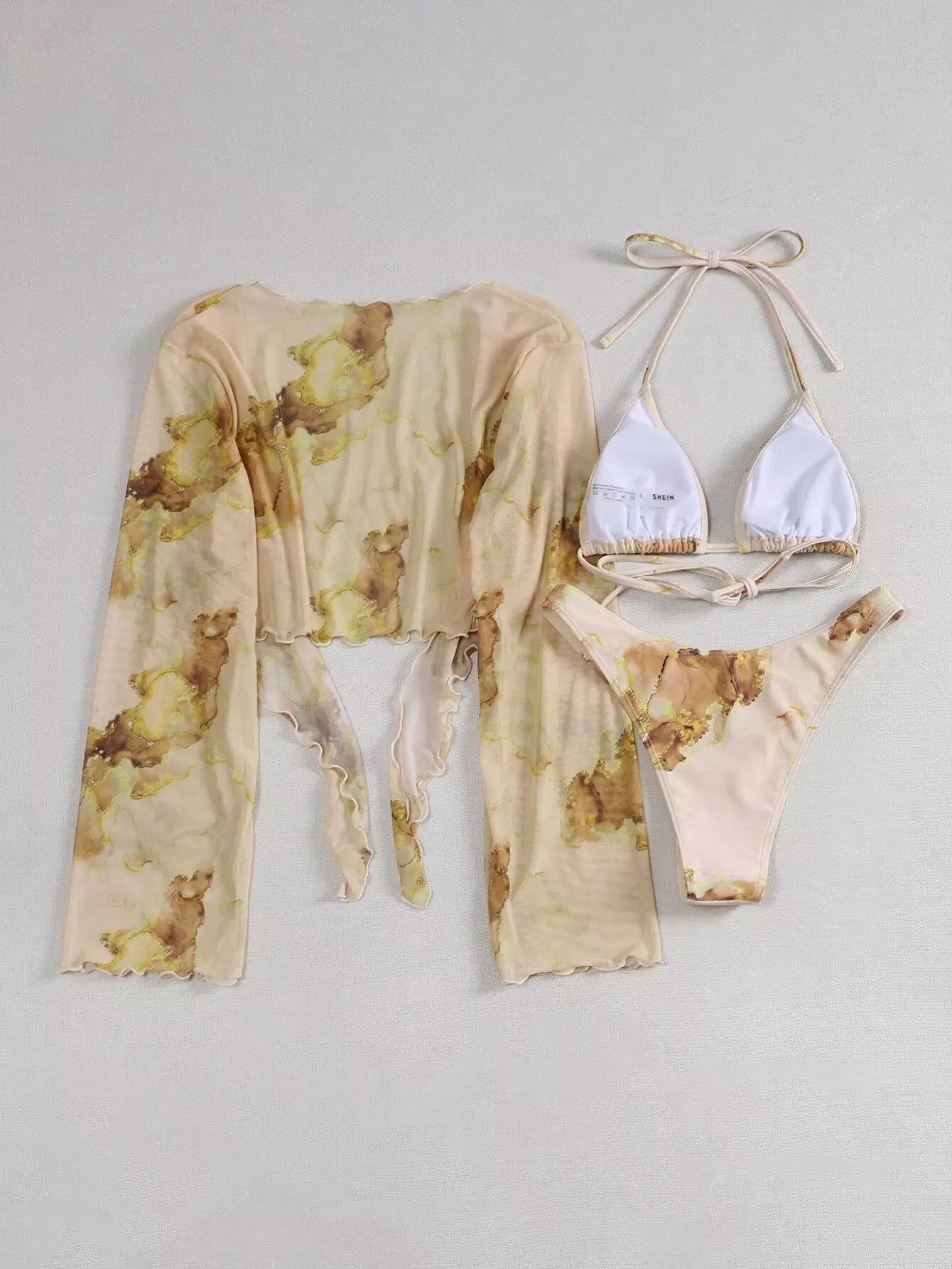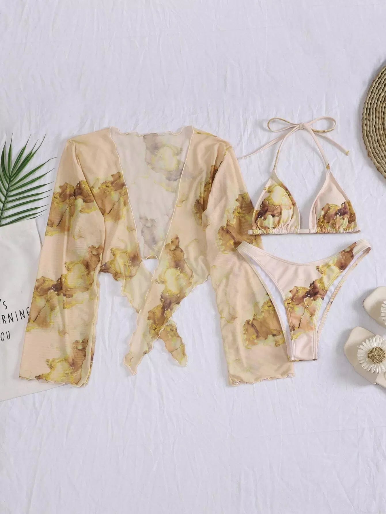 3pack Abstract Fluid Pattern Halter Bikini Swimsuit & Cover Up