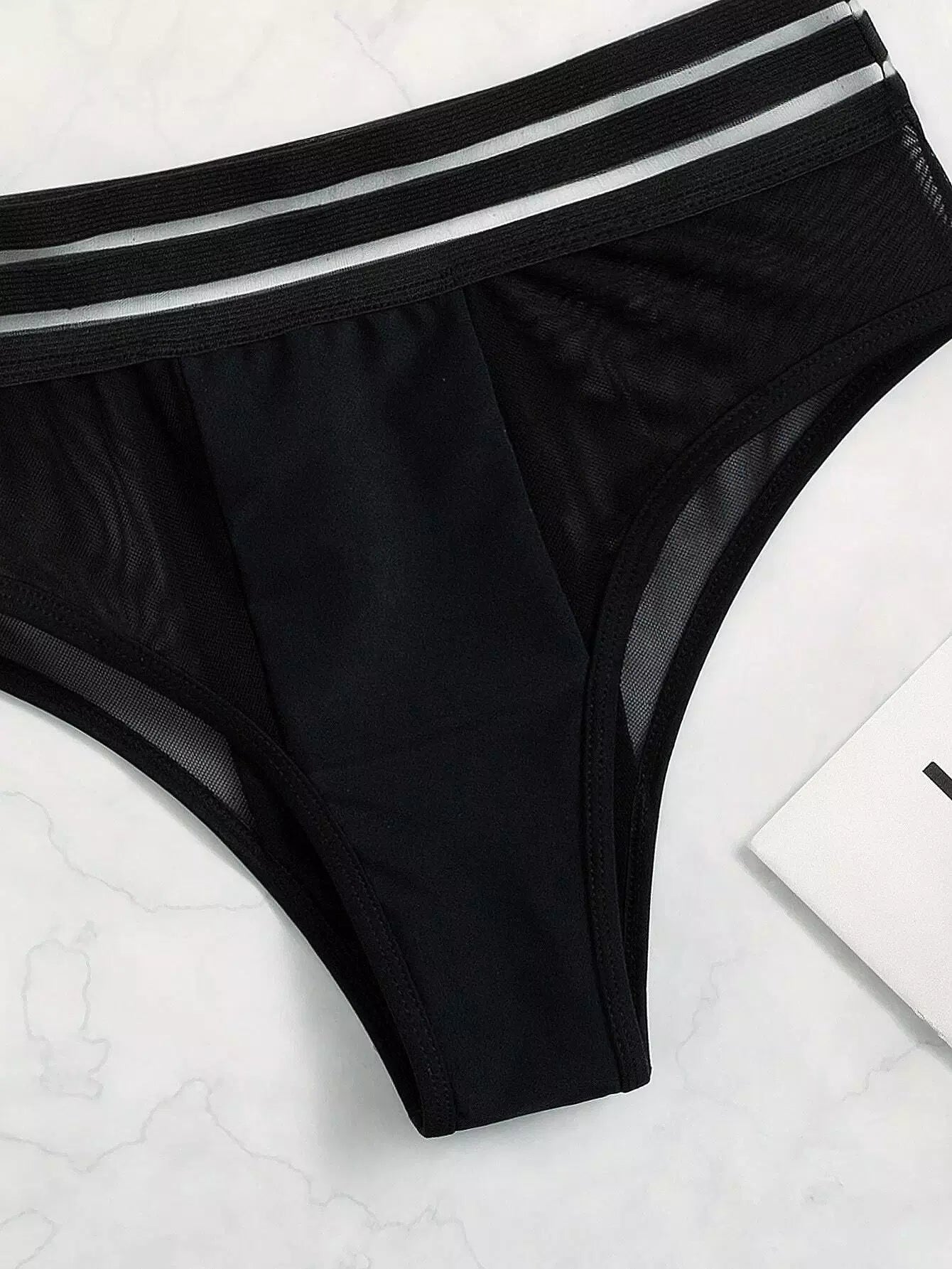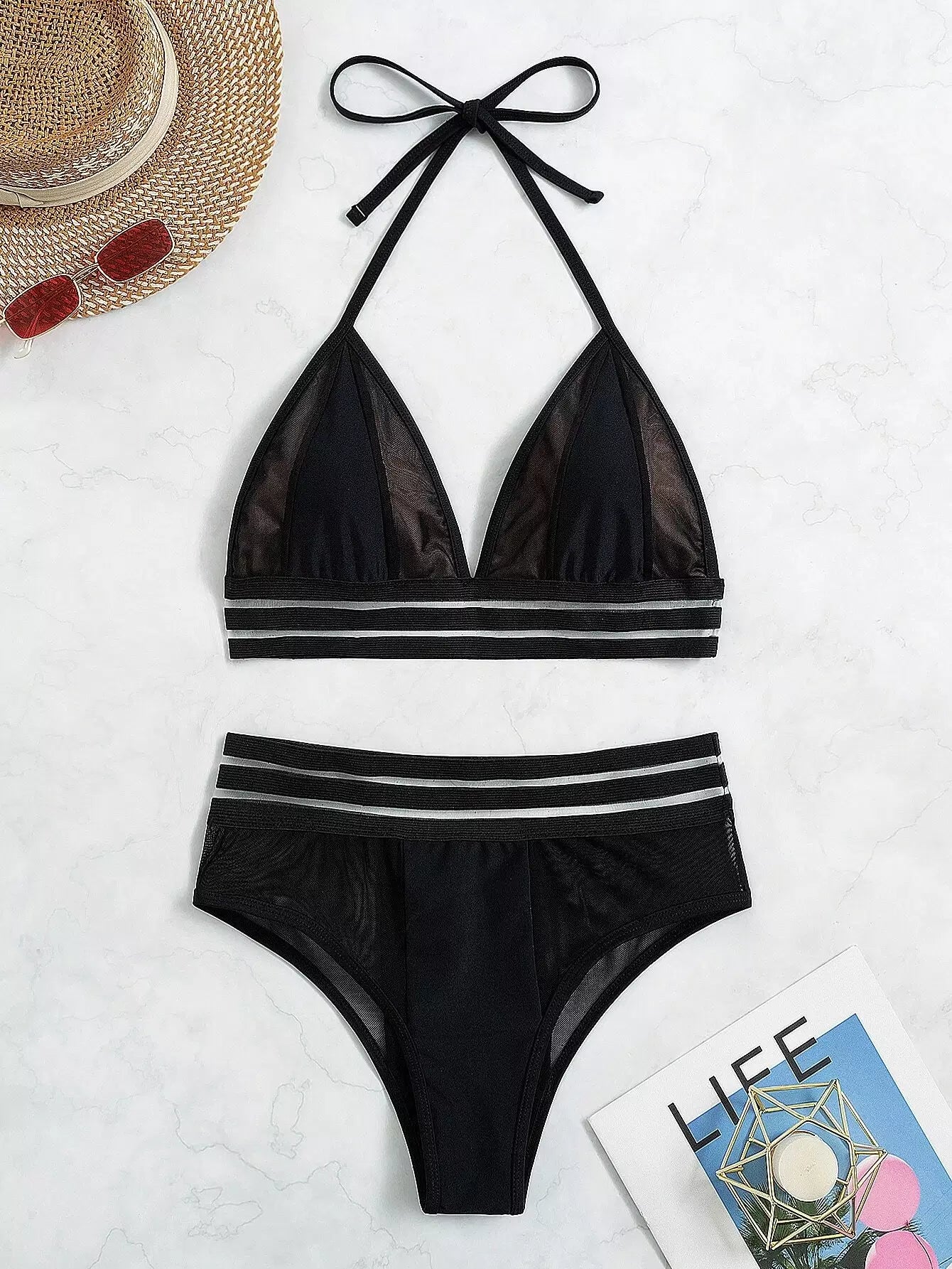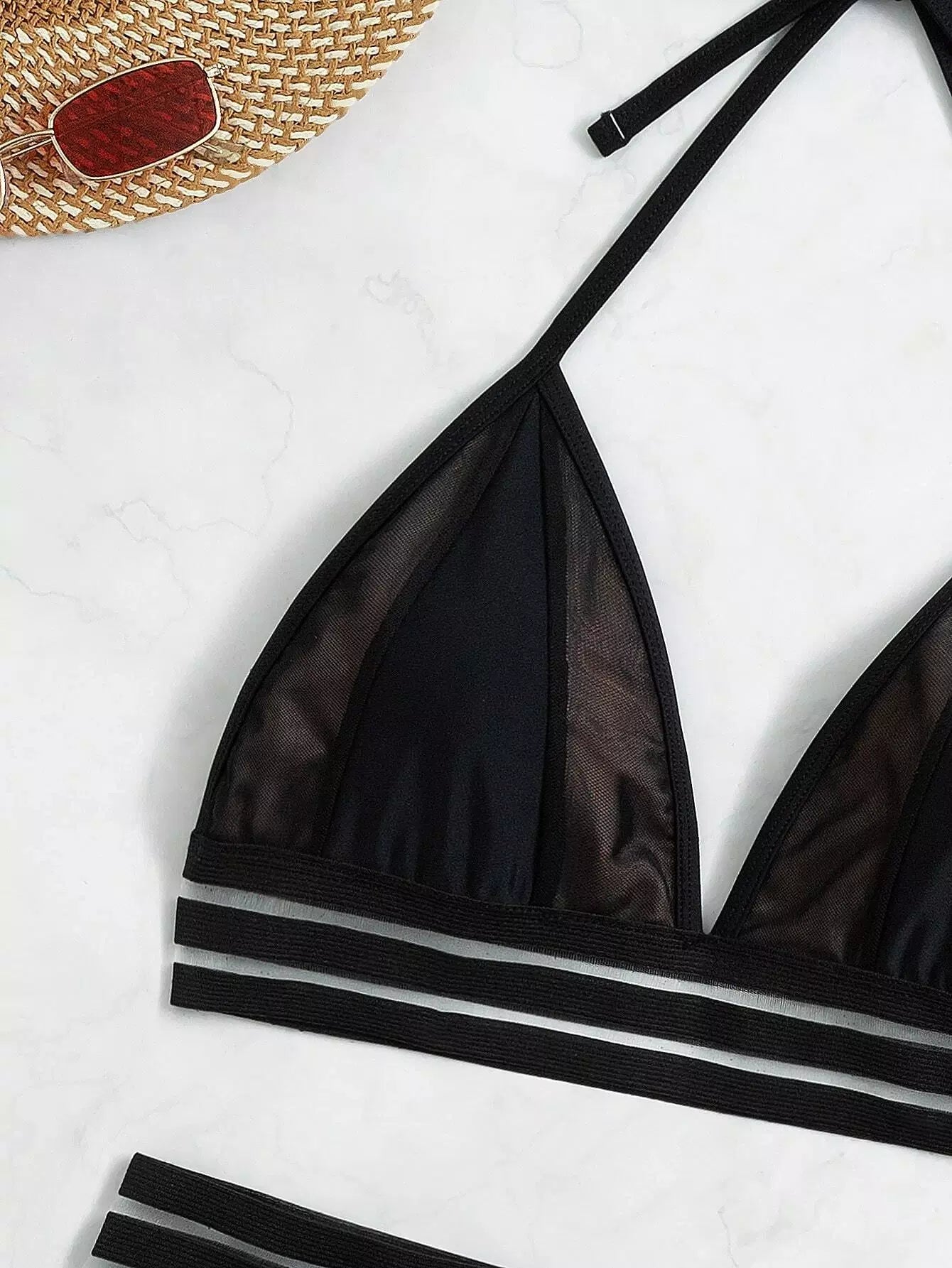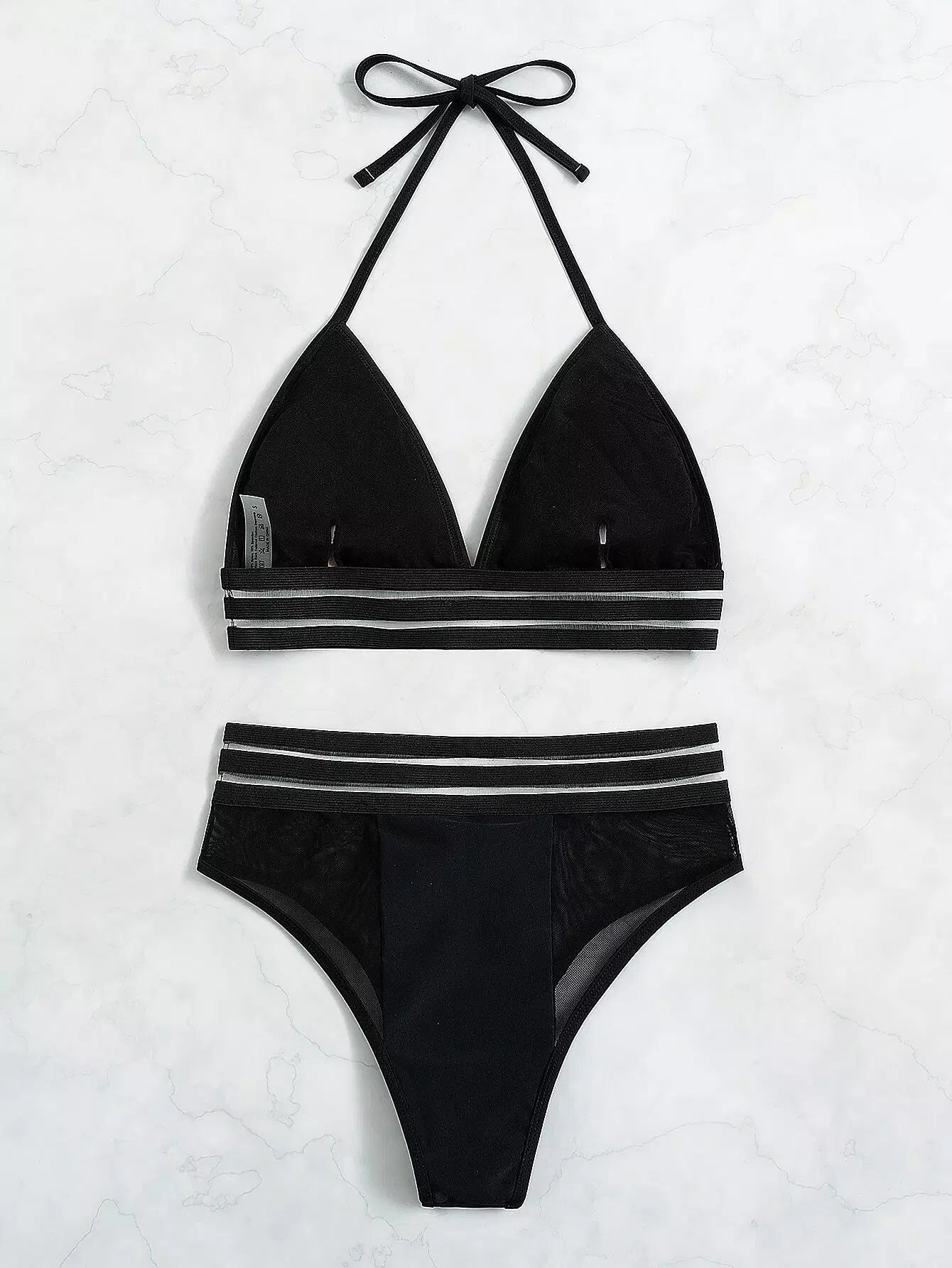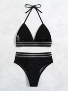 Contrast Mesh Tape Halter Triangle Bikini Swimsuit
