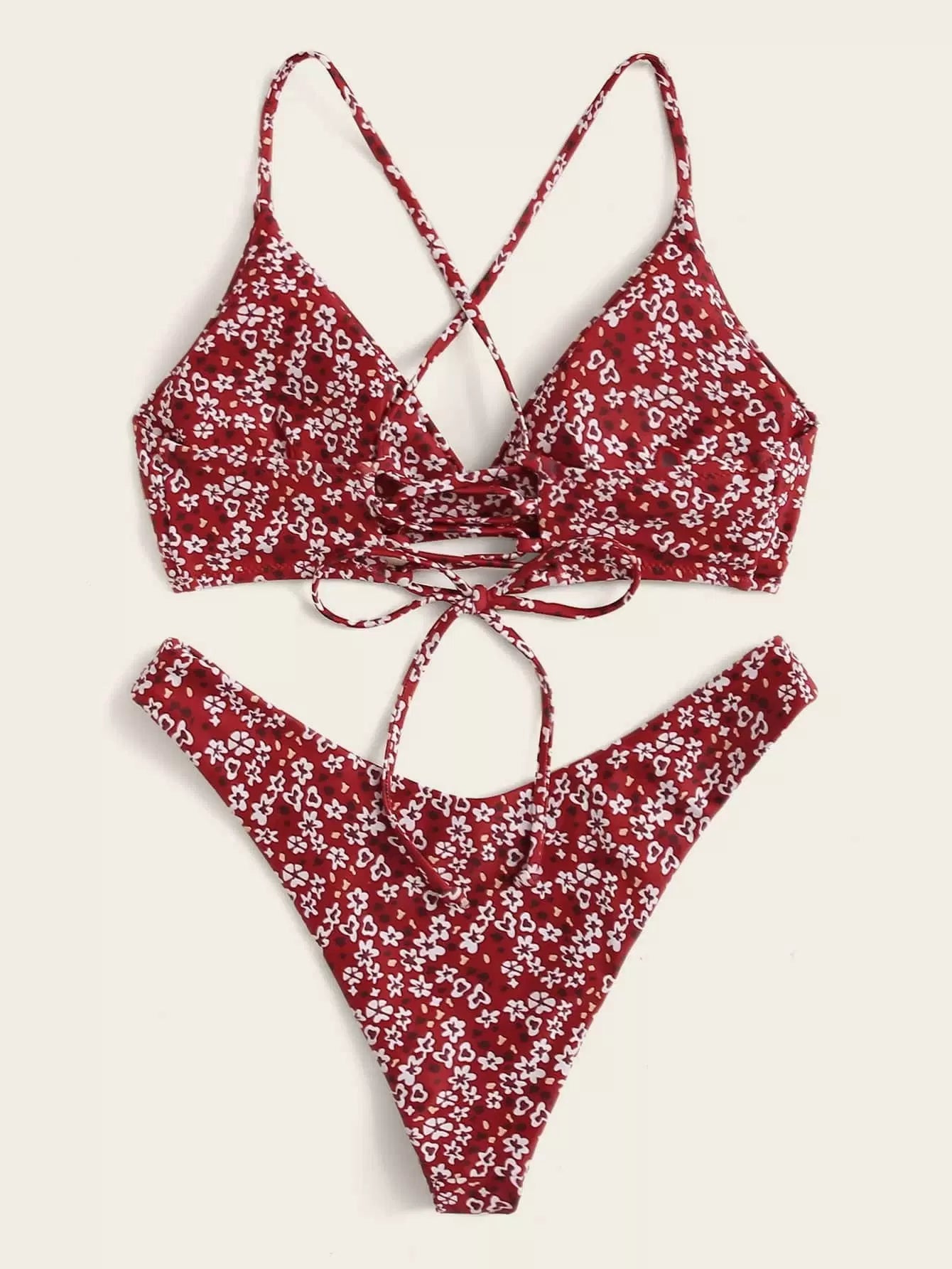 Women - Floral Random Print Lace-up Back Top With High Cut Bikini