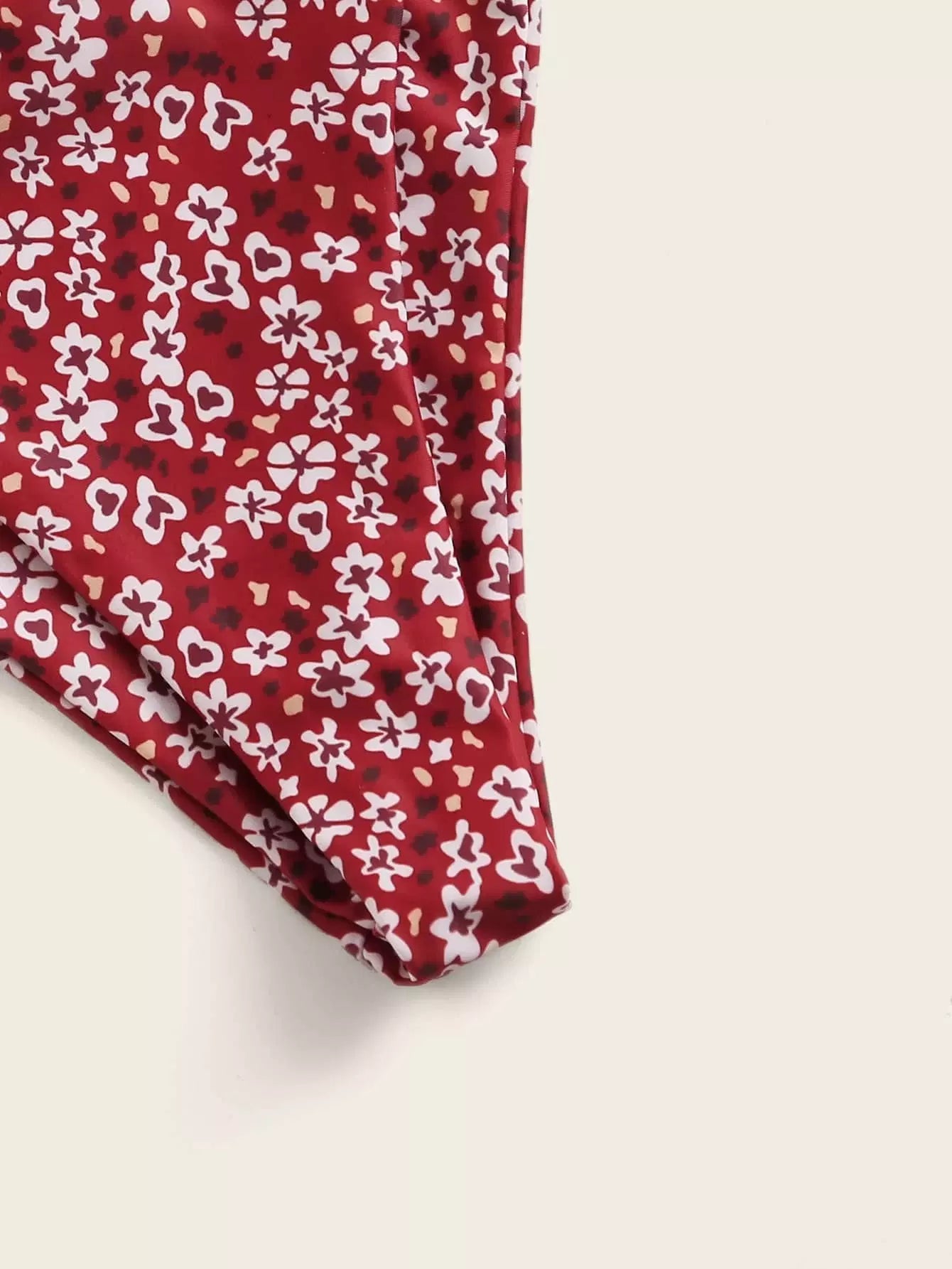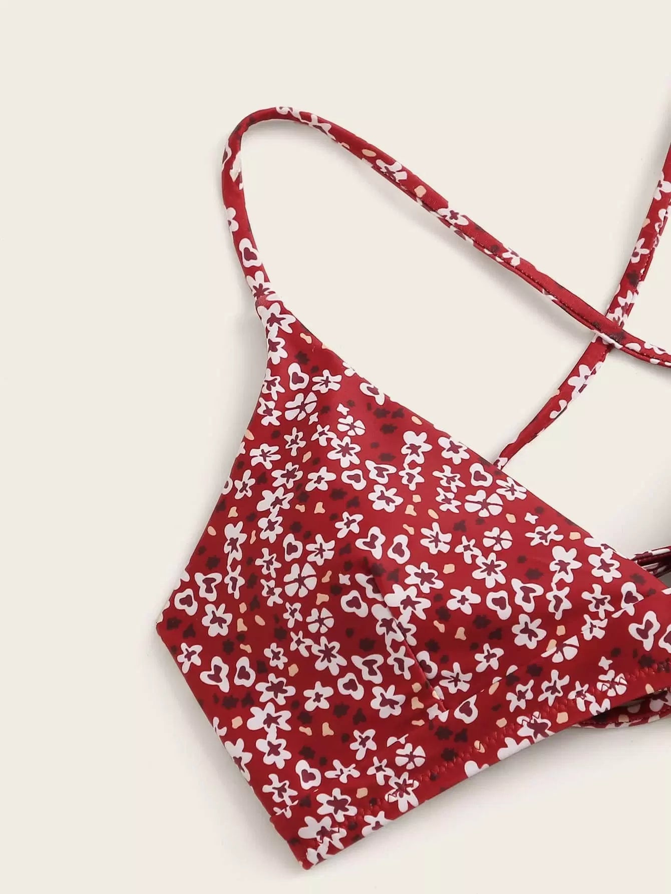 Floral Random Print Lace-up Back Top With High Cut Bikini