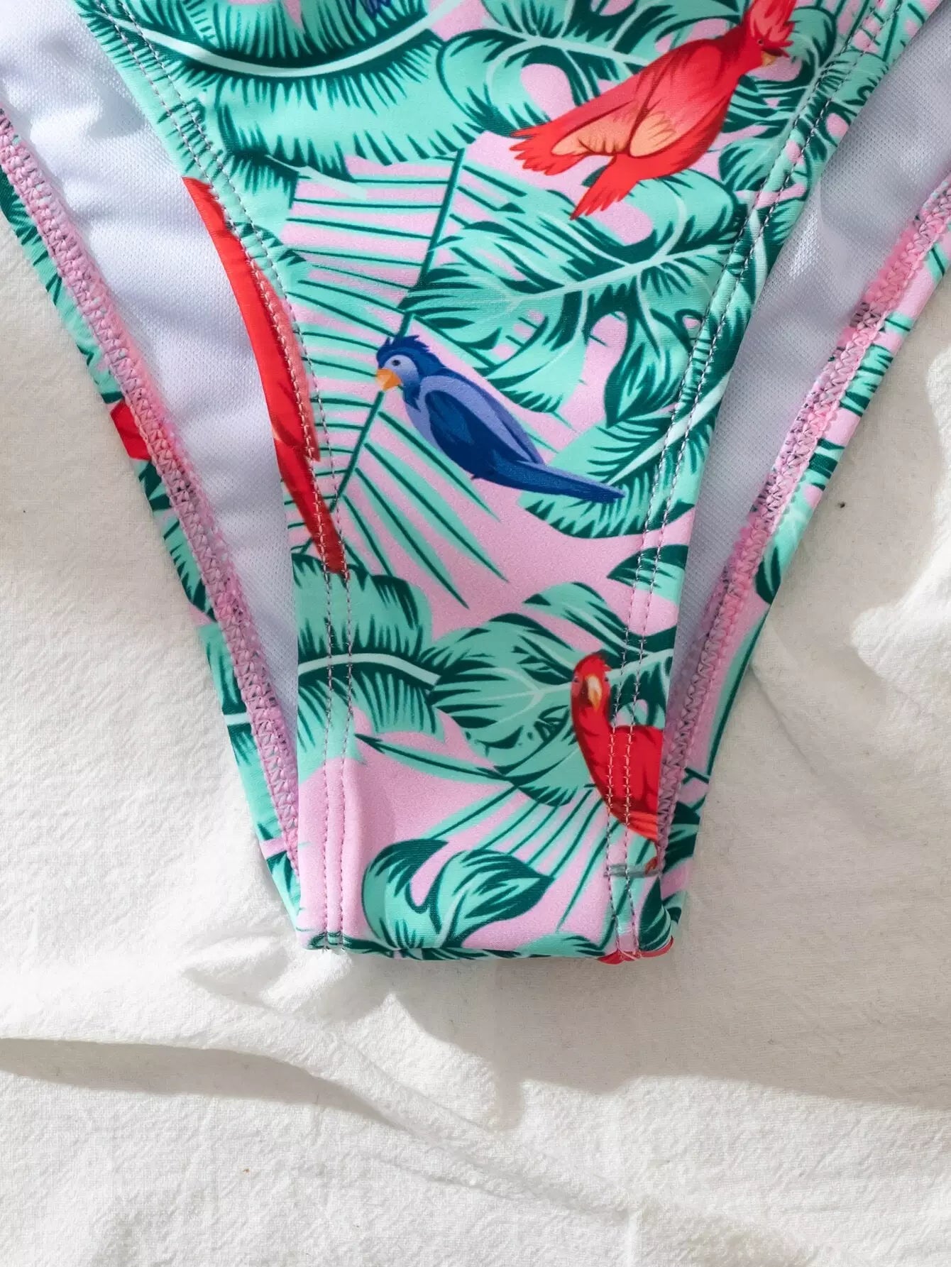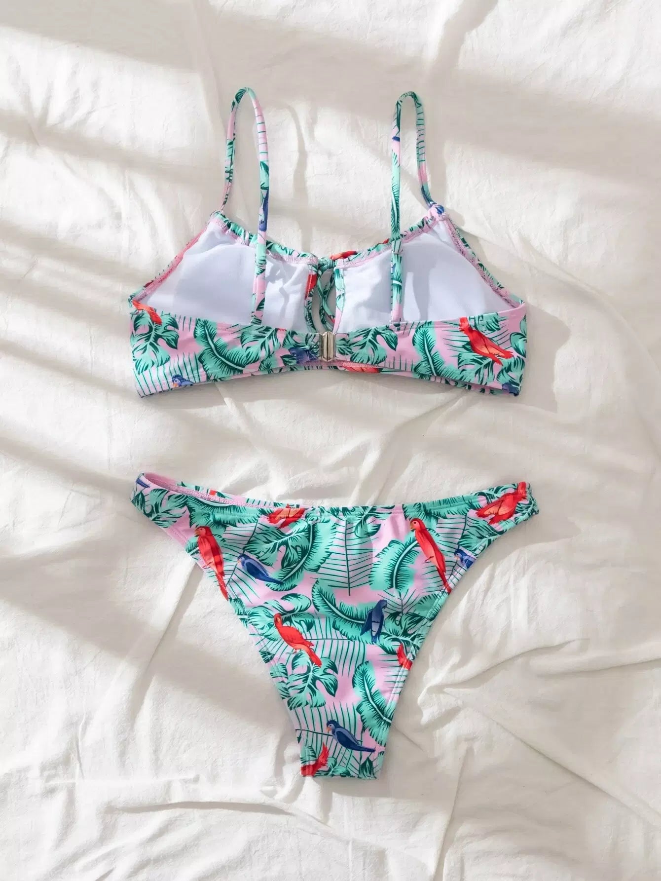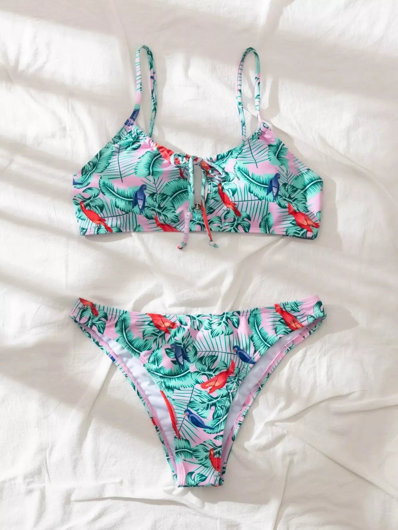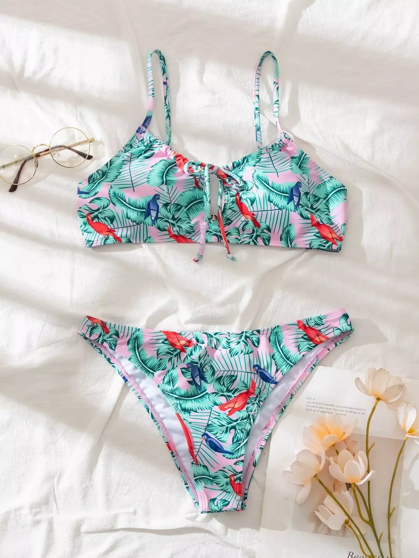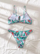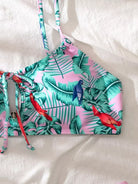 Plant & Bird Print Tie Front Bikini Swimsuit