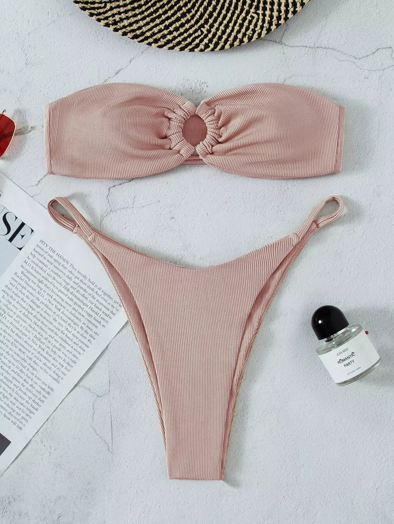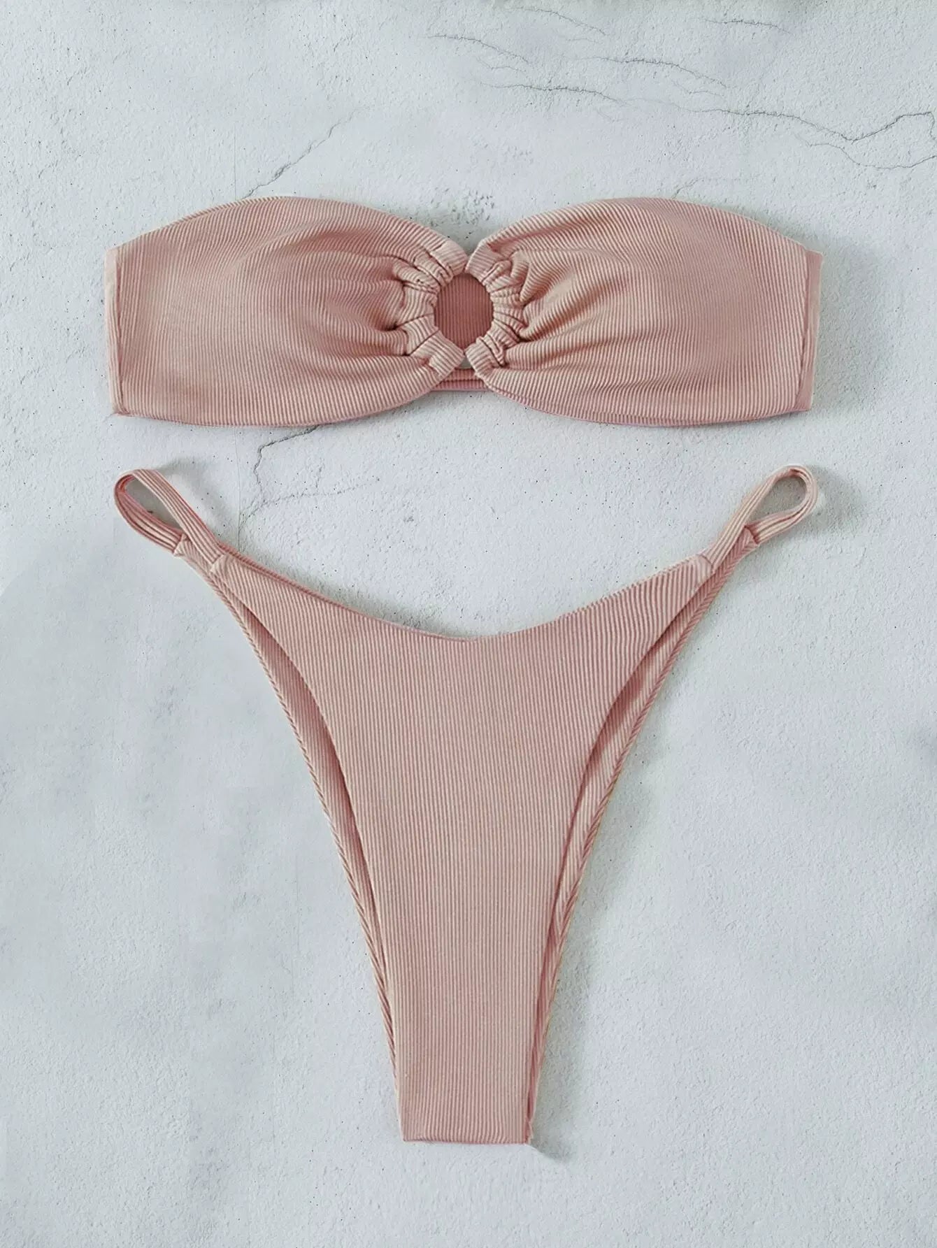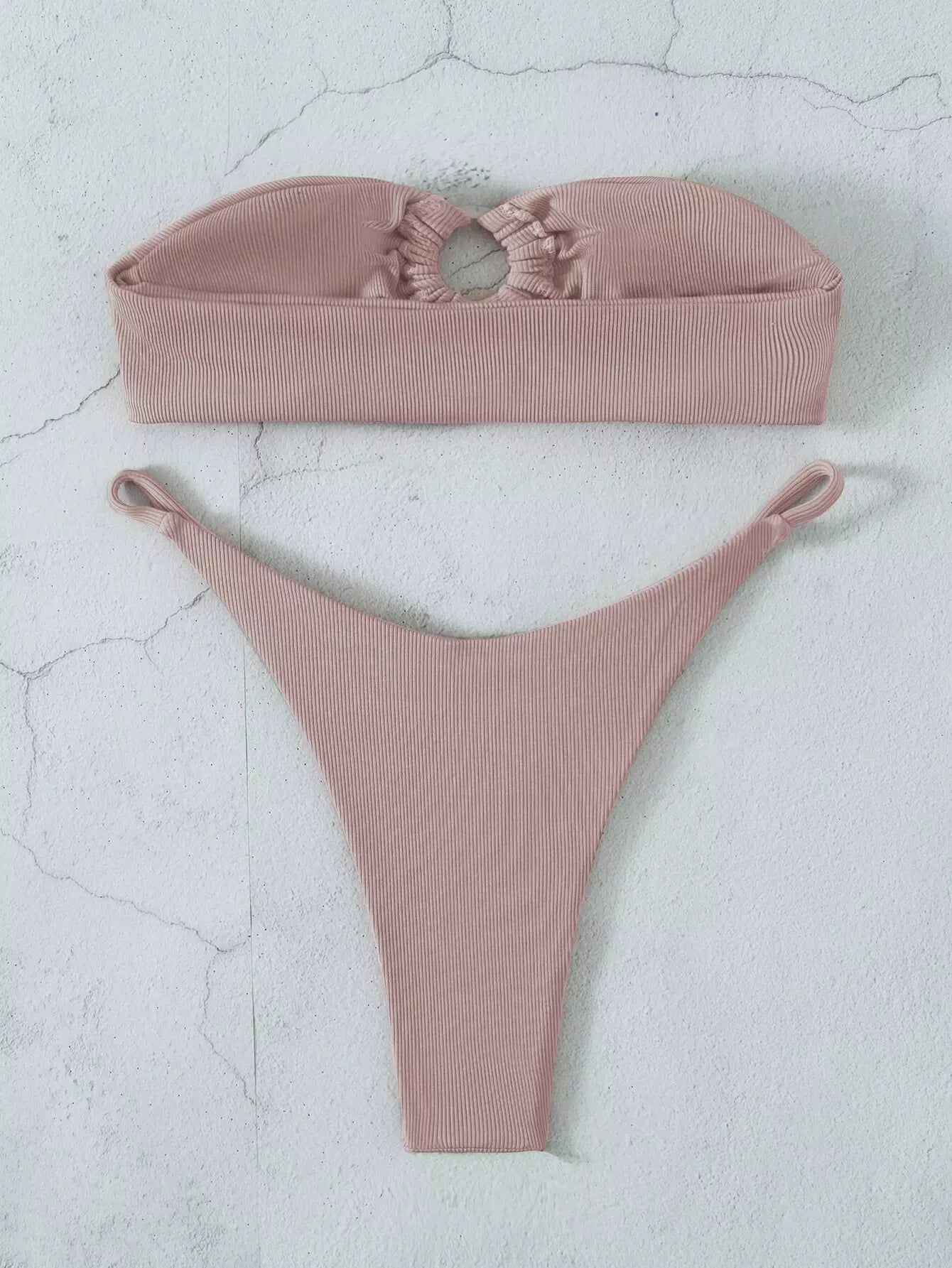 Rib Ring Linked Bandeau Thong Bikini Swimsuit