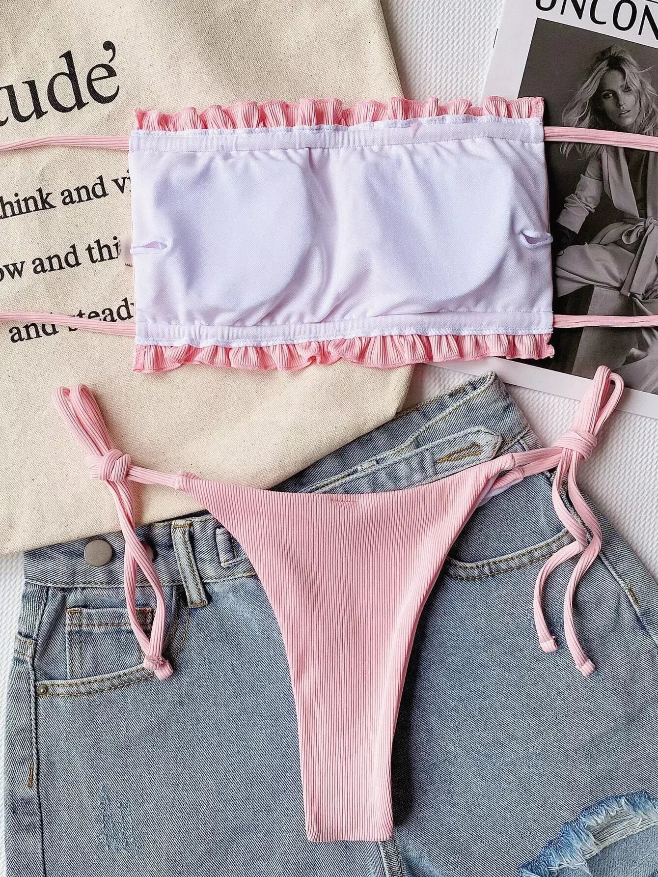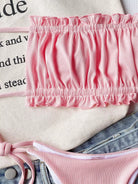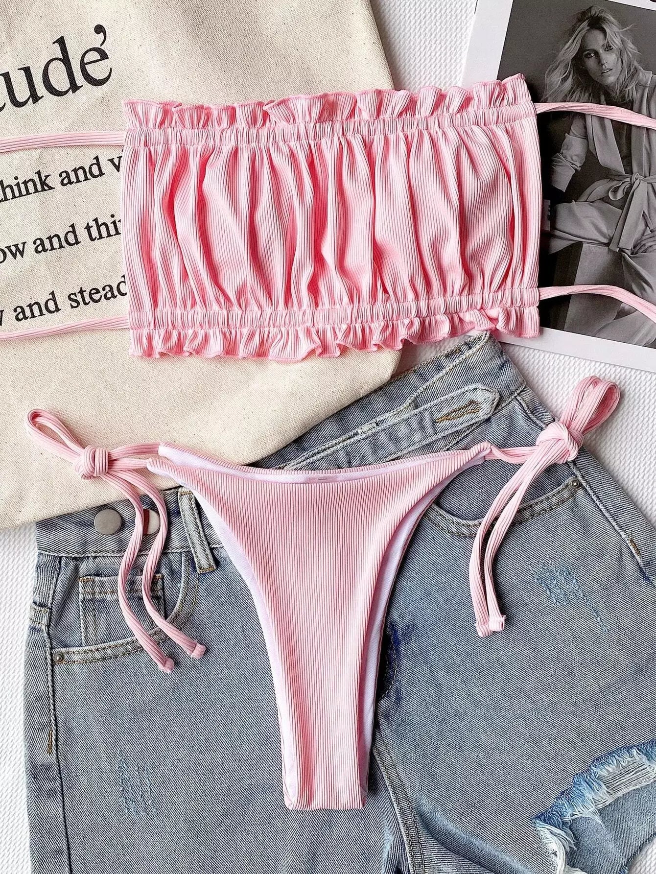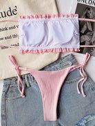 Rib Ruched Frill Bandeau Tie Side Bikini Swimsuit