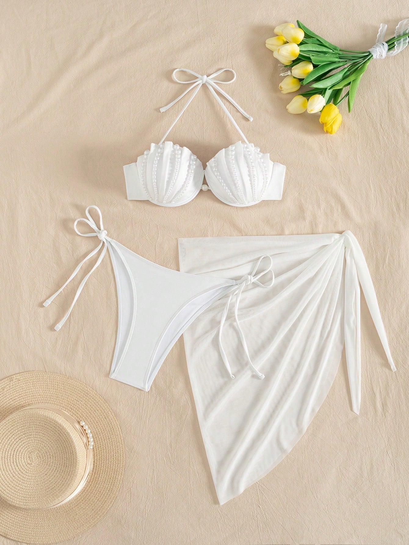 Swim SXY 3Pcs/Set Women Vacation Faux Pearl Chain Halter Top & Bowknot Side Tie Bottom & High Waist Skirt
