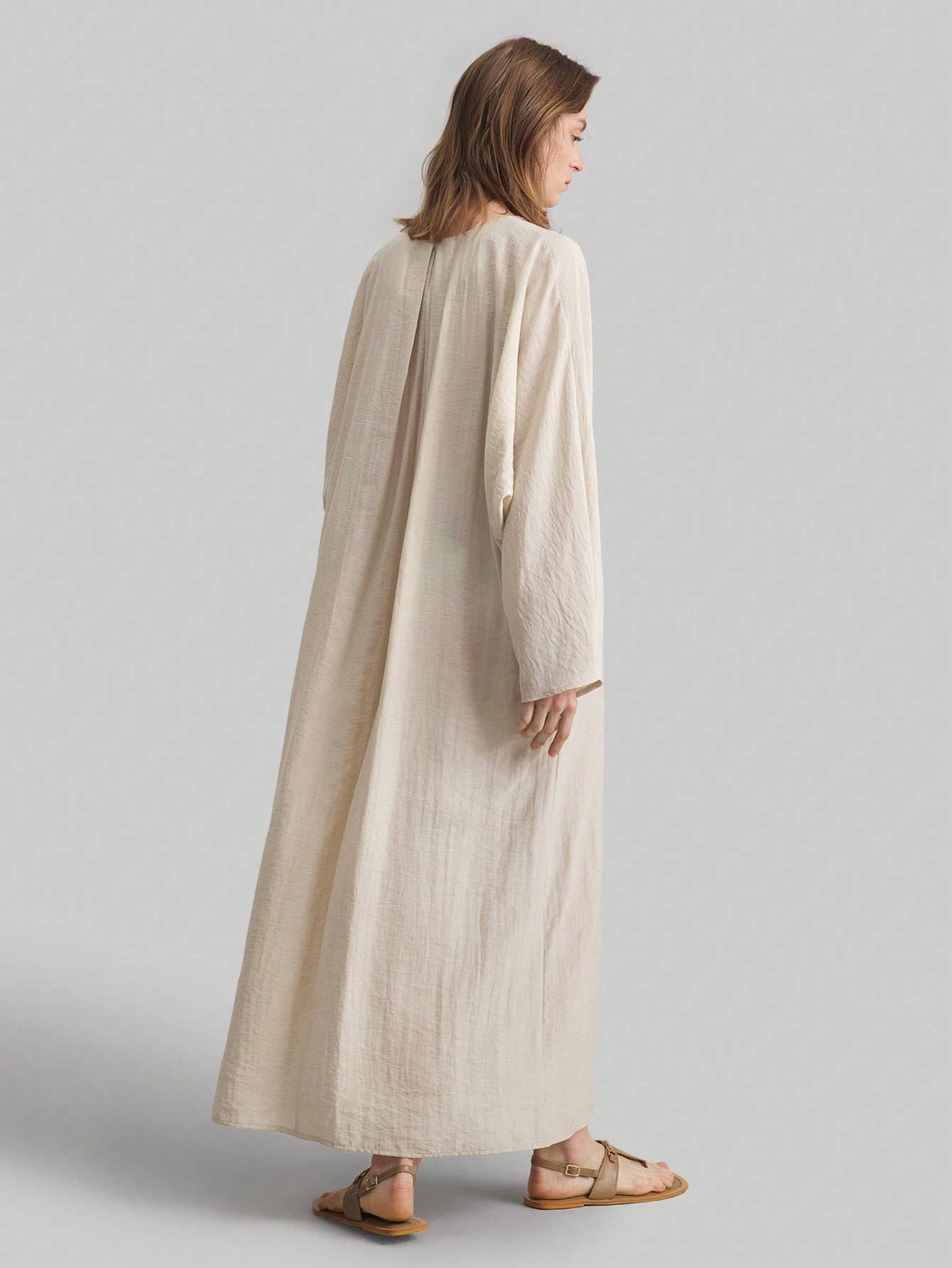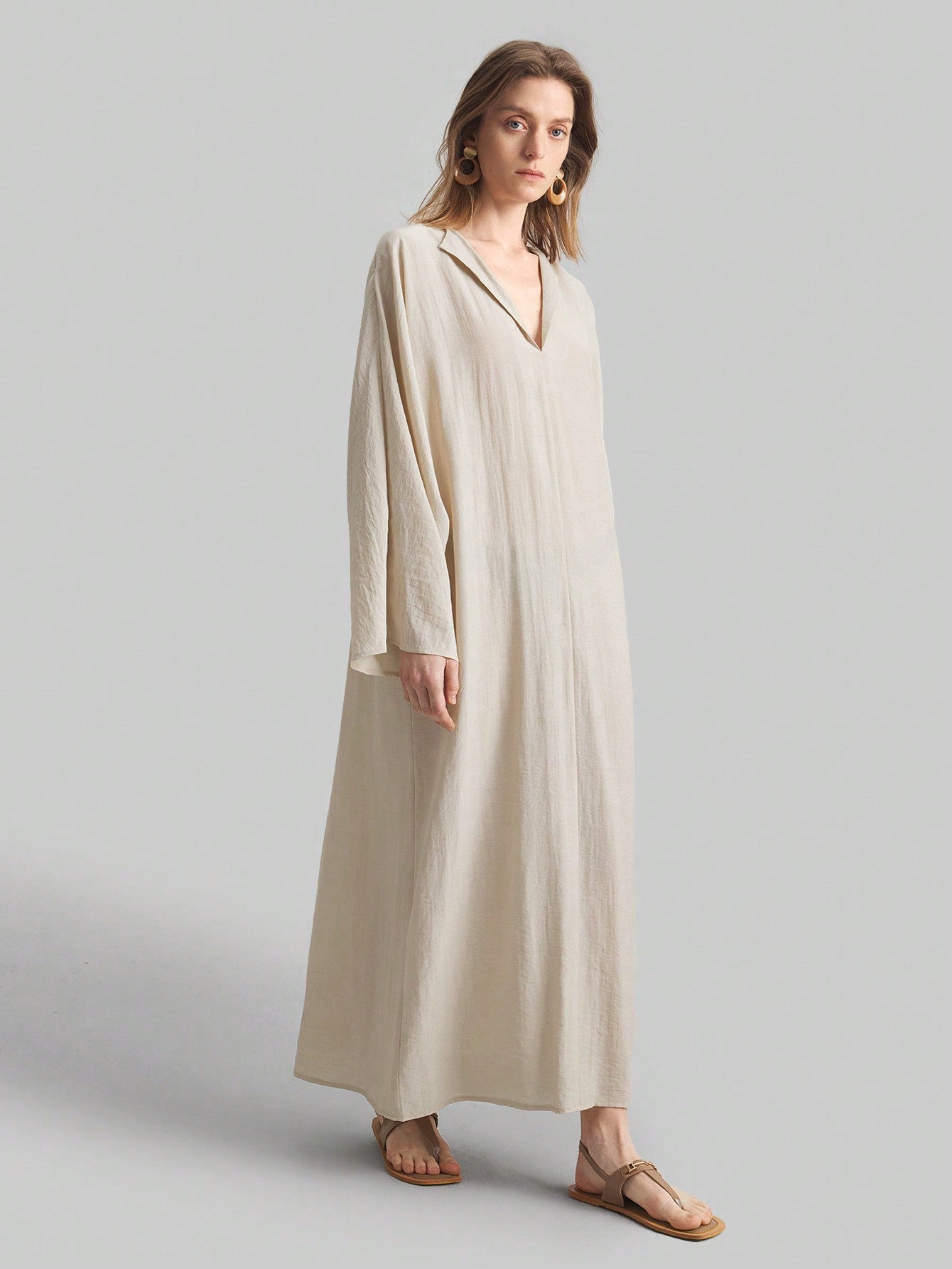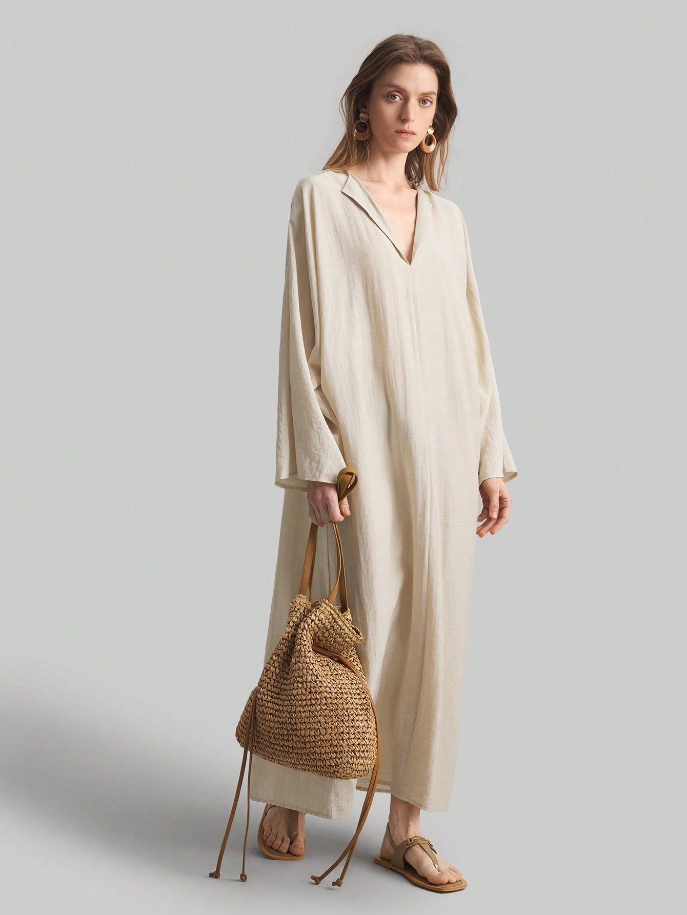 Ontre Women's Light Gray Four-Season Bohemian Resort Dress, Dropped Shoulder Long Sleeve Loose Straight