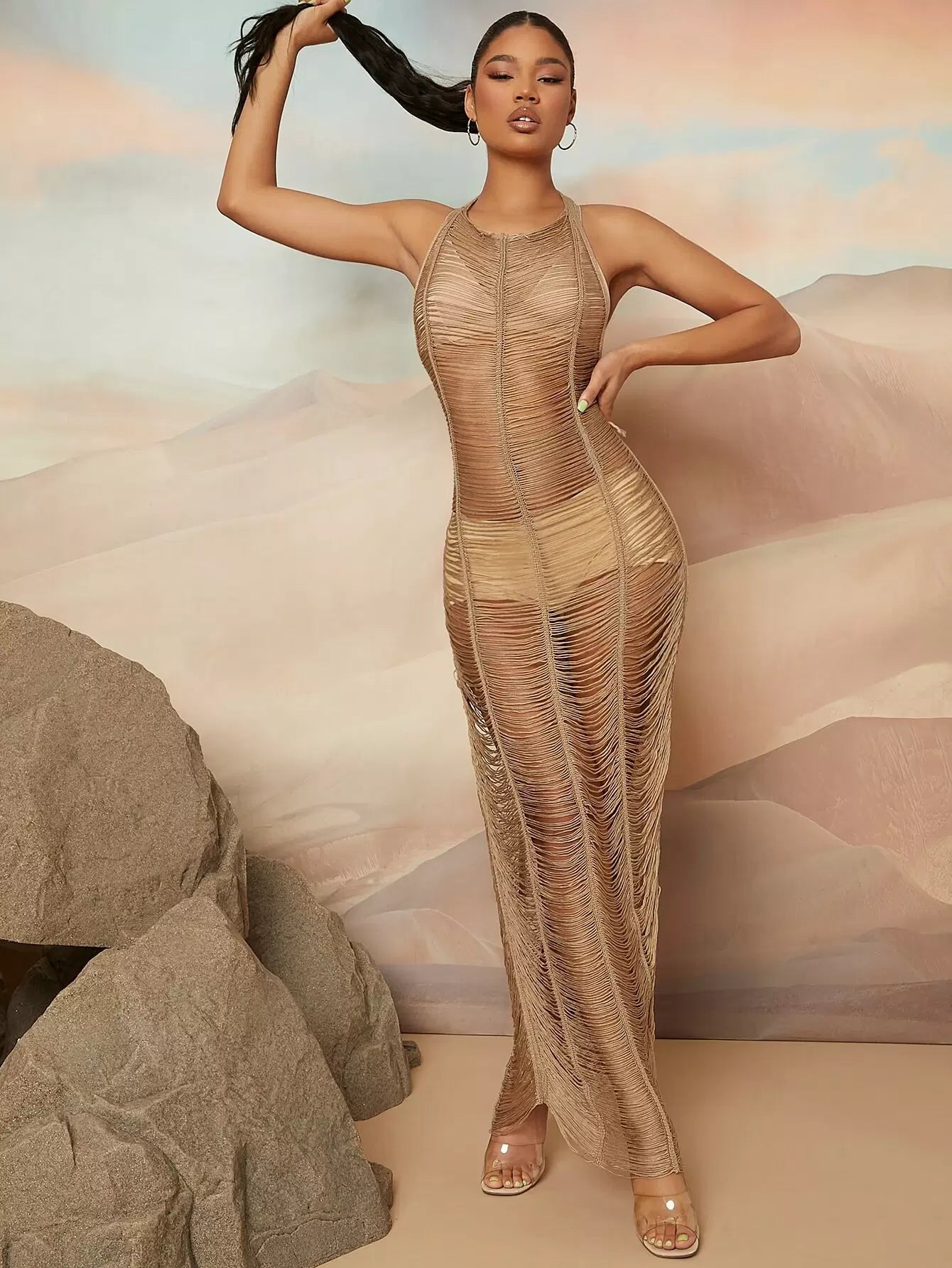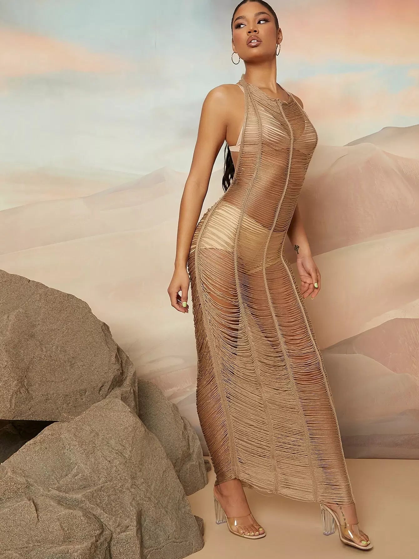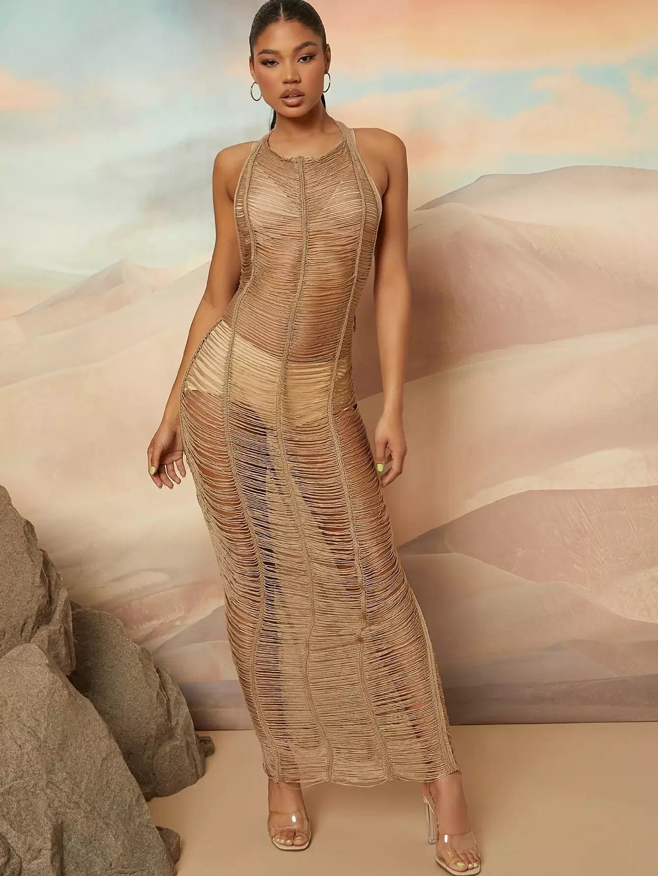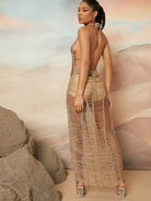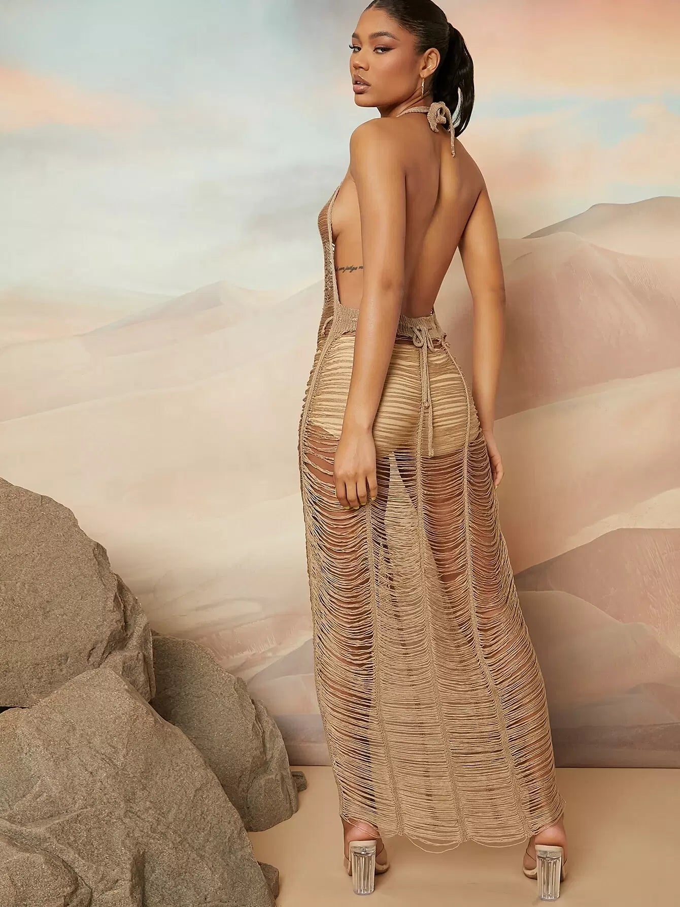 Sheer Crochet Knit Plunging Halter Maxi Dress