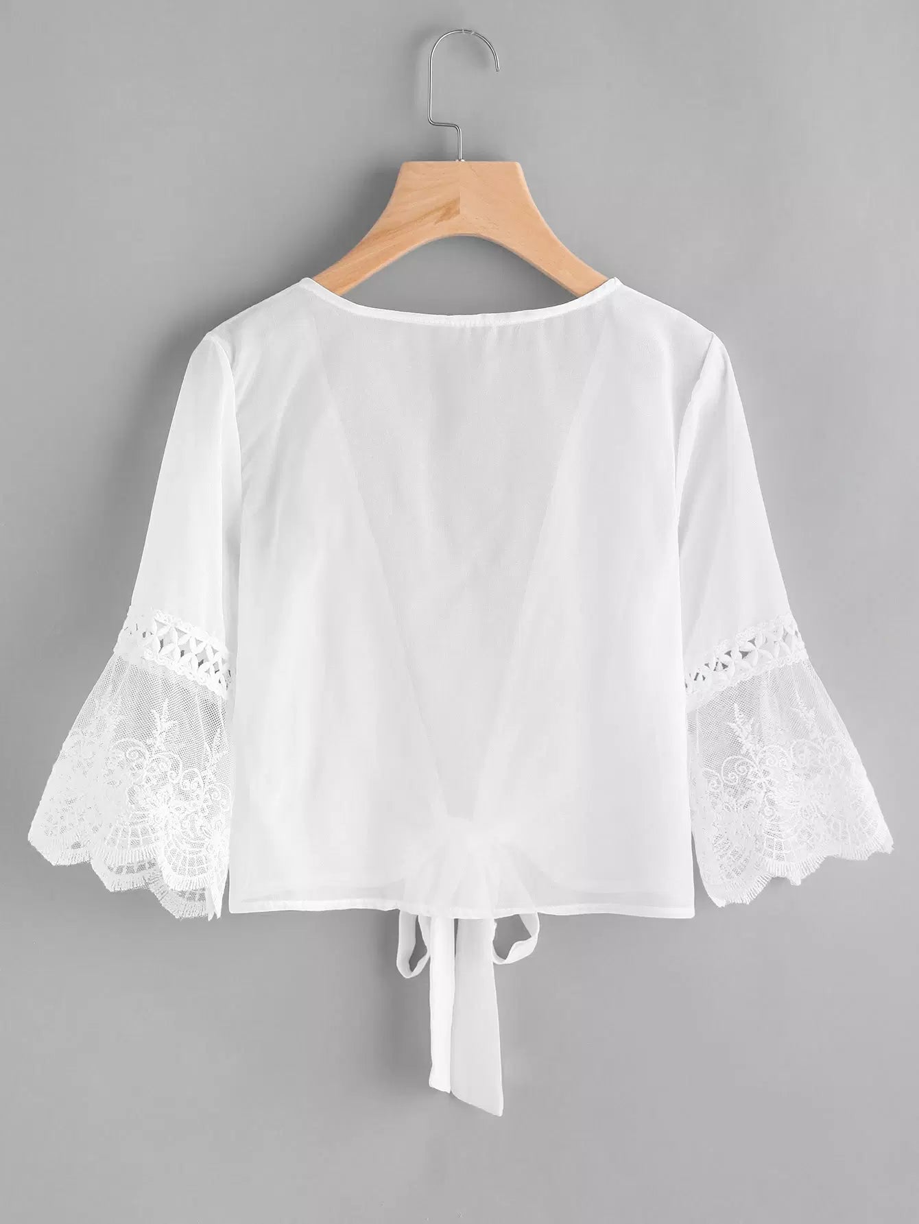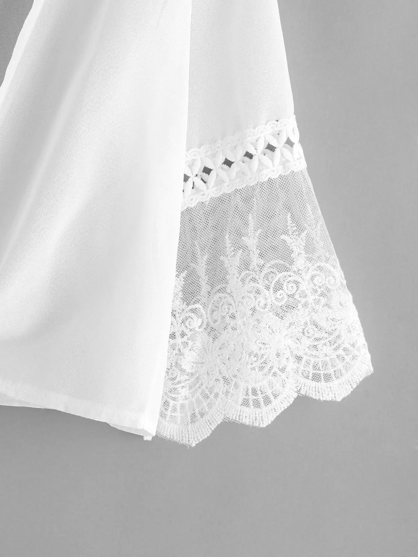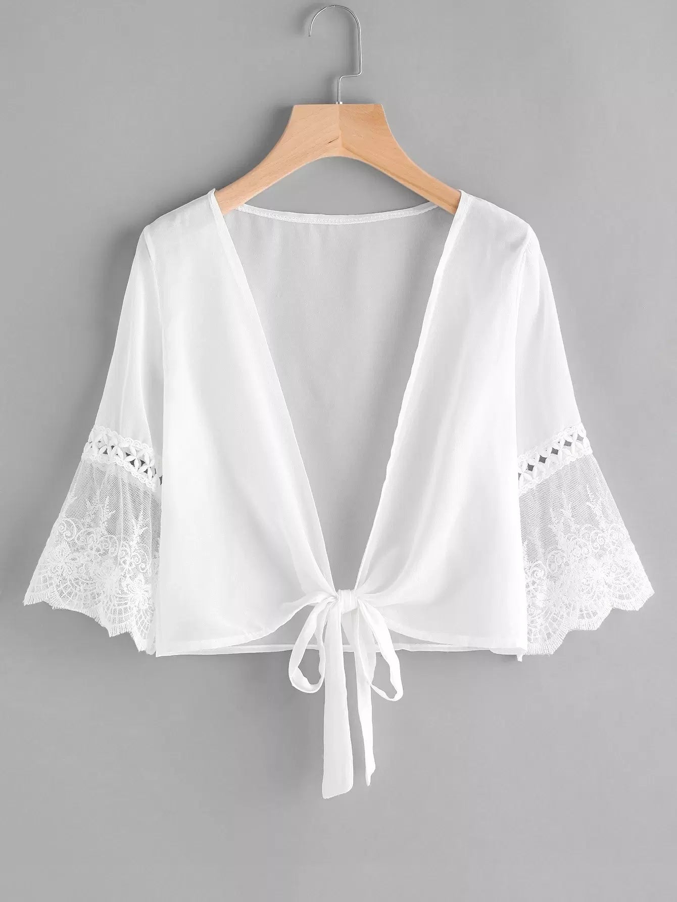 Embroidered Mesh Fluted Sleeve Self Tie Kimono