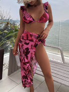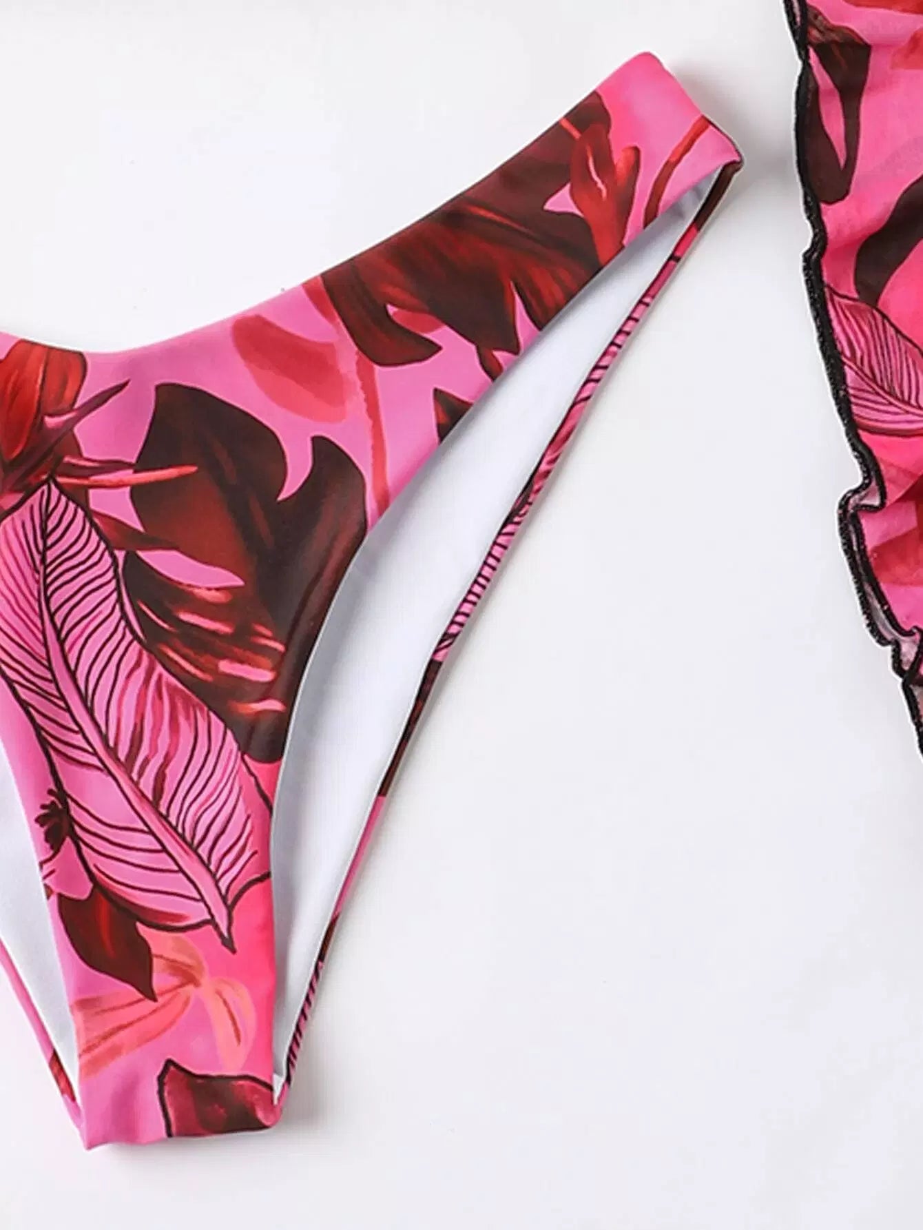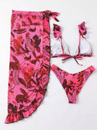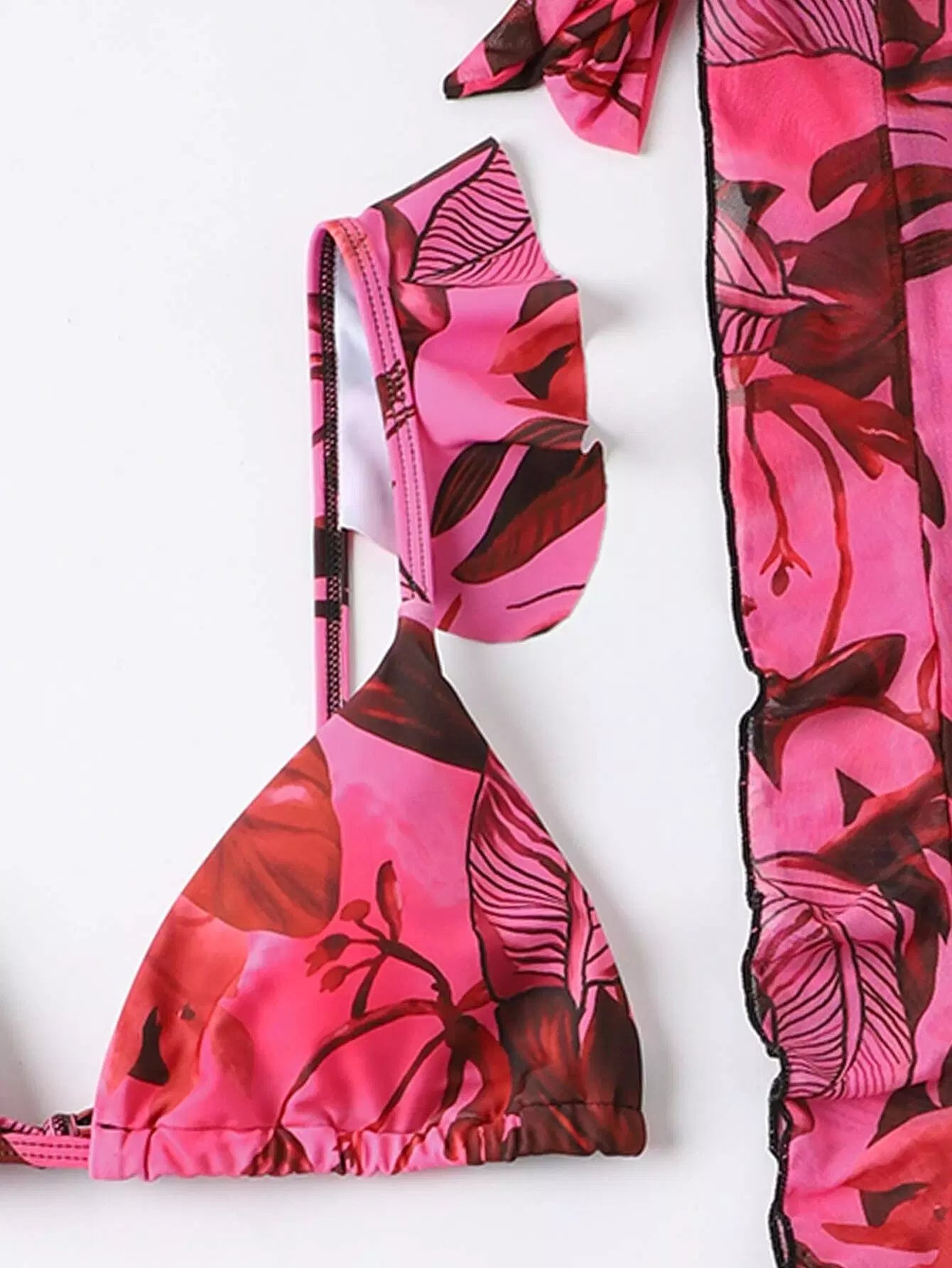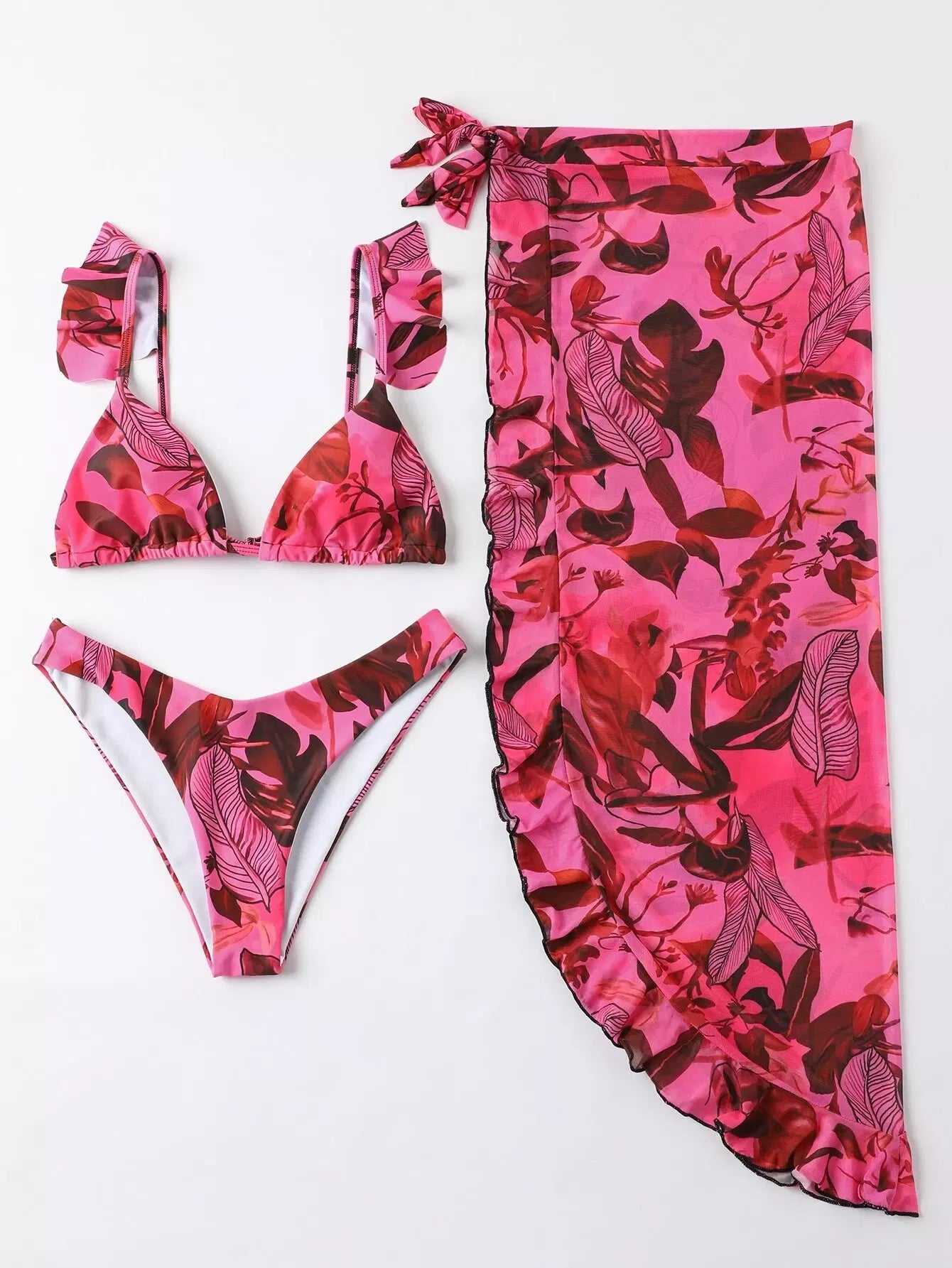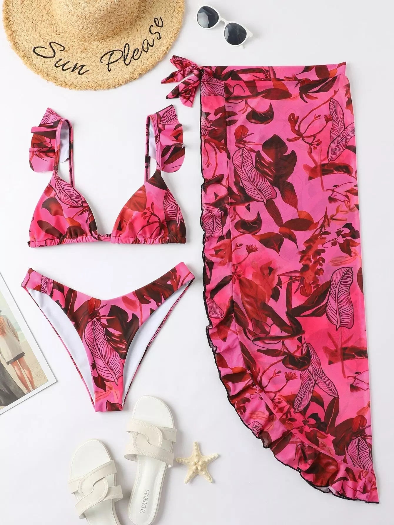 3pack Plant Print Triangle Bikini Swimsuit & Beach Skirt