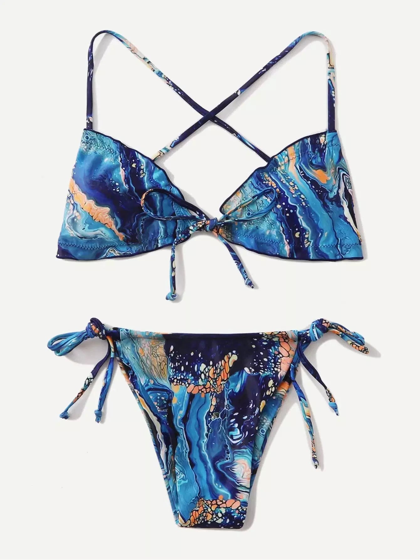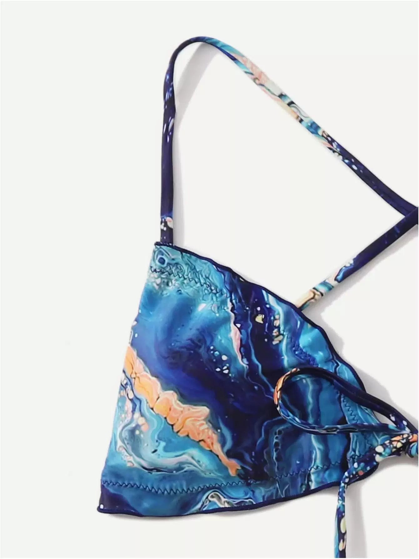 Liquid Marble Print Lettuce Trim Triangle Bikini Swimsuit