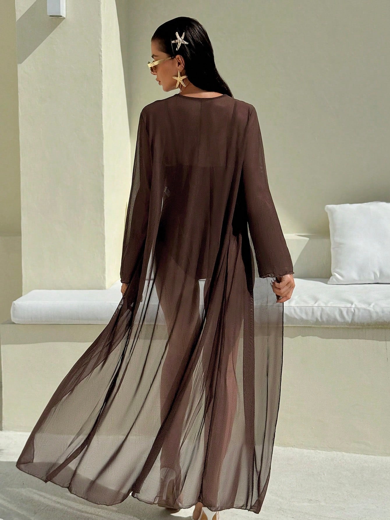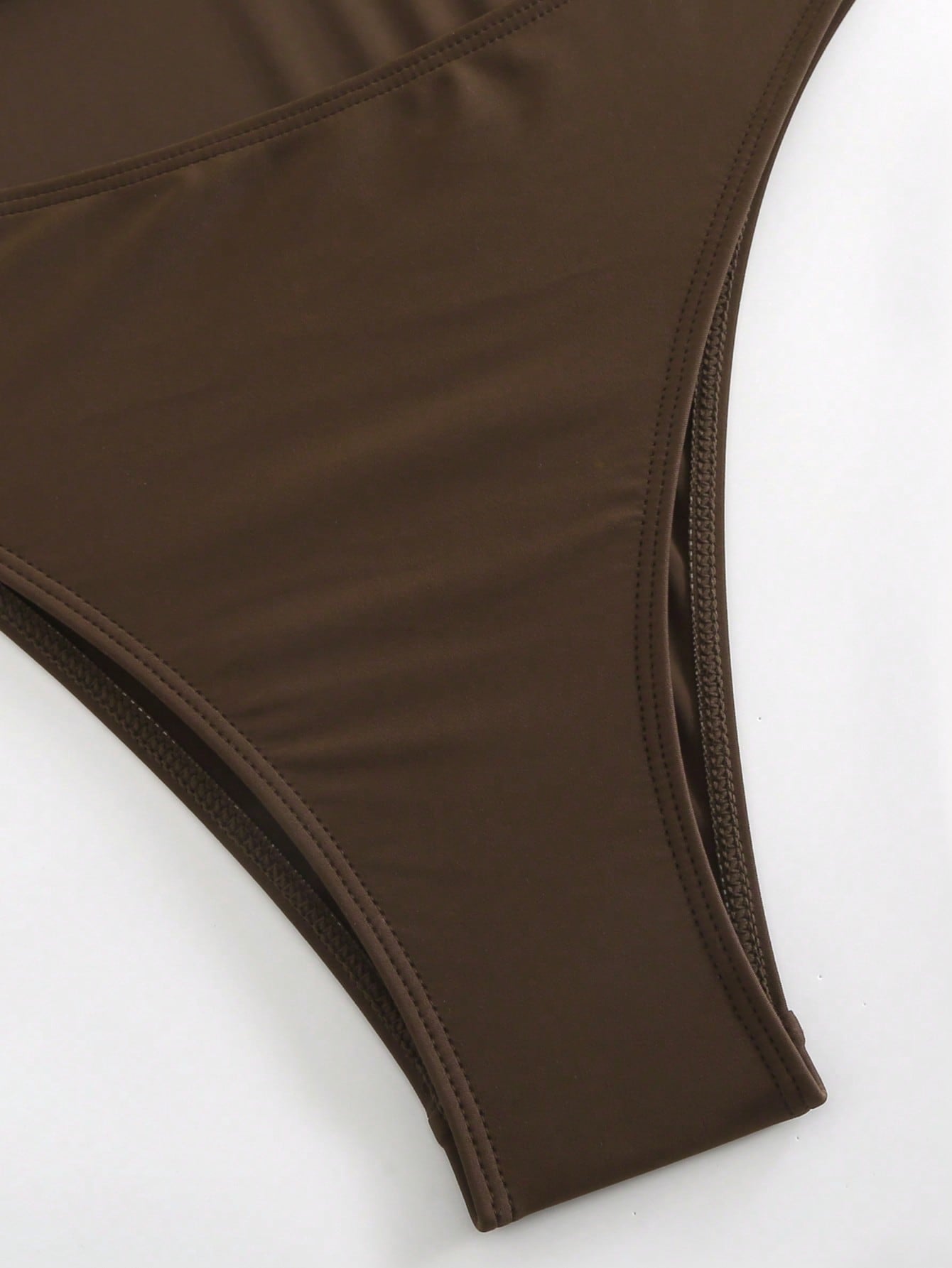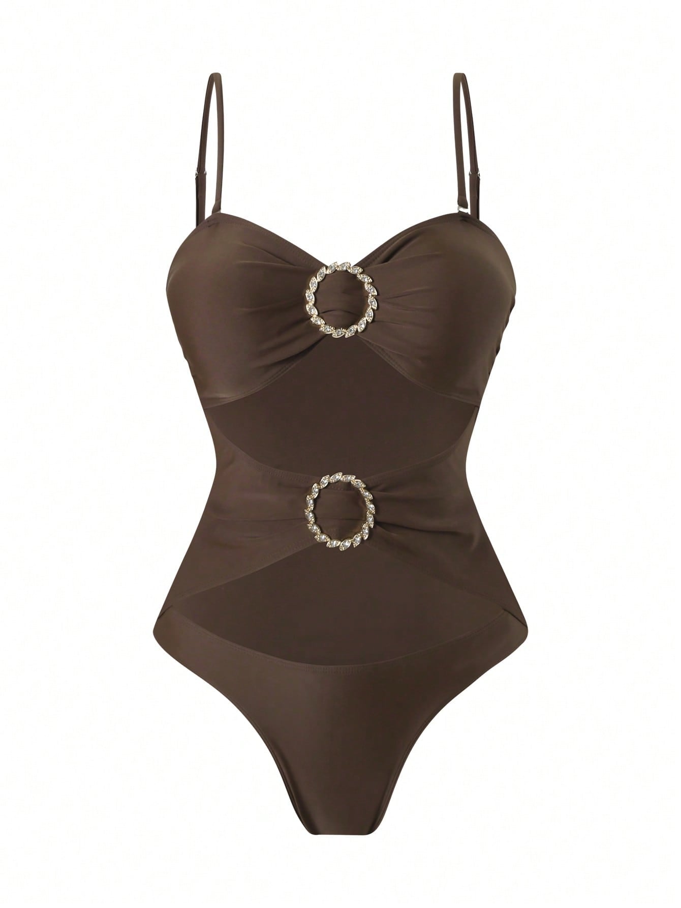 Swim SXY Summer Women Hollow-Out Circle Ring Decor Coffee Brown Removable Spaghetti Strap Swimsuit +