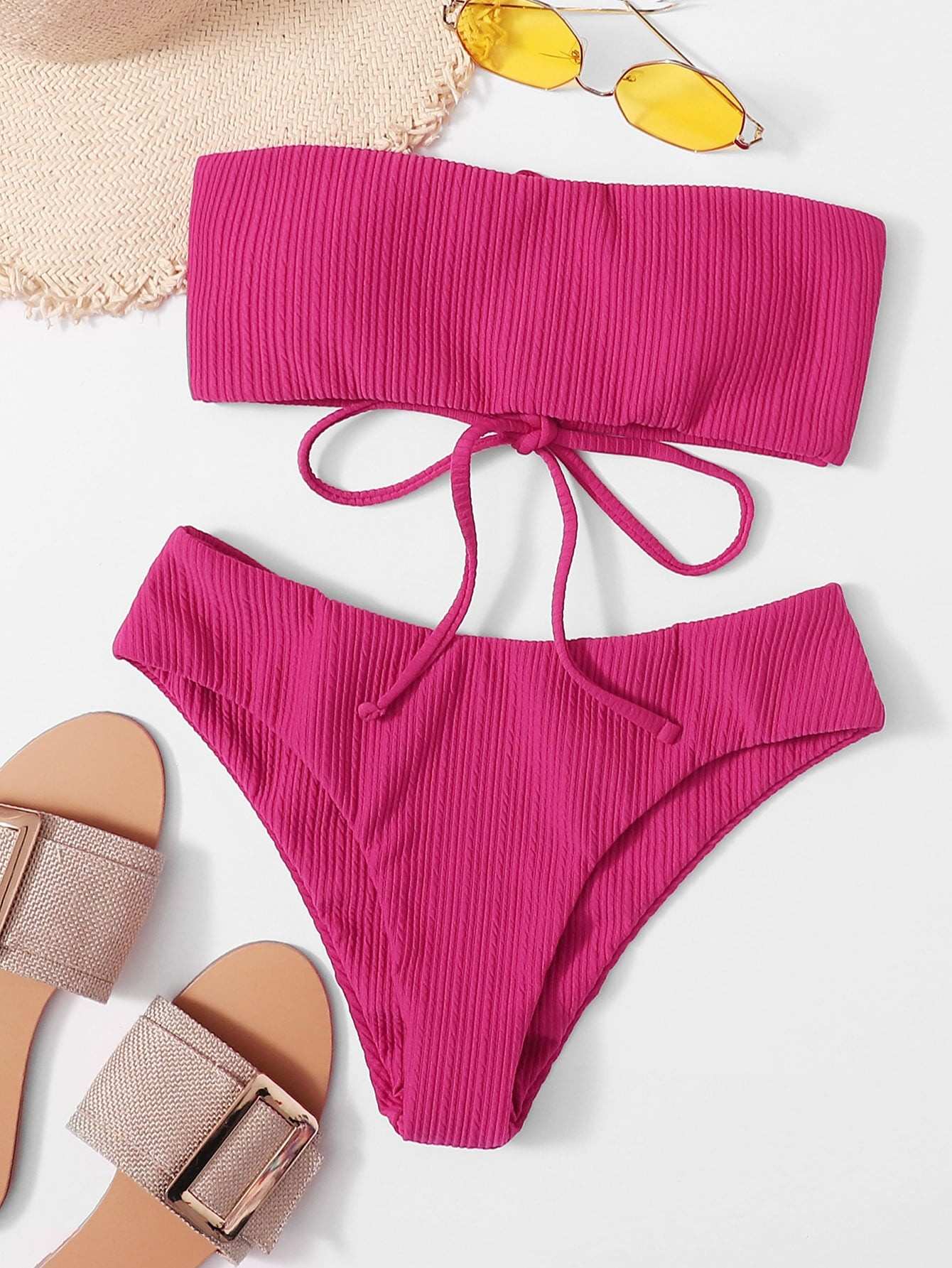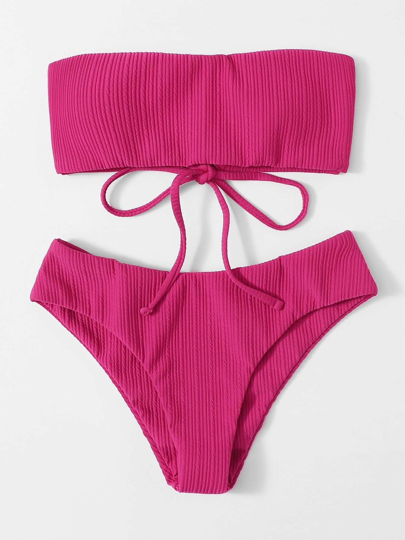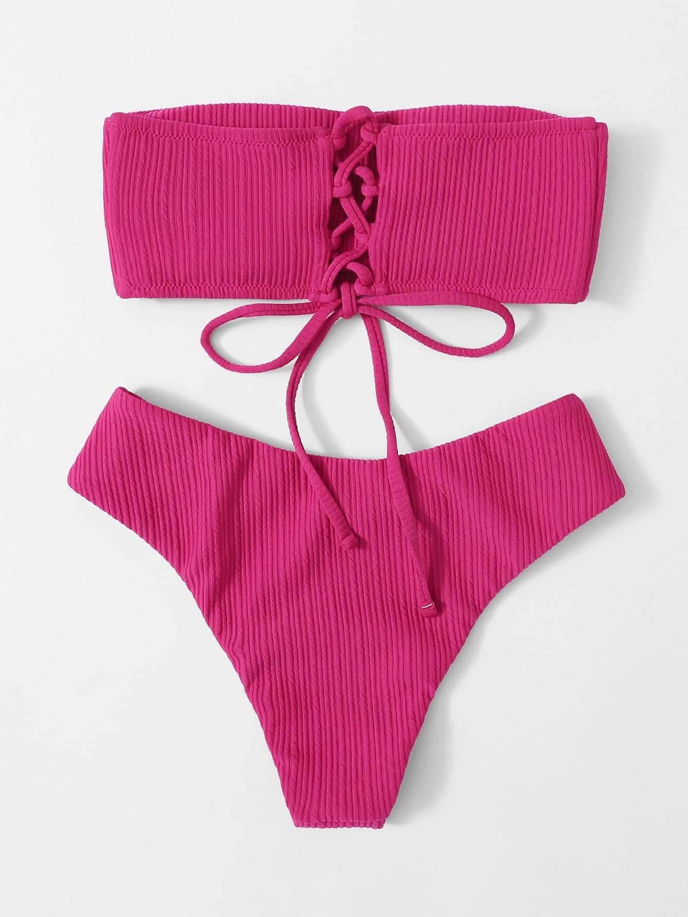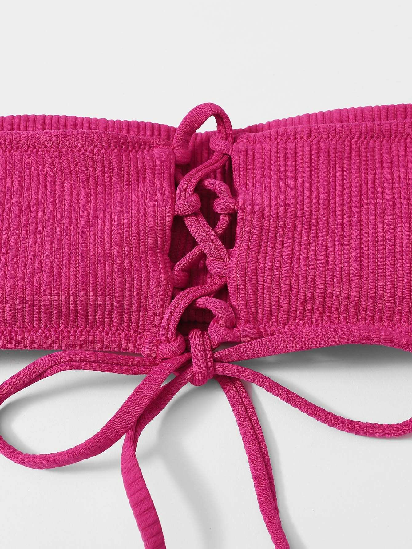 Textured Lace-up Back Bandeau Bikini Swimsuit