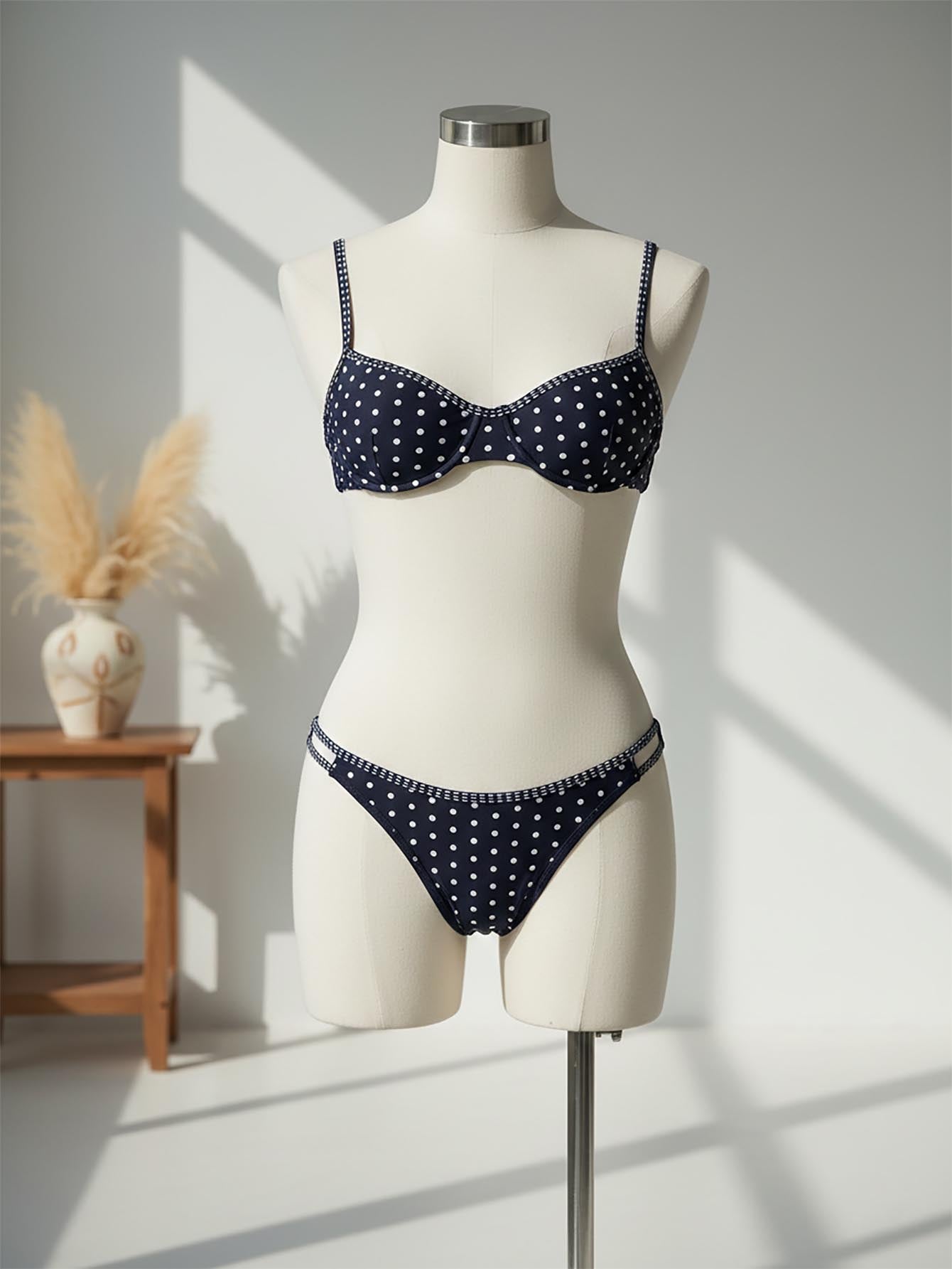 2pcs/Set Women Black & White Polka Dot High Cut Side Thong Bikini Swimsuit Set