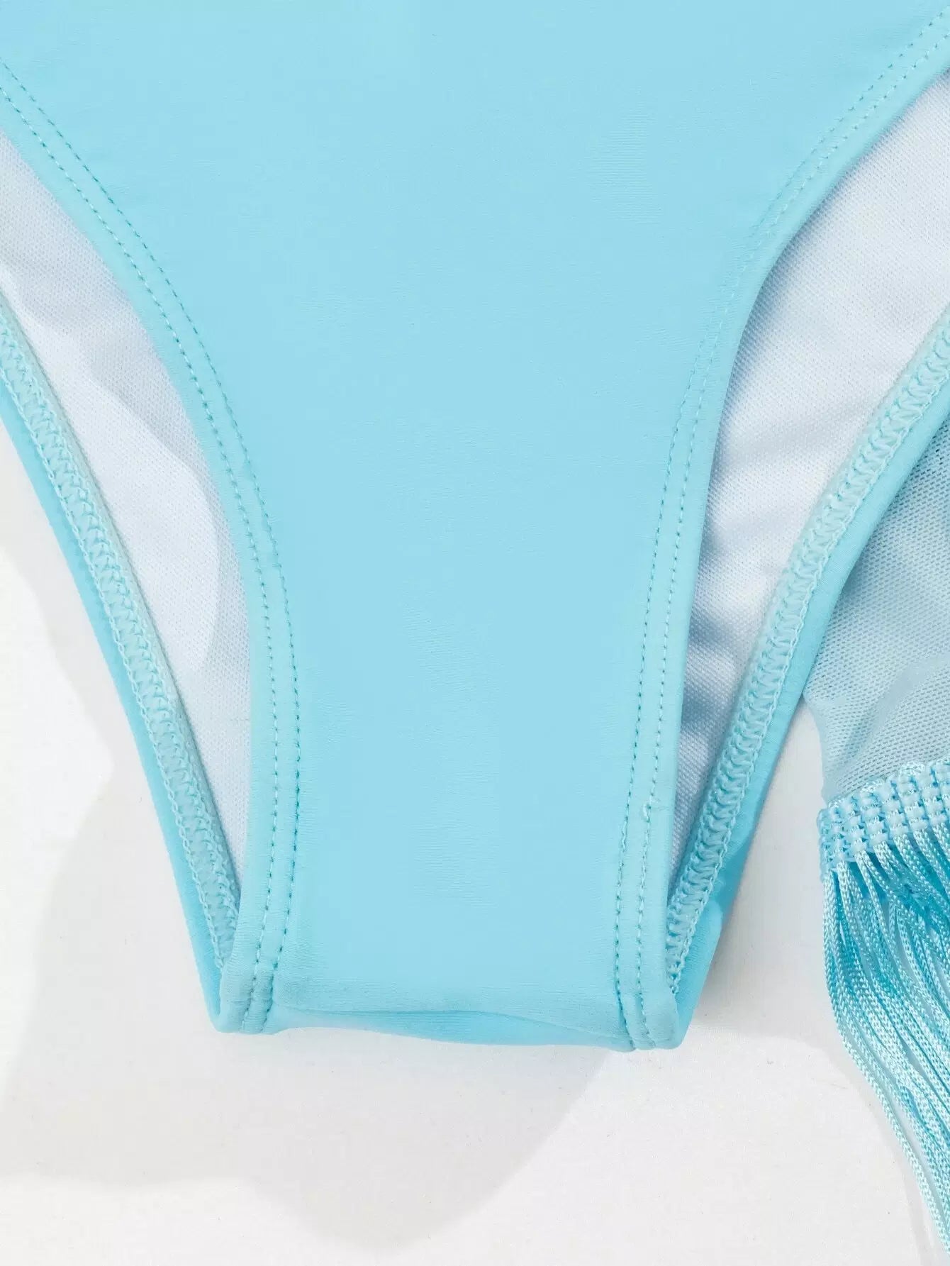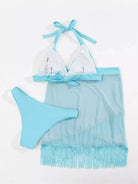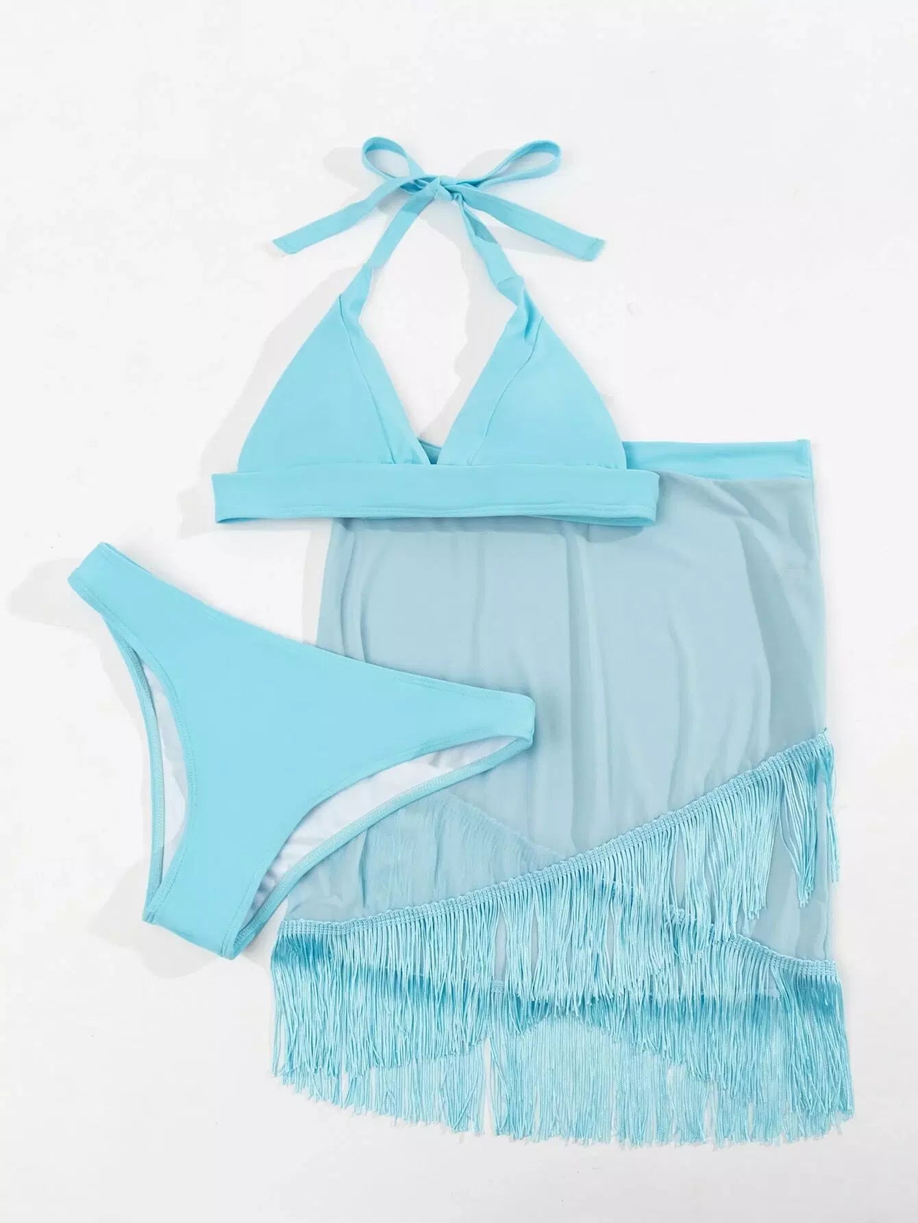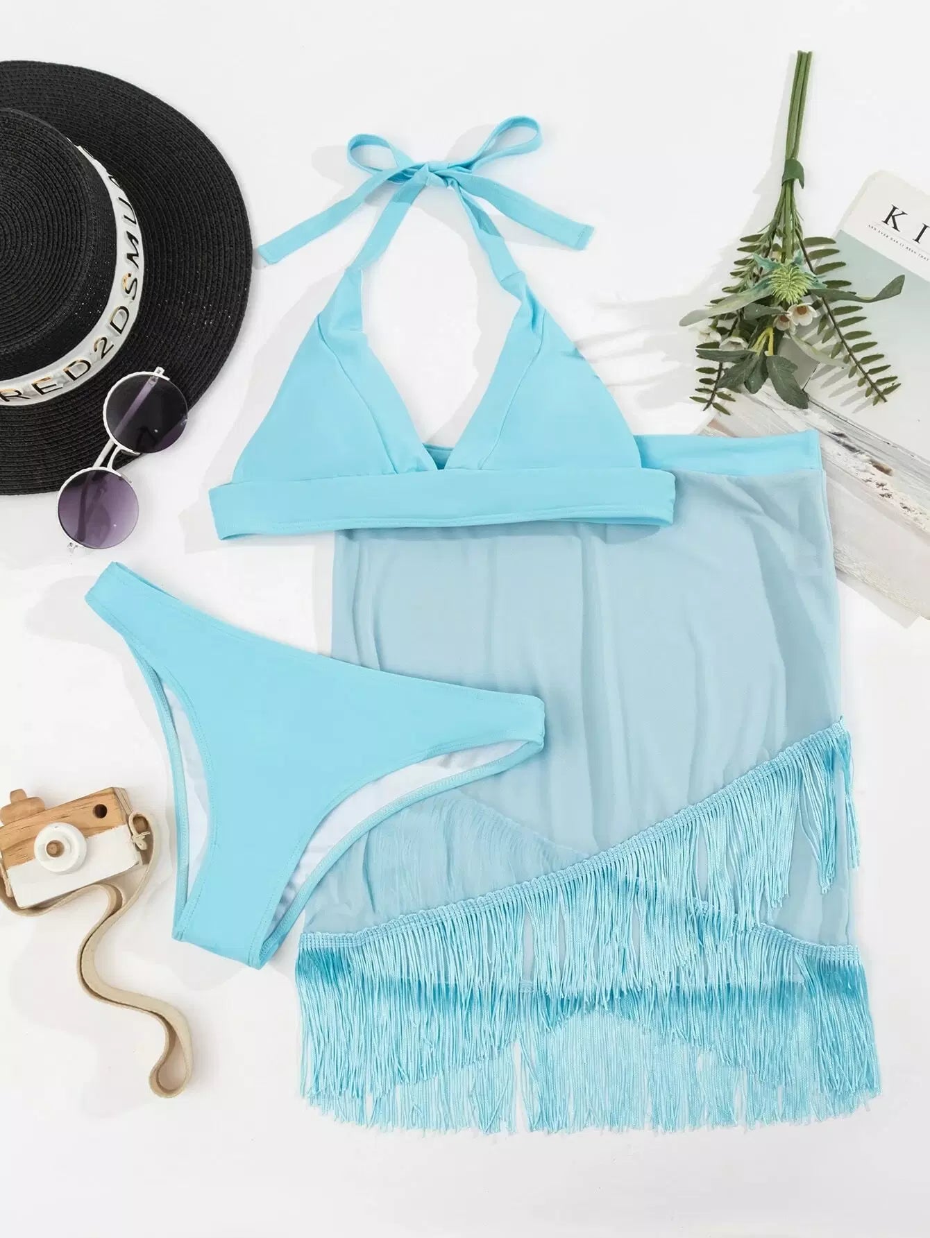 3pack Halter Triangle Bikini Swimsuit & Fringe Hem Beach Skirt