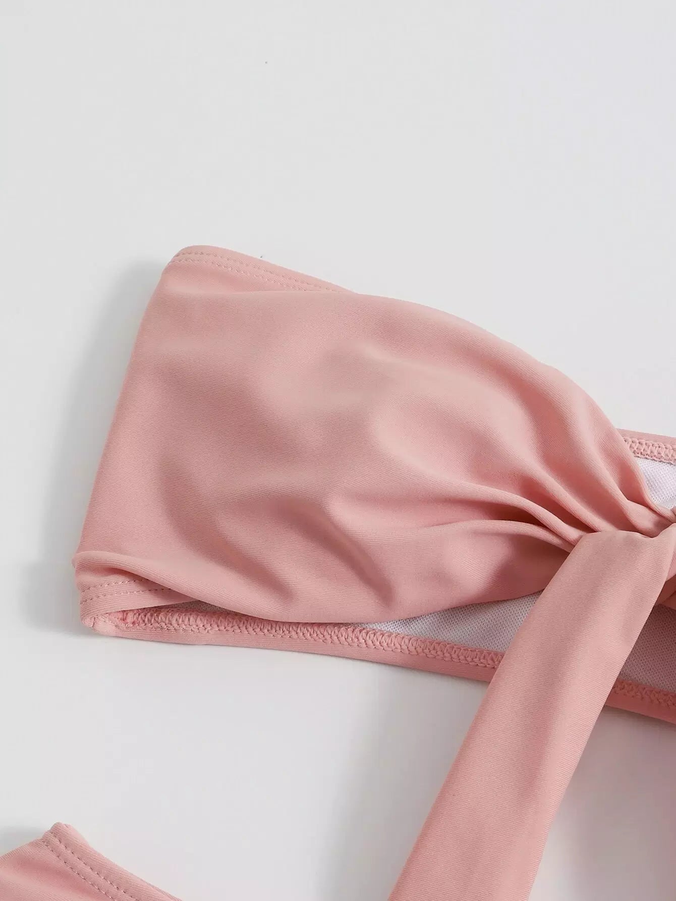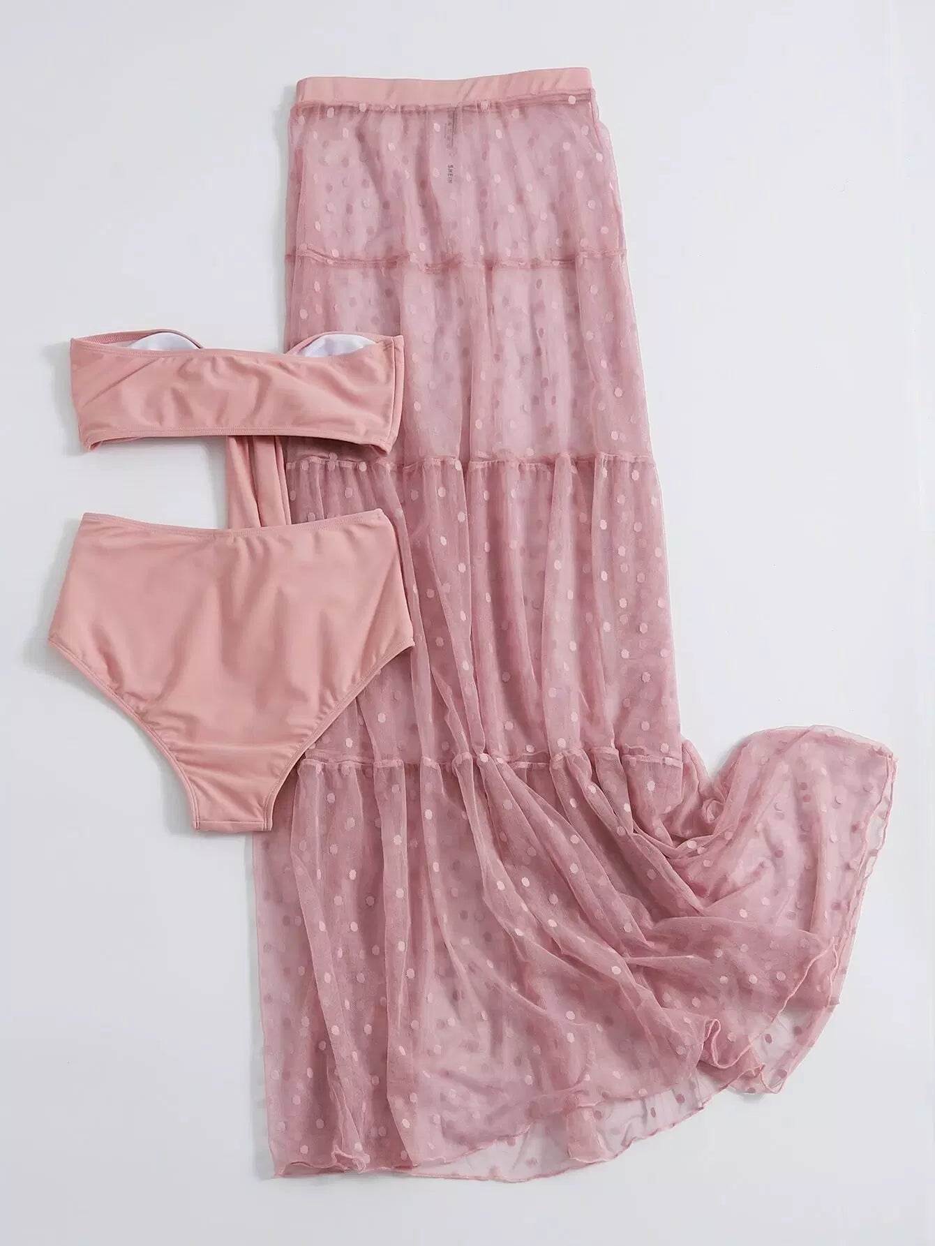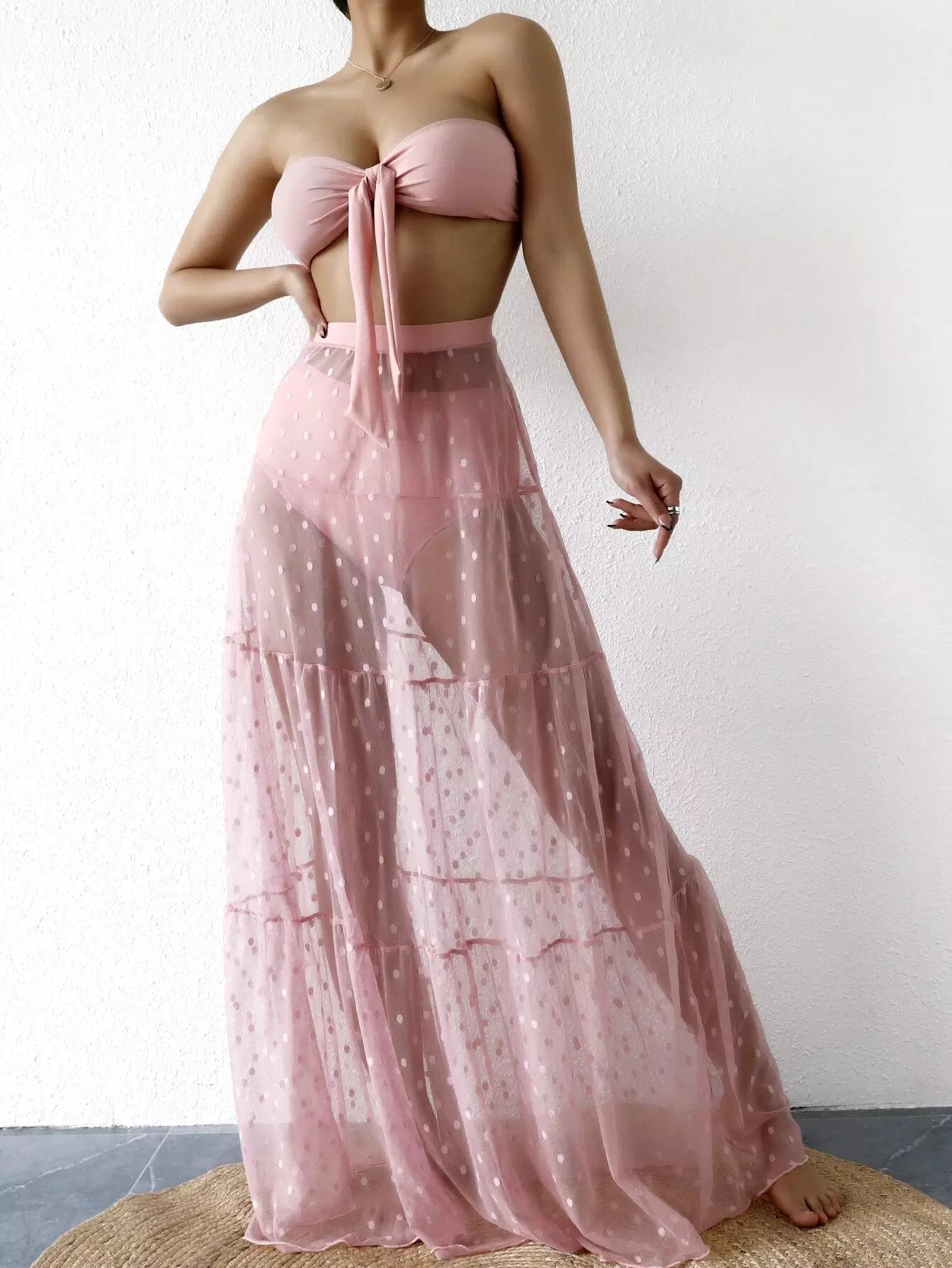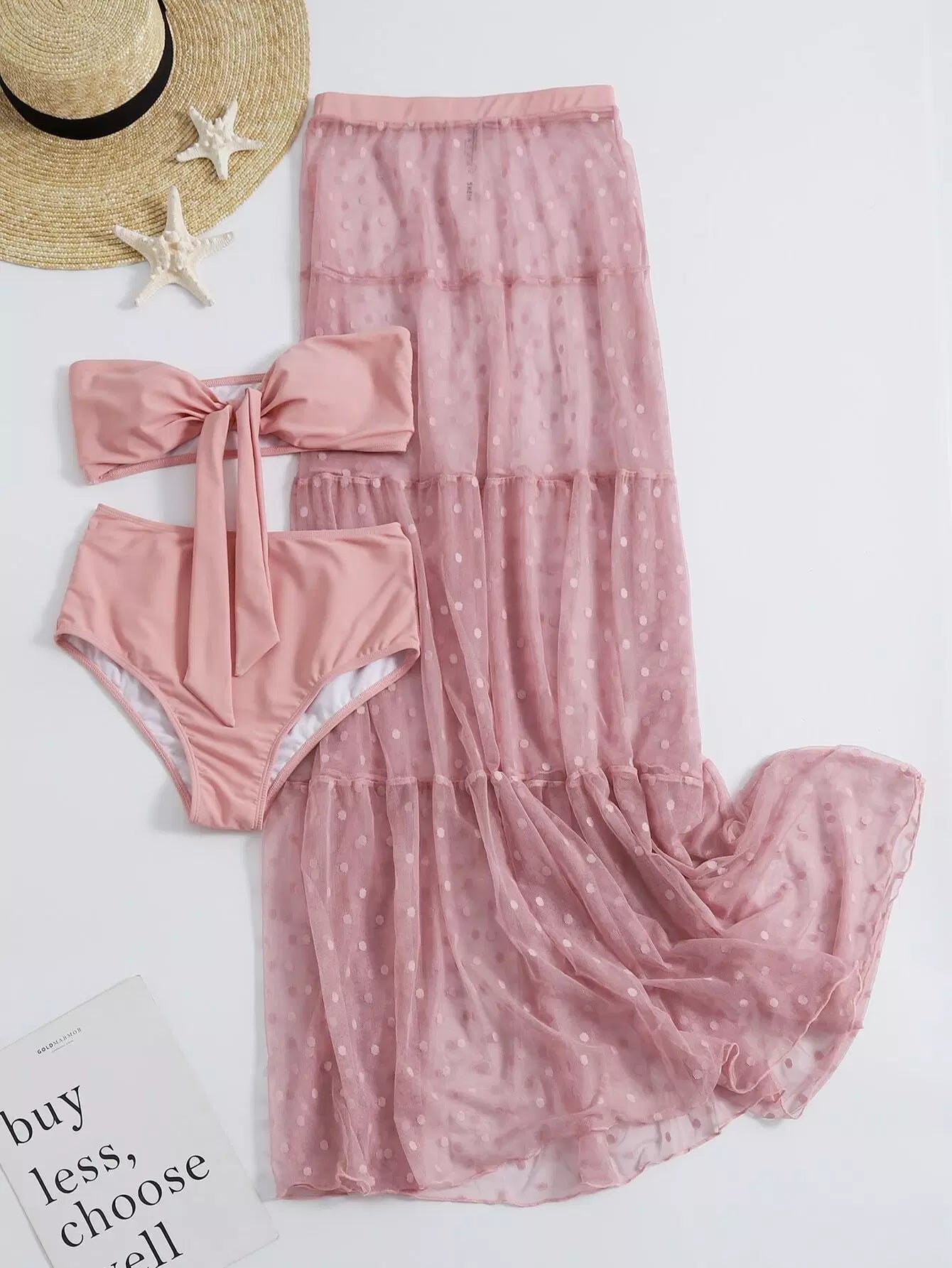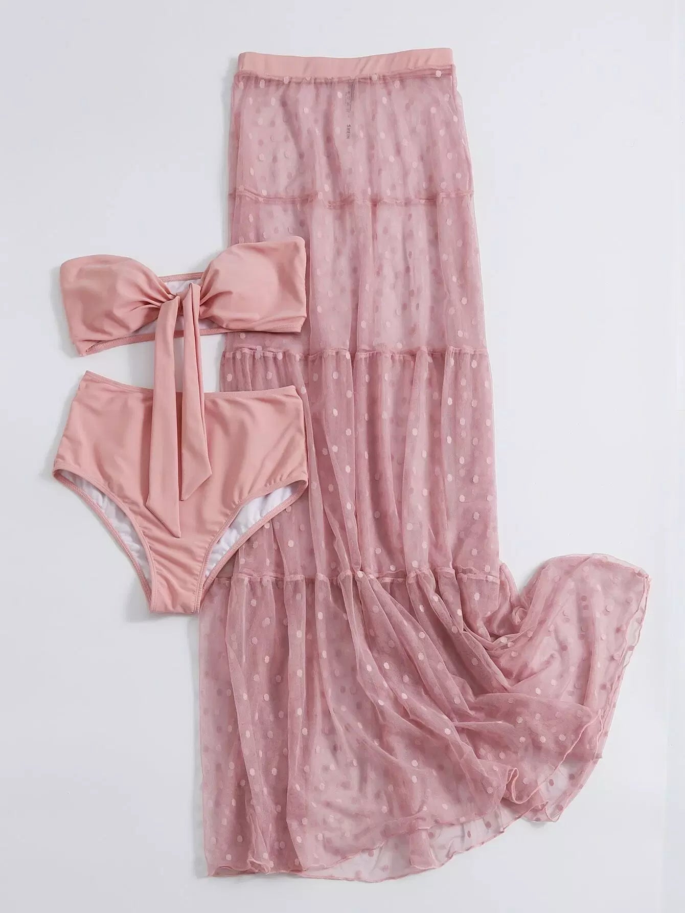 3pack Knot Front Bandeau Bikini Swimsuit & Dobby Mesh Cover Up